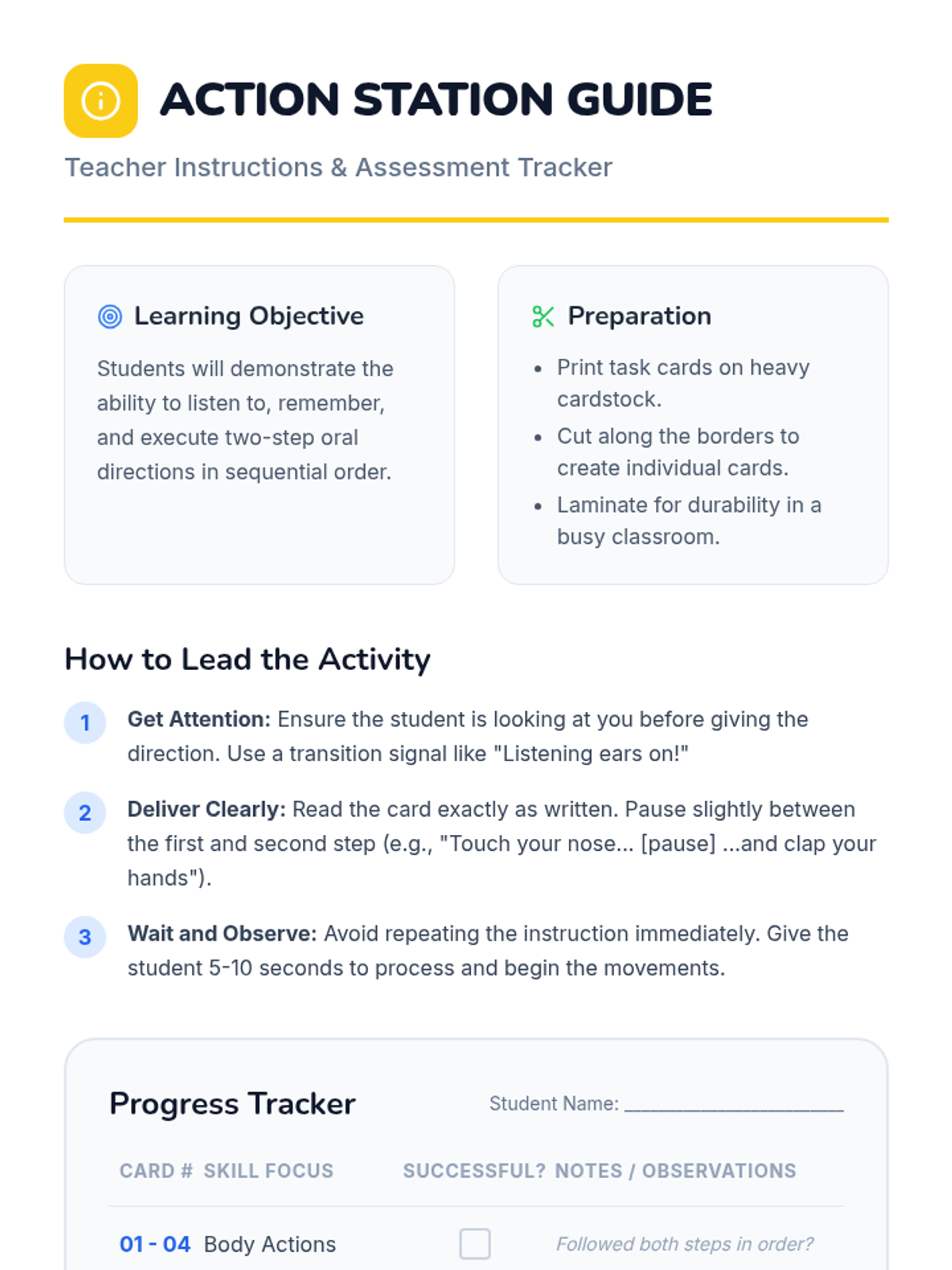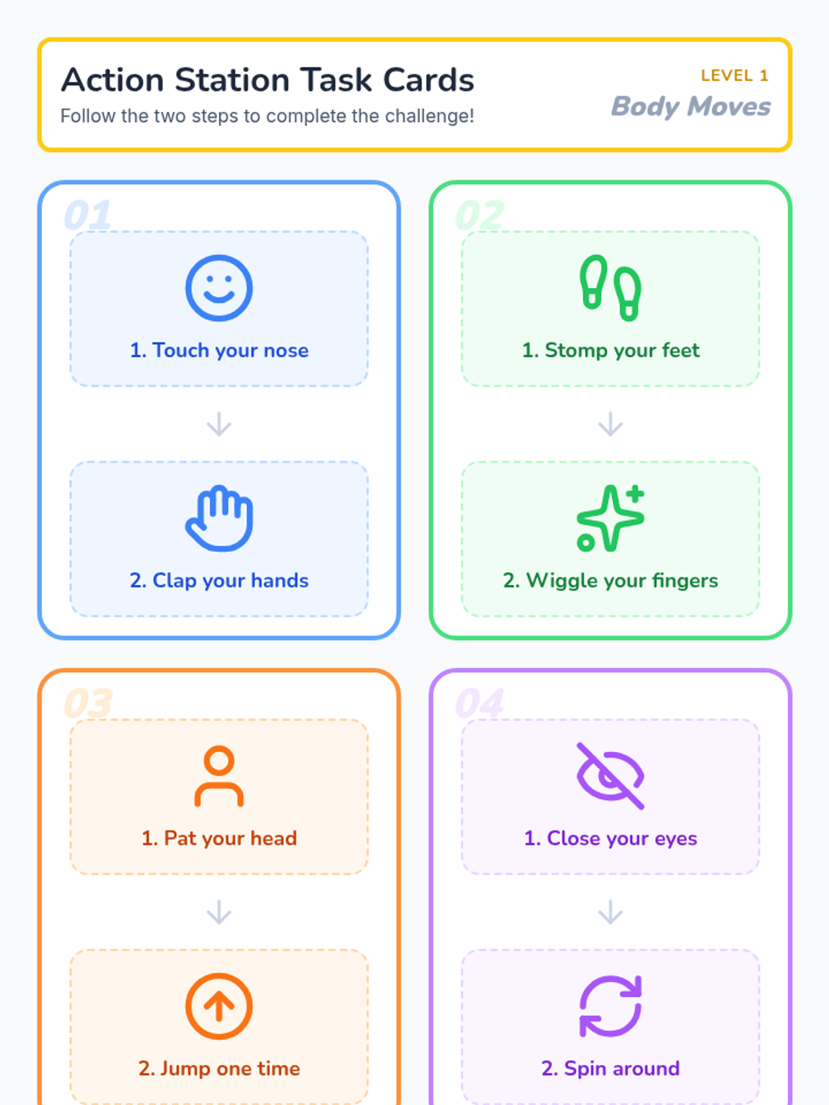 A fun, movement-based lesson for preschoolers to practice listening and following two-step instructions through interactive task cards.
