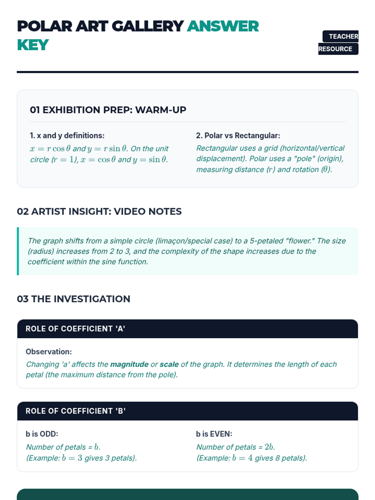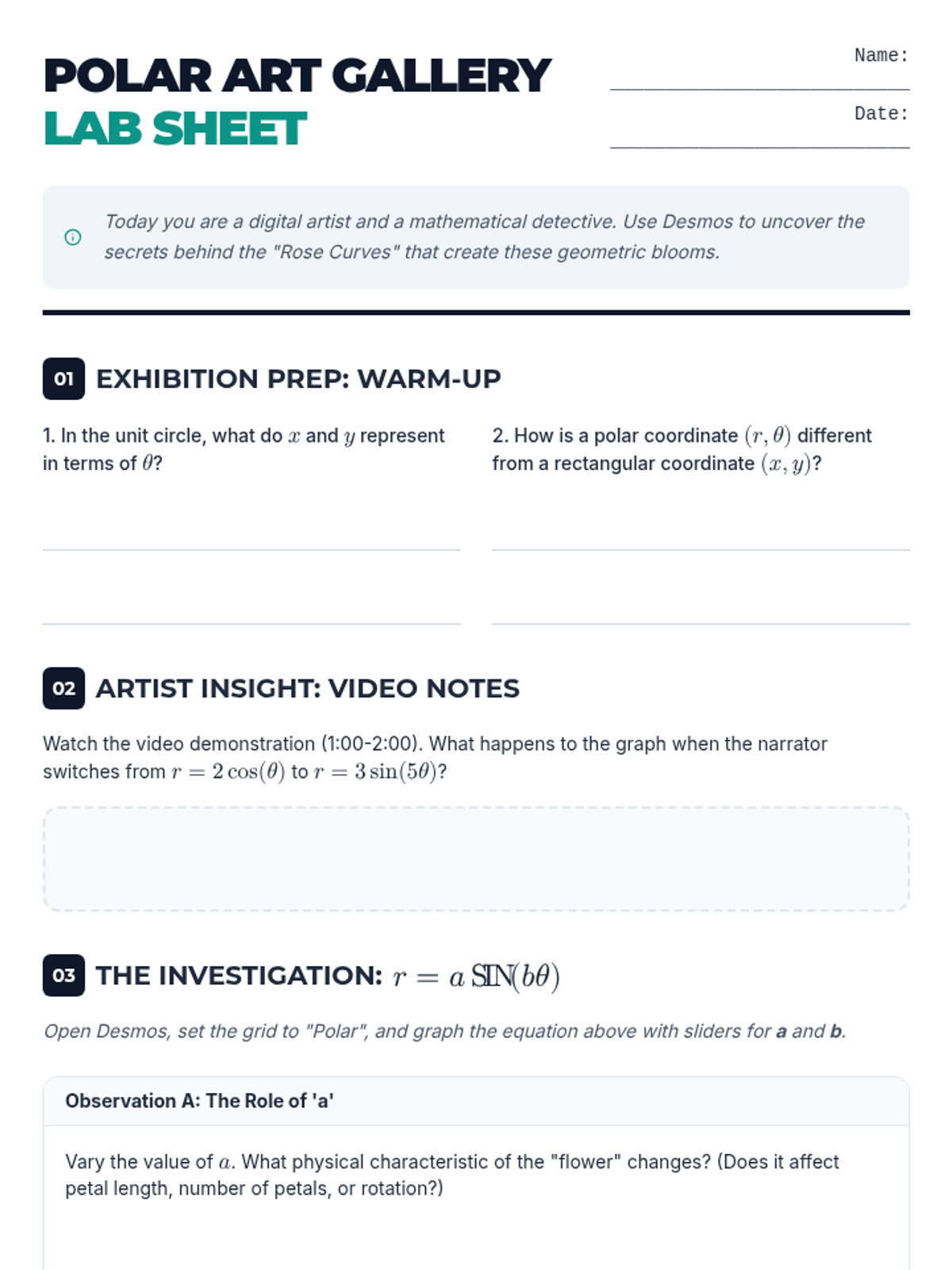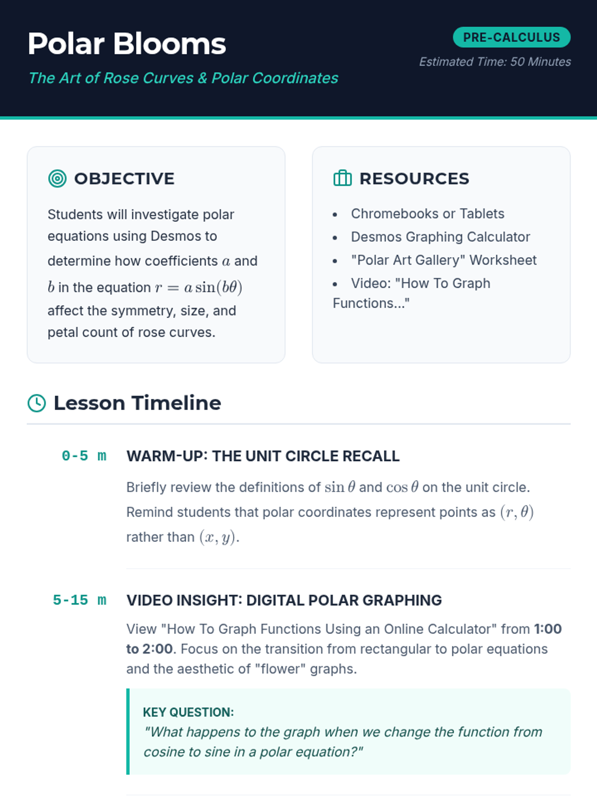 A Pre-Calculus lesson exploring polar coordinates and rose curves. Students use Desmos to investigate how coefficients in polar equations transform the number and size of petals in 'flower' graphs.