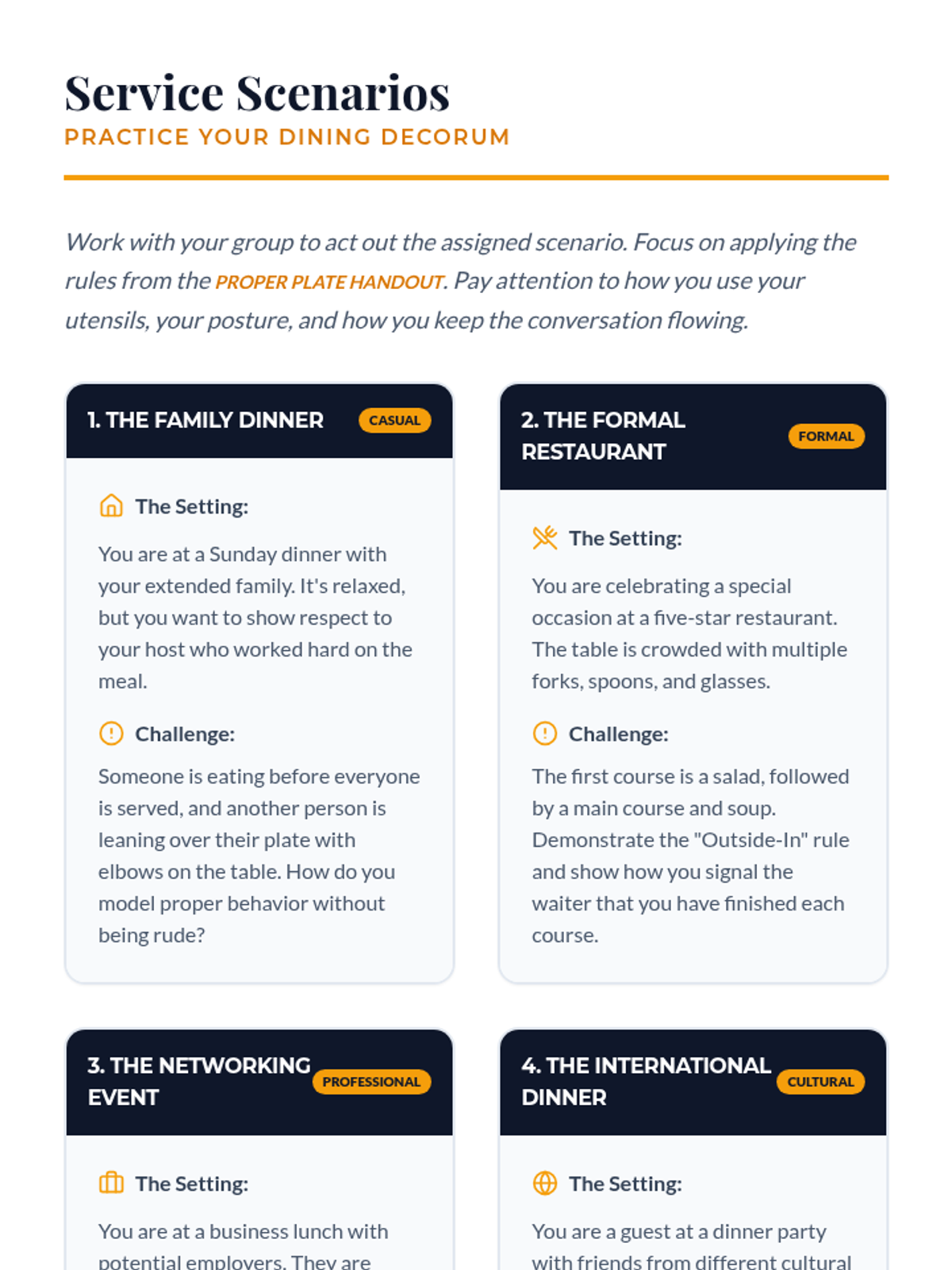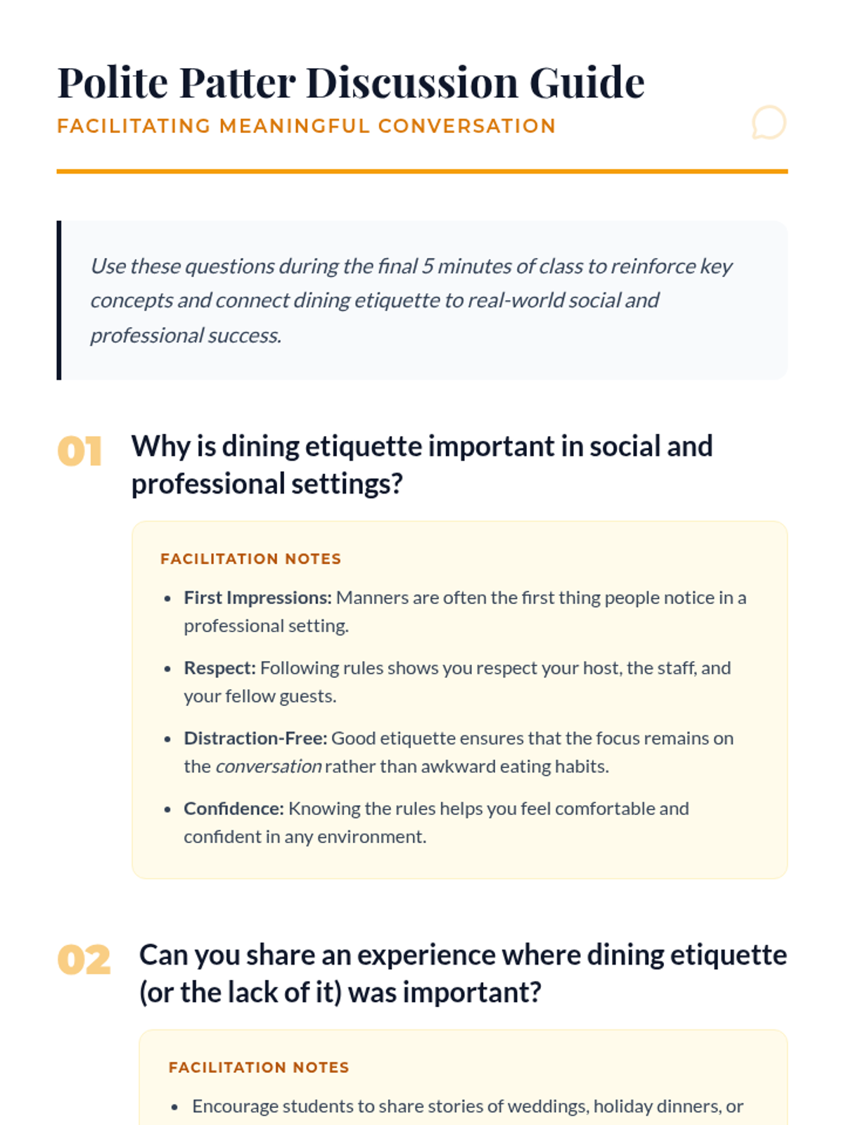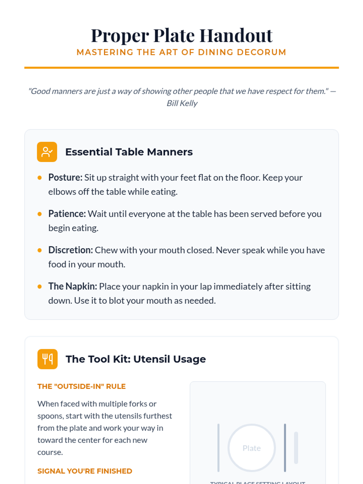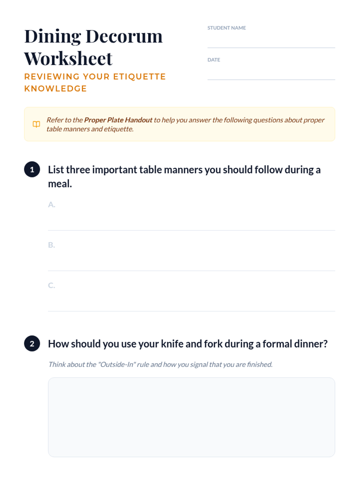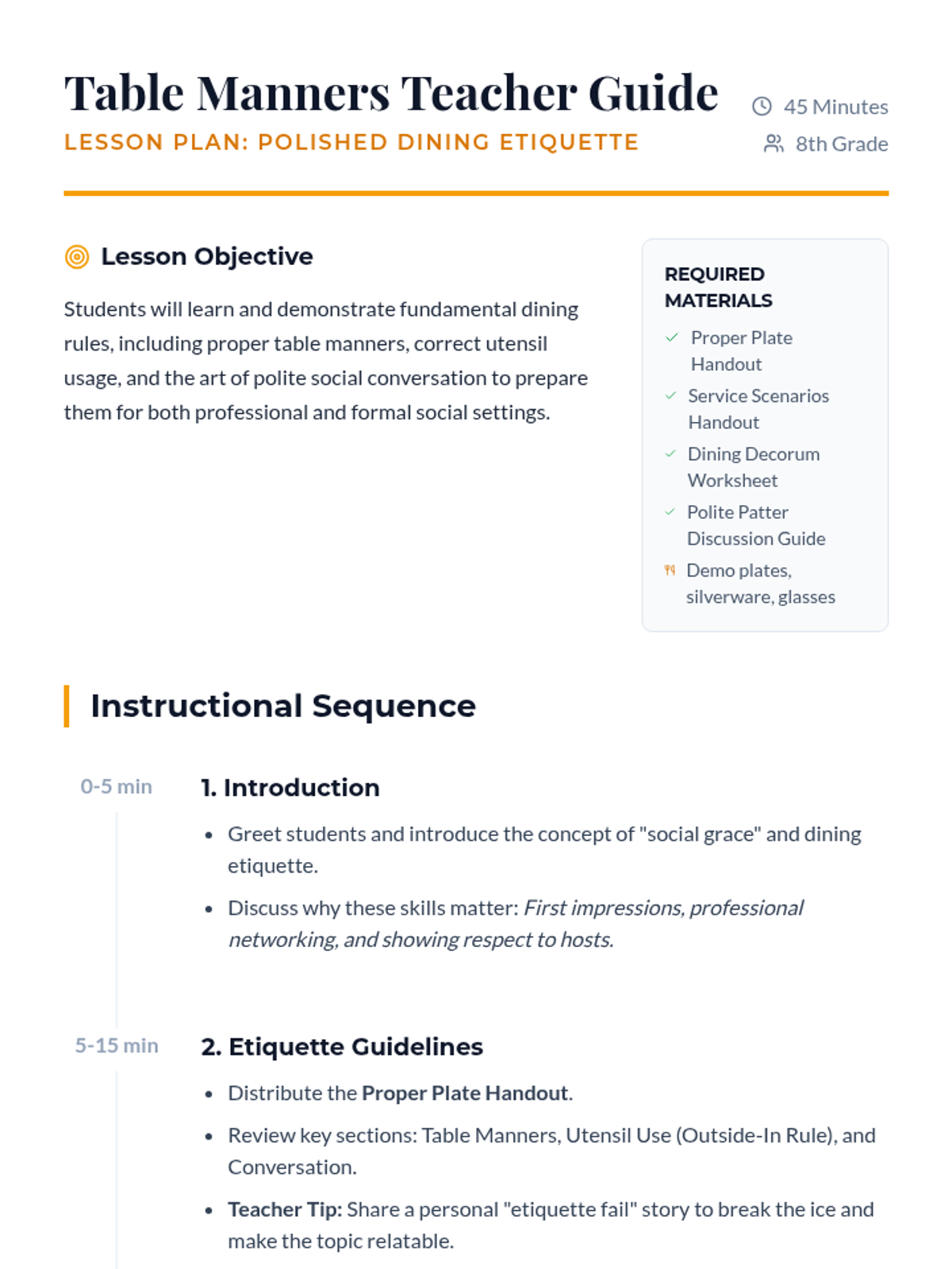 A comprehensive lesson on dining etiquette for 8th graders, covering table manners, utensil usage, and the art of polite conversation in social and professional settings.
