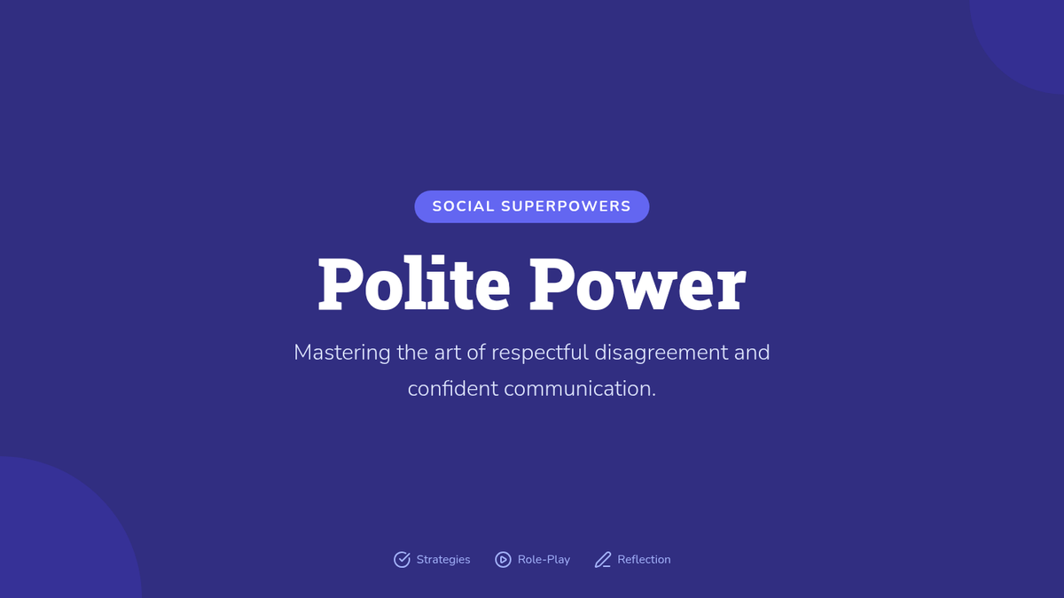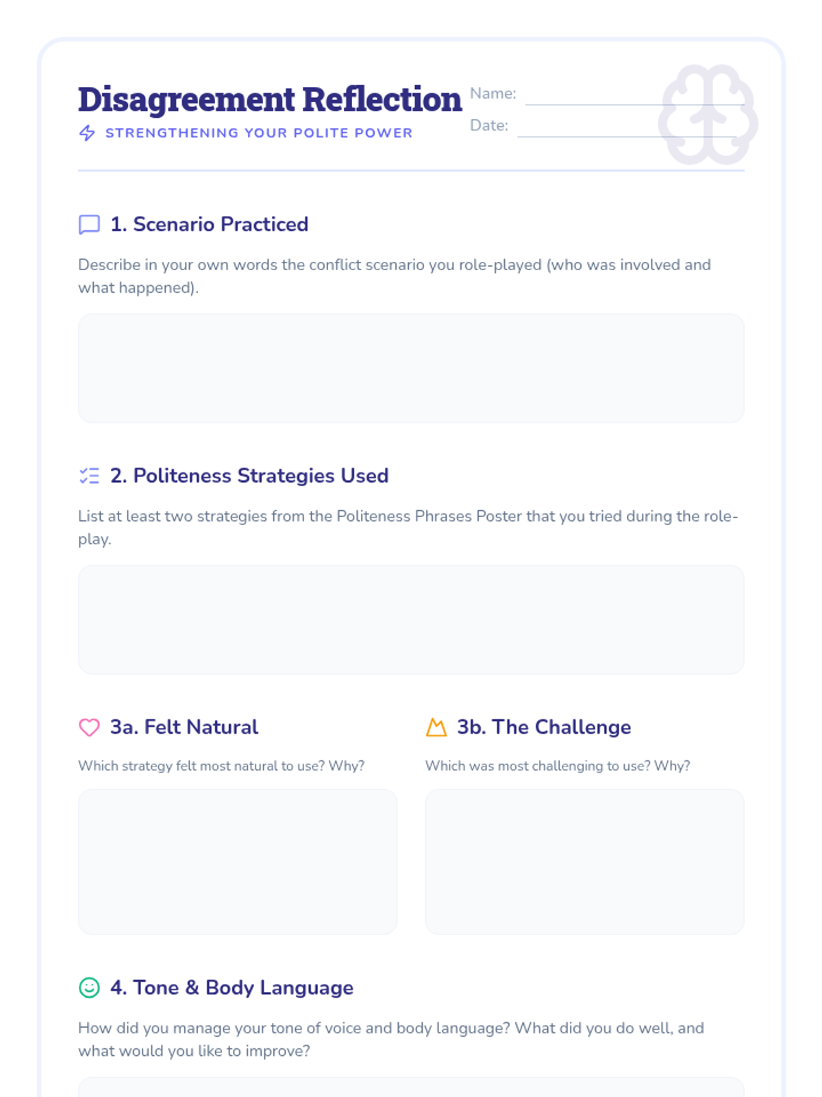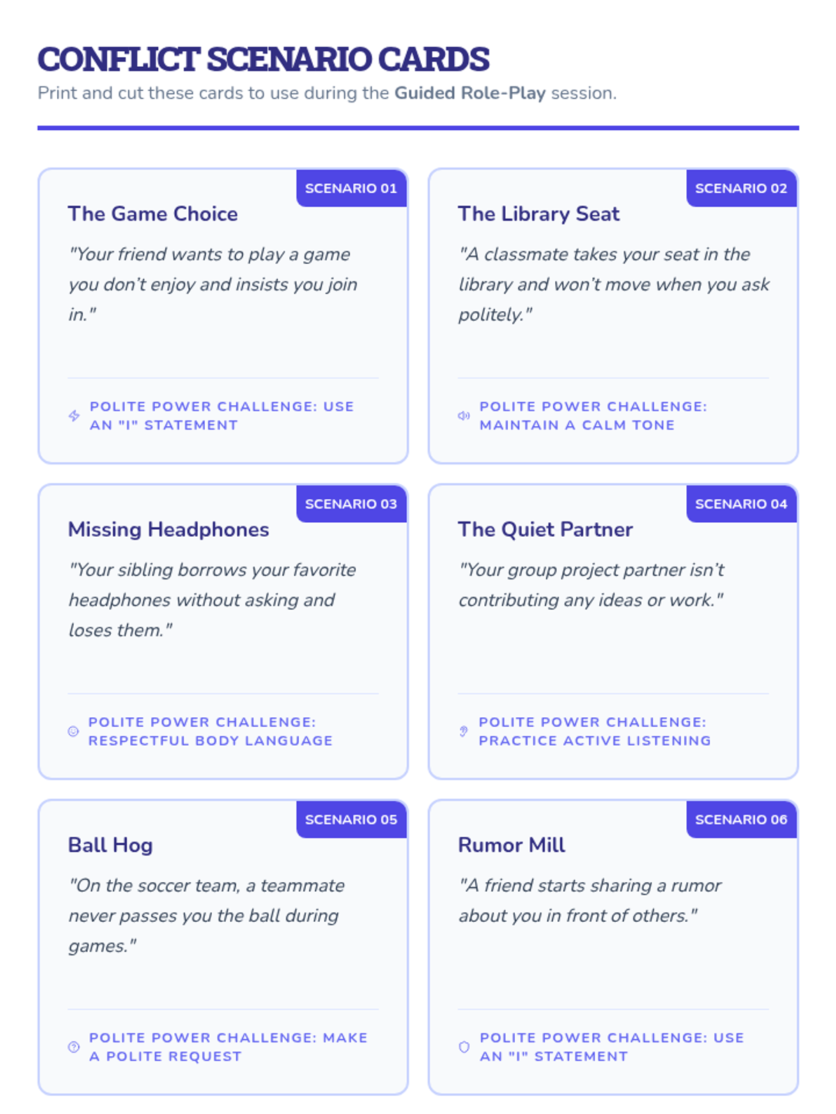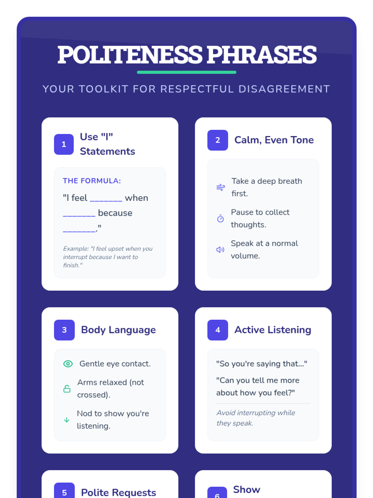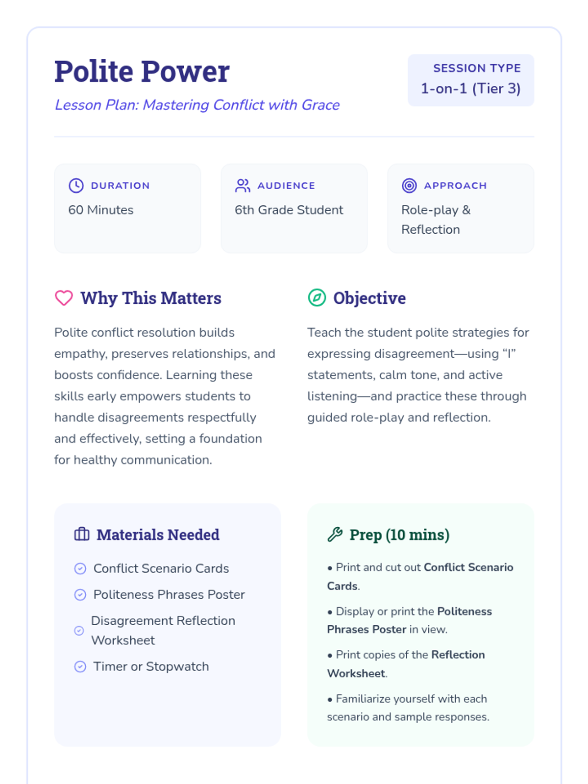 A one-hour individual session for 6th-grade students to master the art of polite disagreement, focusing on 'I' statements, calm tones, and active listening.