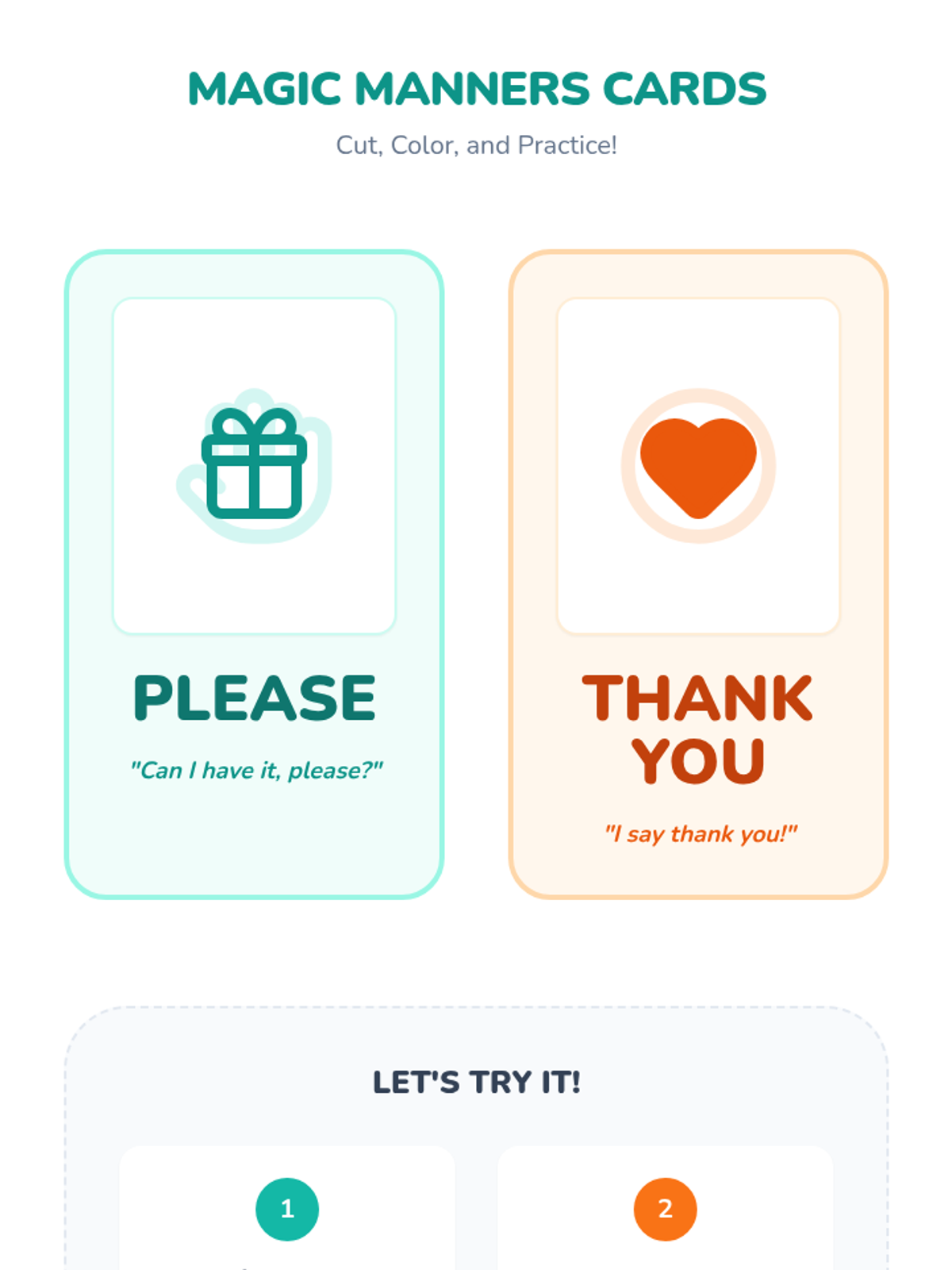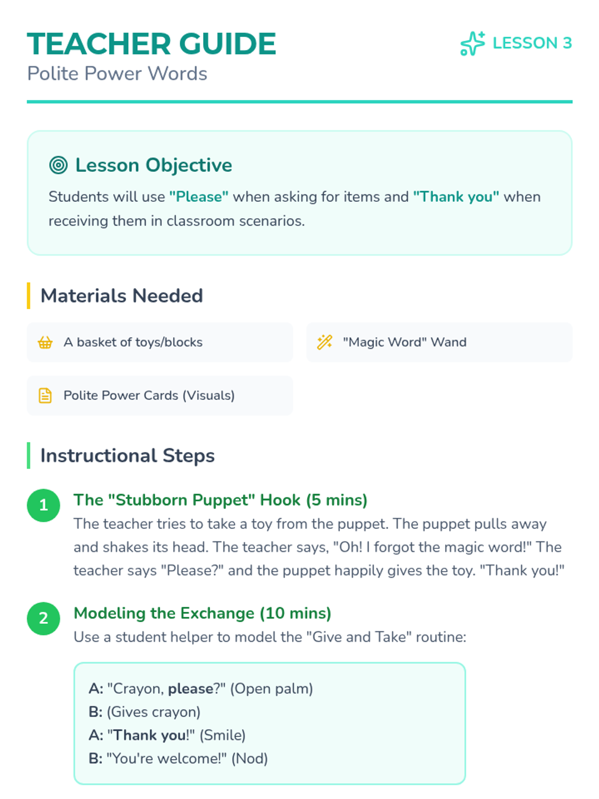 Introduces the 'magic words' Please and Thank You through role-play scenarios involving sharing and helping in the classroom.