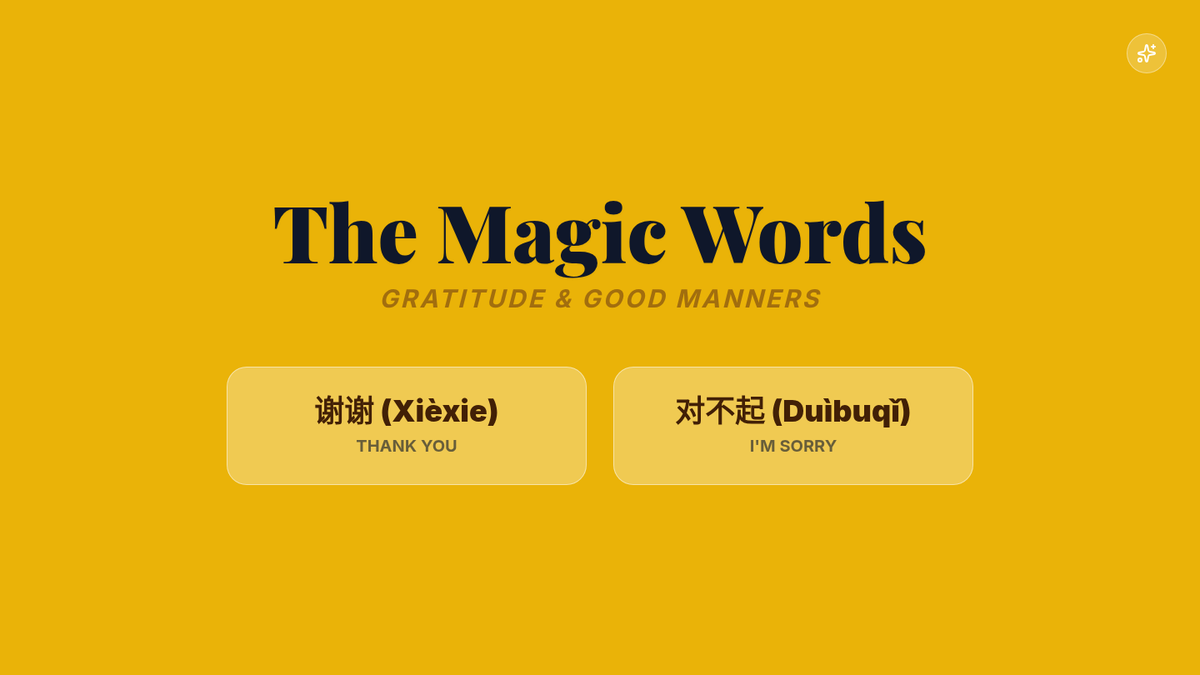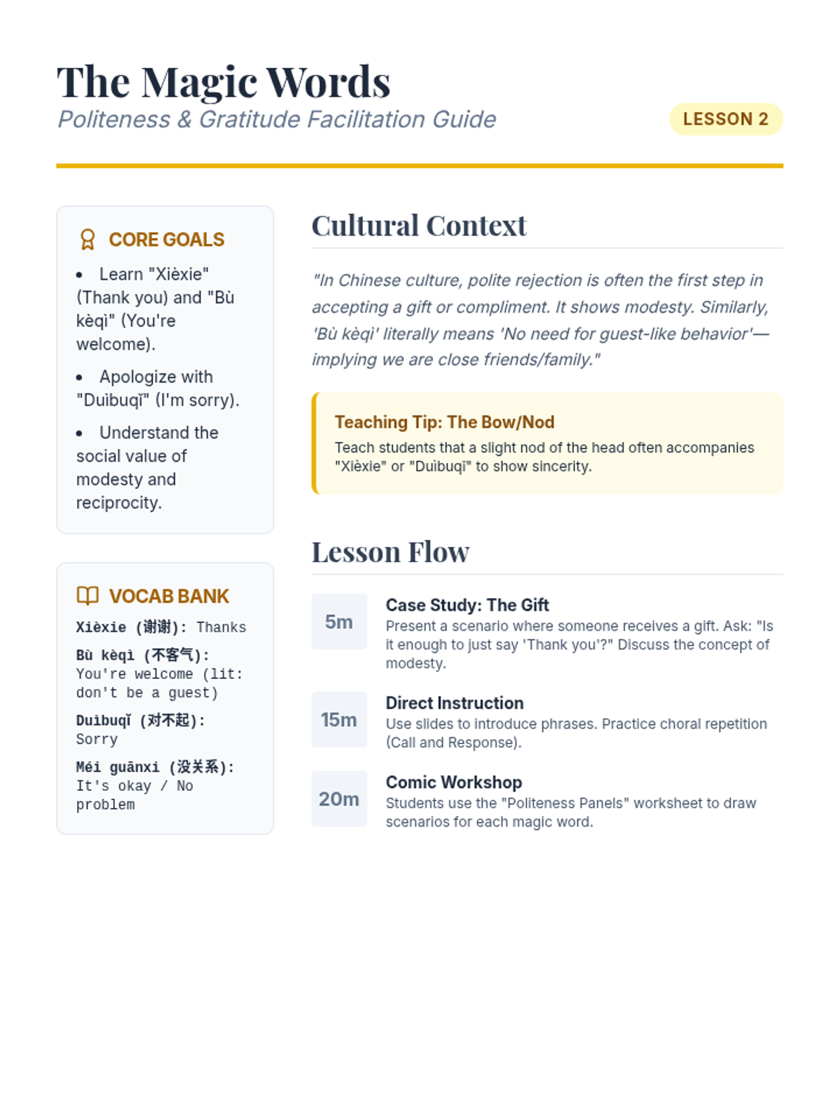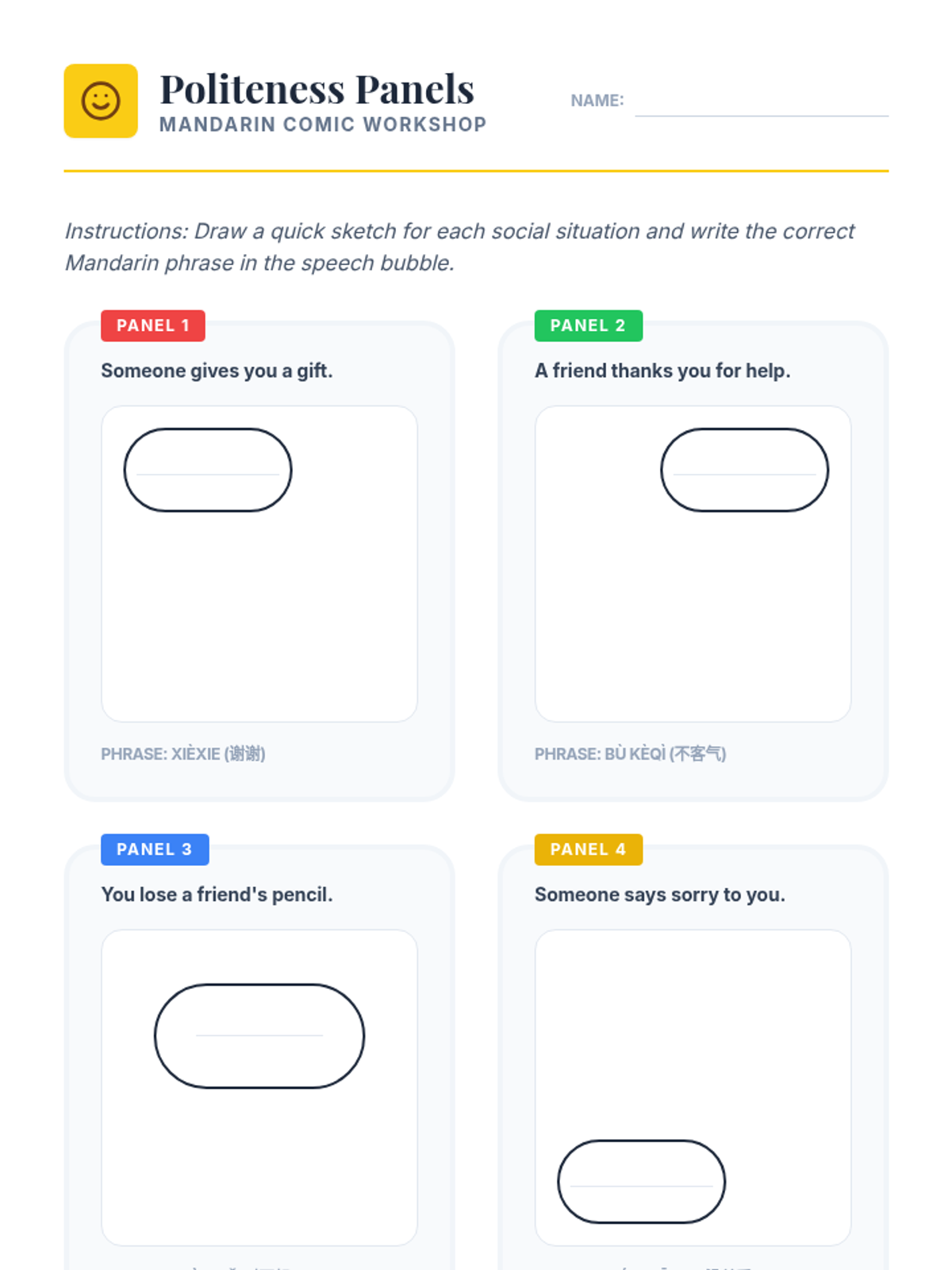Teaches the essential 'magic words' of Mandarin—thank you, you're welcome, and sorry—through creative comic strip scenarios.