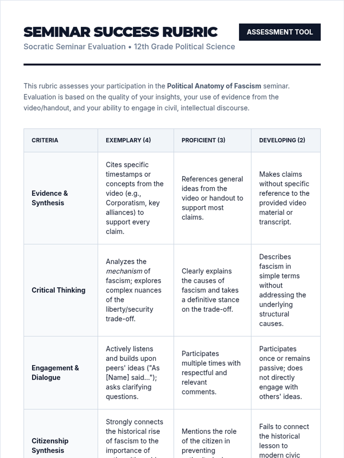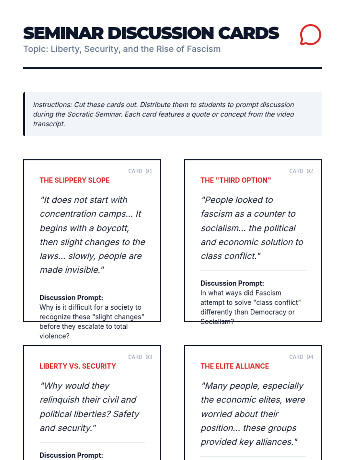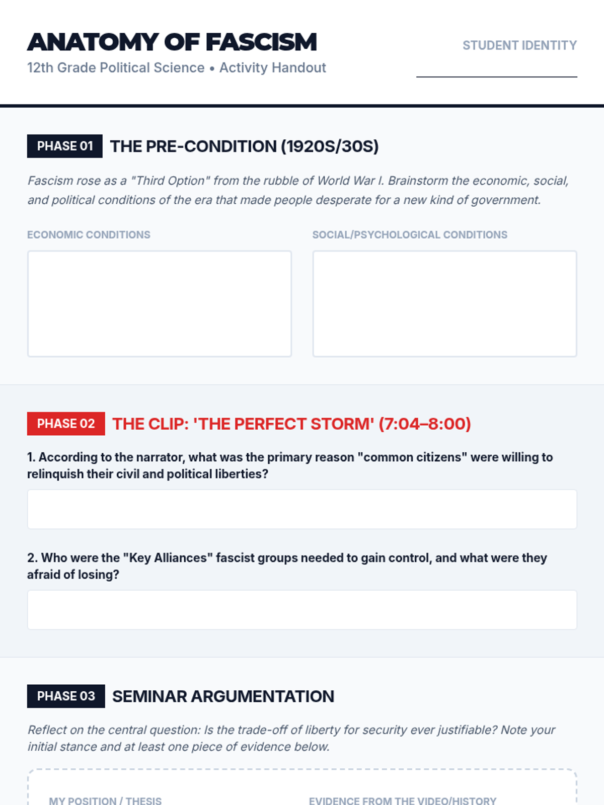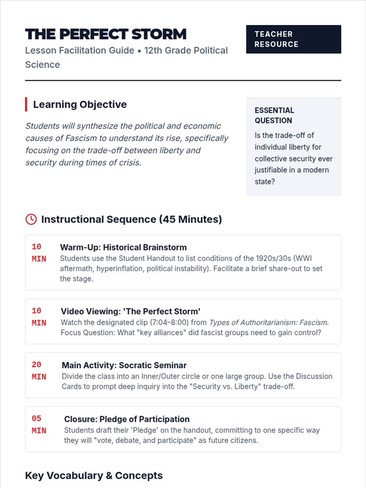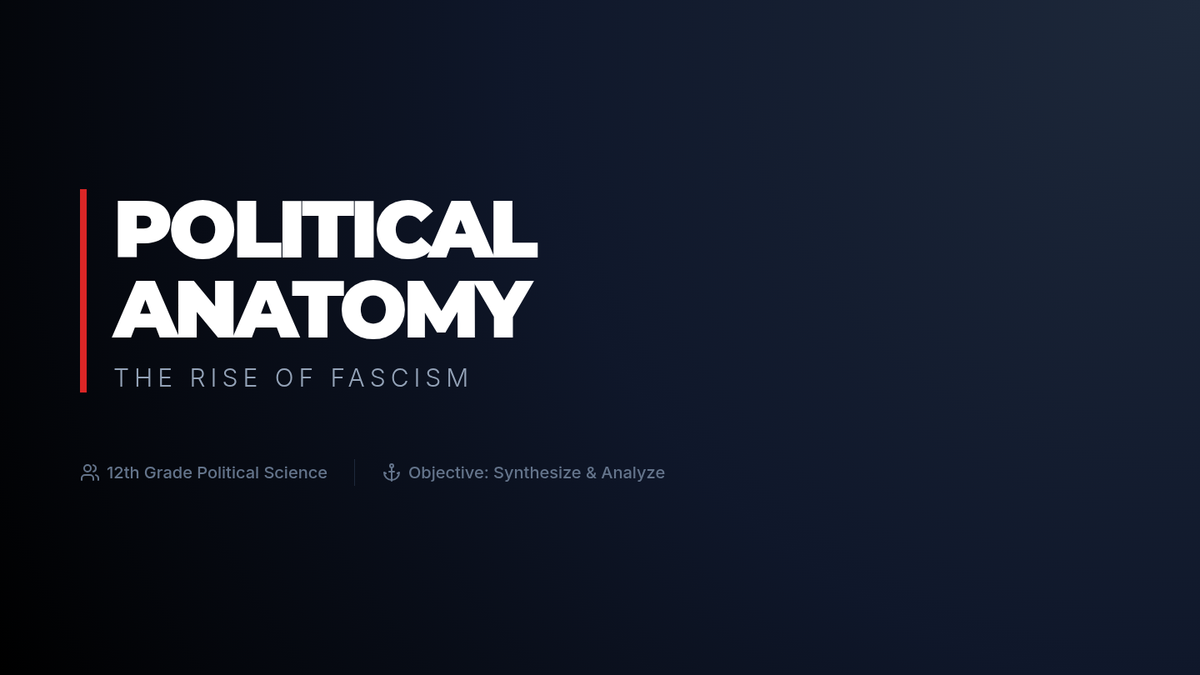 Students will analyze the political and economic conditions of the 1920s and 30s to understand how fascist regimes rose to power by offering security in exchange for liberty. The lesson culminates in a Socratic Seminar and a personal 'Pledge of Participation'.