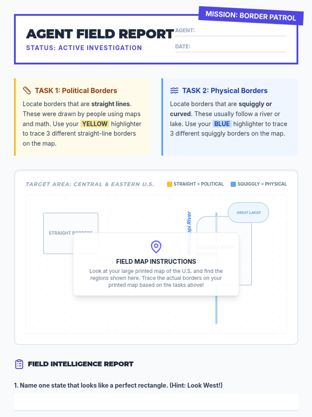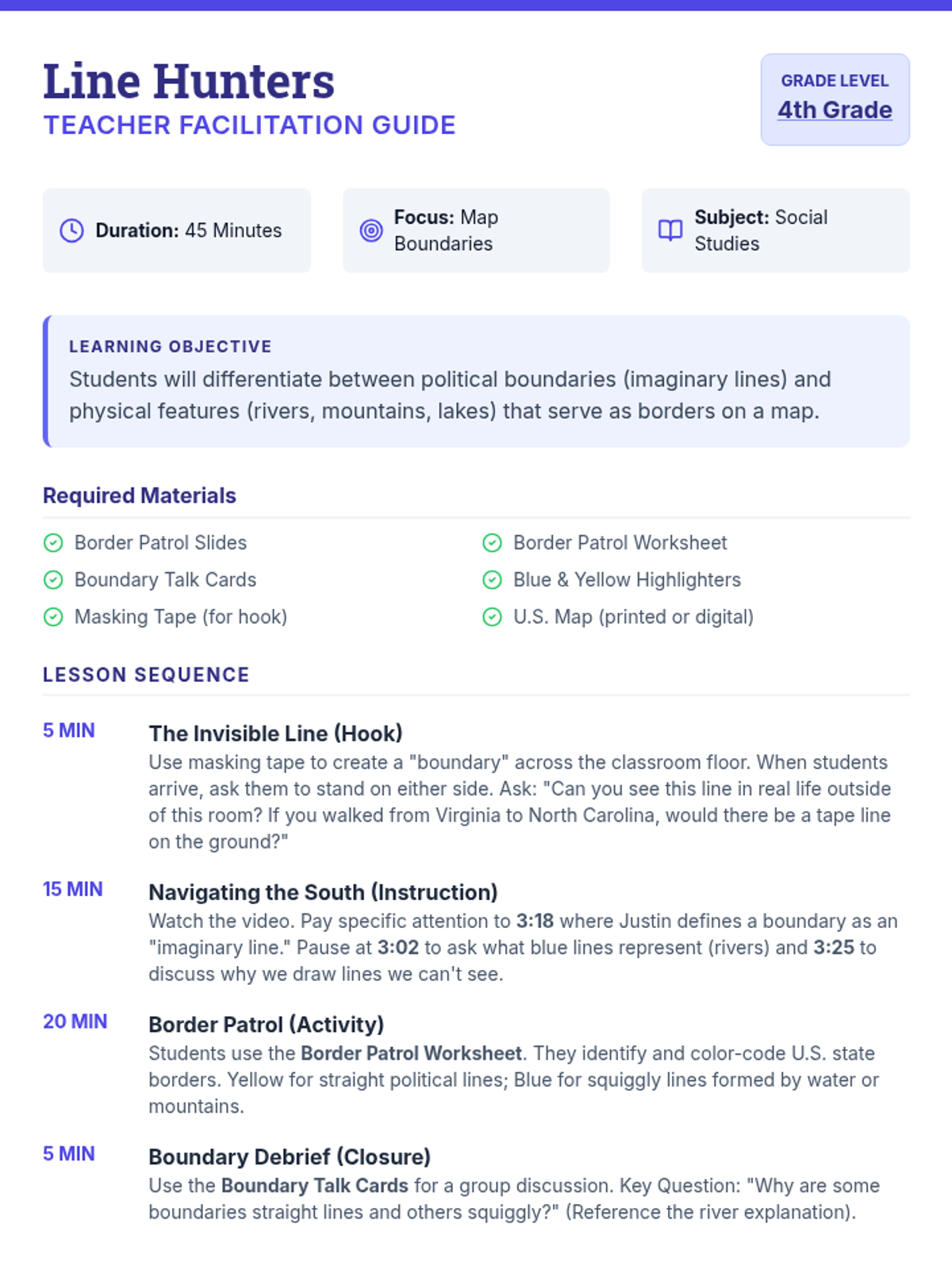 Students will learn to differentiate between political boundaries and physical features by analyzing U.S. state borders, watching a guided video on map symbols, and completing a color-coding map activity.