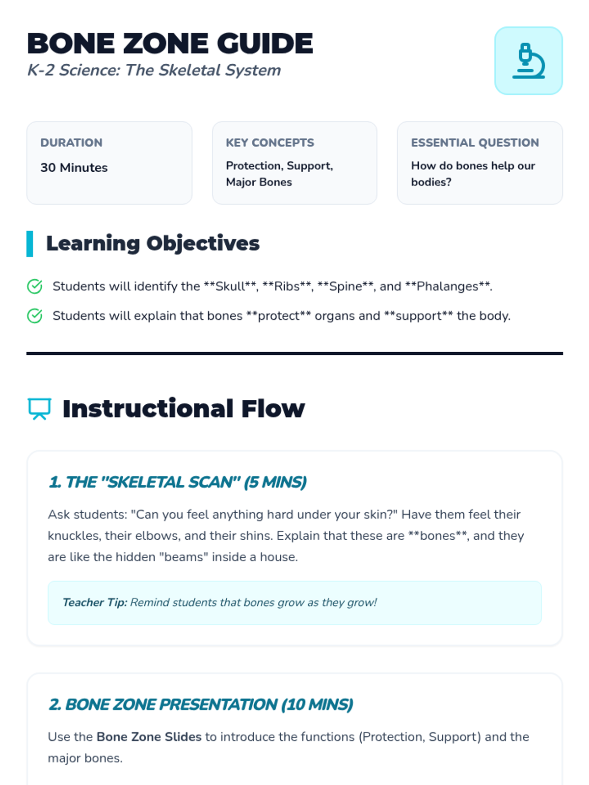 A quick 30-minute introduction to the skeletal system, focusing on its main functions and the names of key bones in the human body. Students will explore how their 'internal frame' helps them move and stay protected.