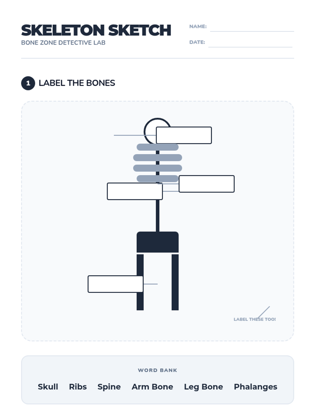An introductory lesson for K-2 students focusing on the major bones of the human body and their primary functions through movement and visual labeling.