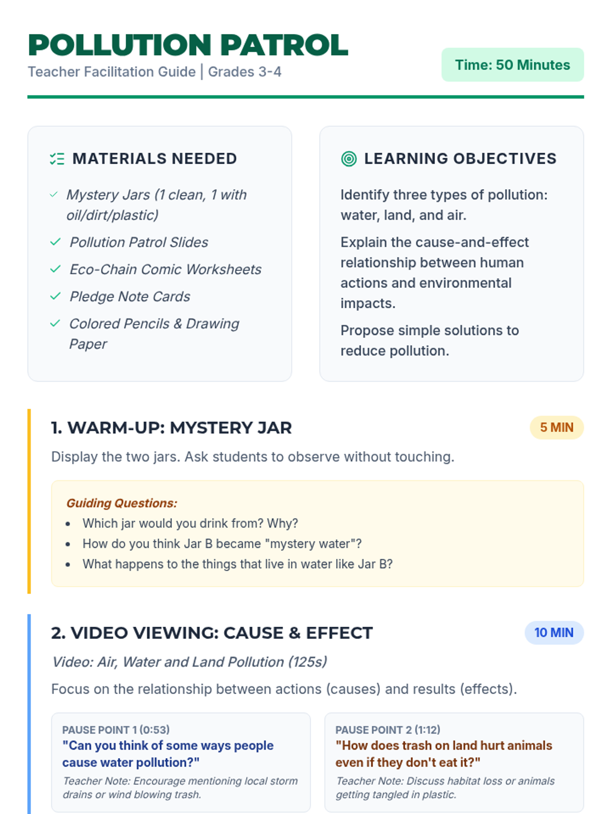 An interactive lesson for 3rd and 4th graders exploring the causes and effects of water, land, and air pollution through a mystery jar observation, video analysis, and comic strip creation.