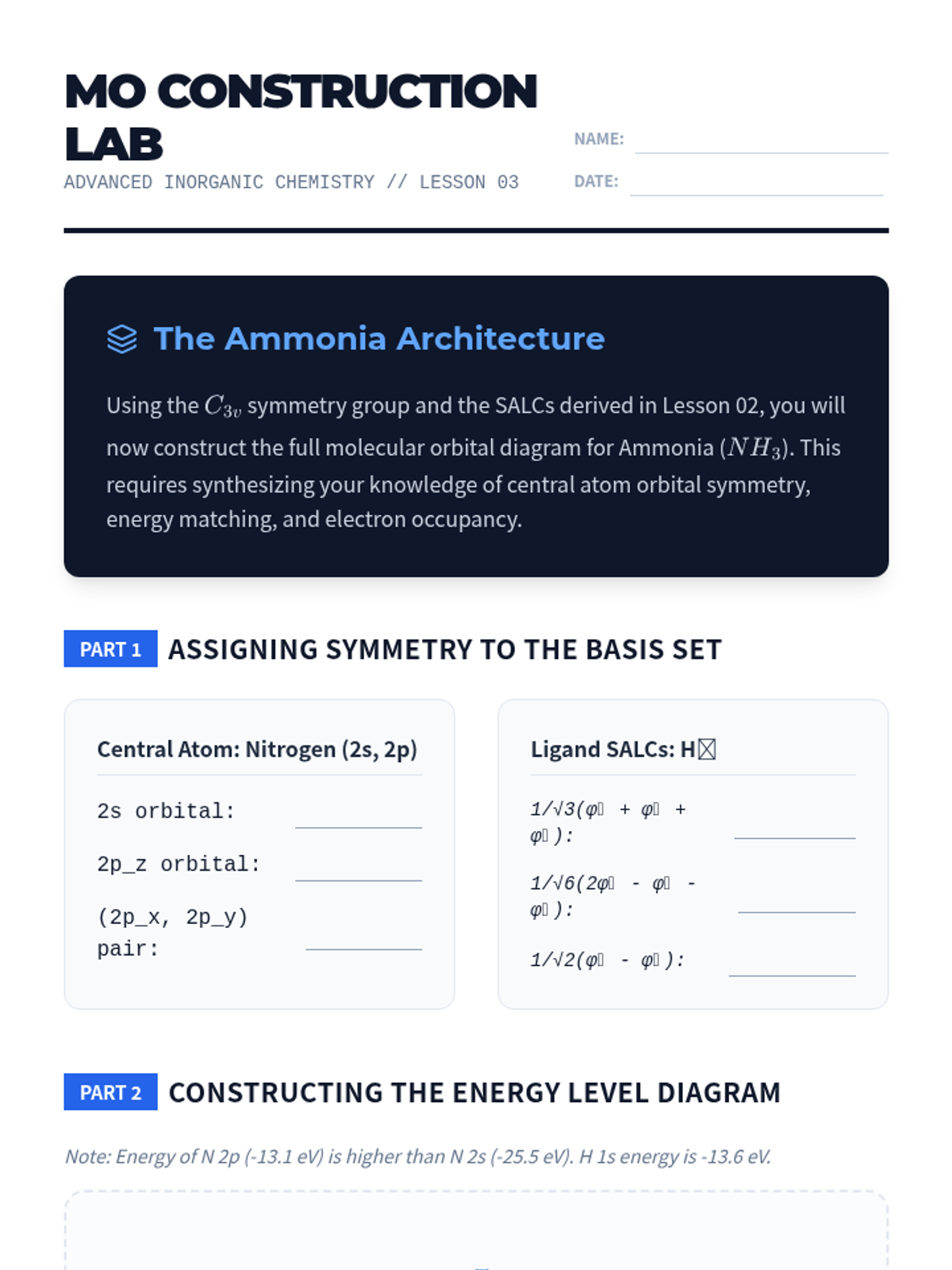 Building full molecular orbital diagrams for polyatomic molecules by combining central atom orbitals with ligand SALCs.