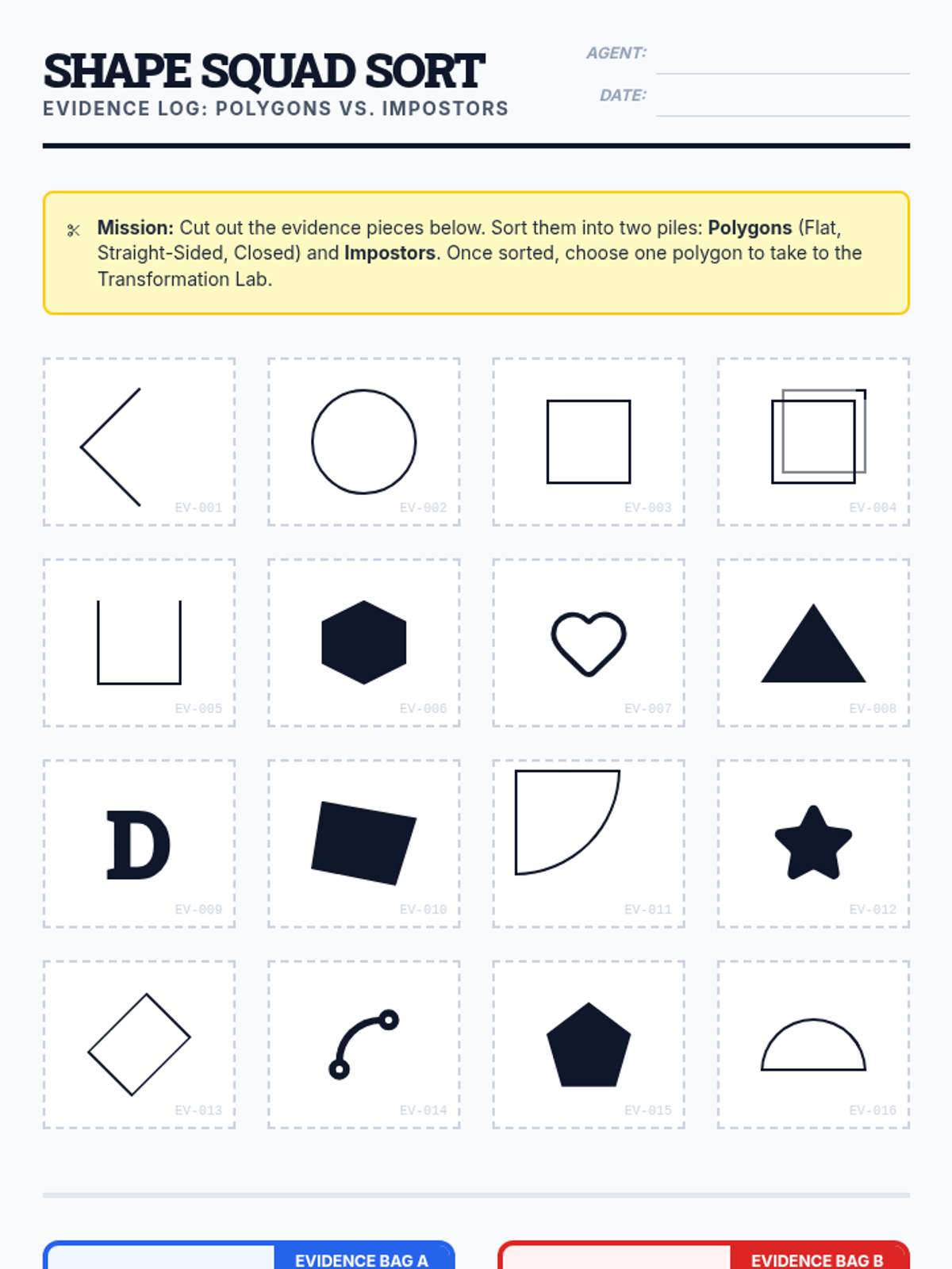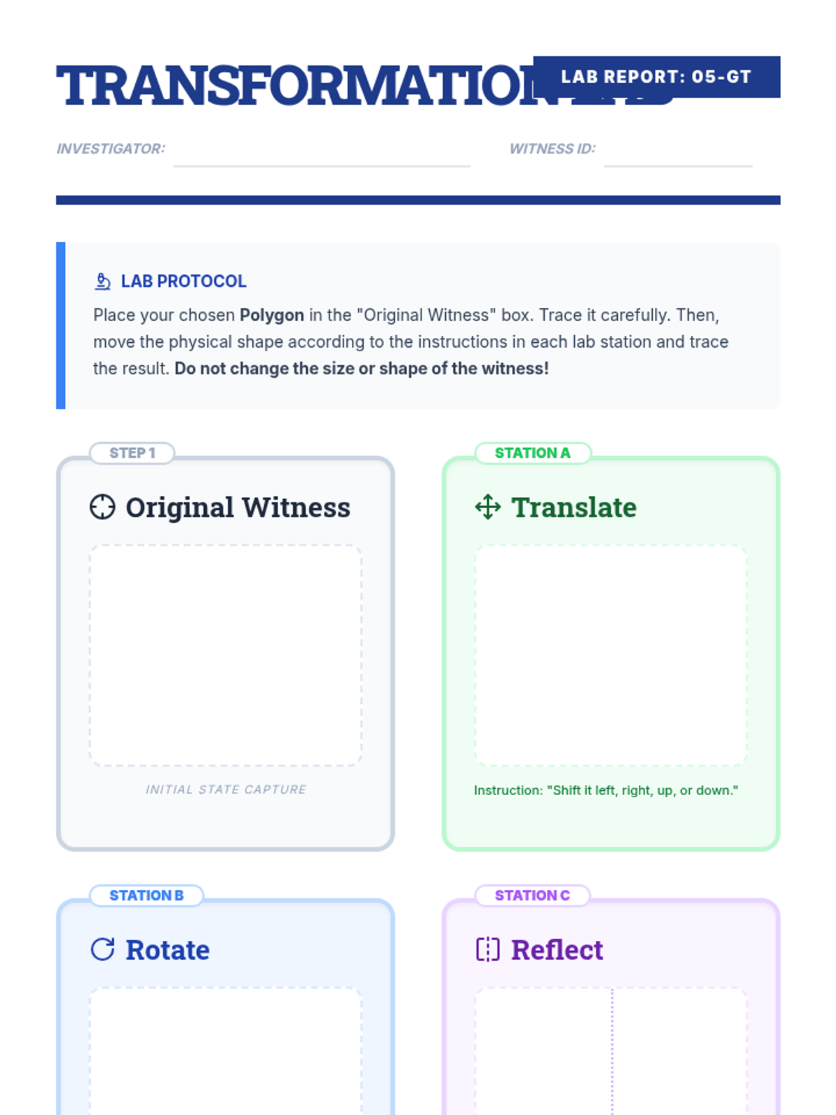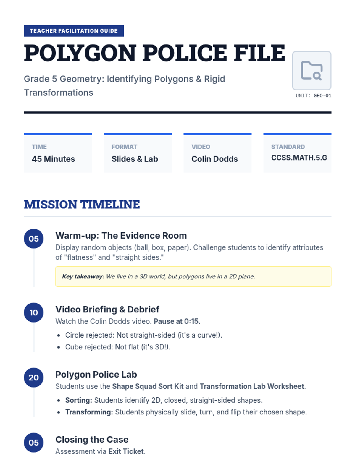 A 5th-grade geometry lesson where students identify polygons based on attributes and explore geometric transformations (rotation, translation, reflection) through song and hands-on sorting.