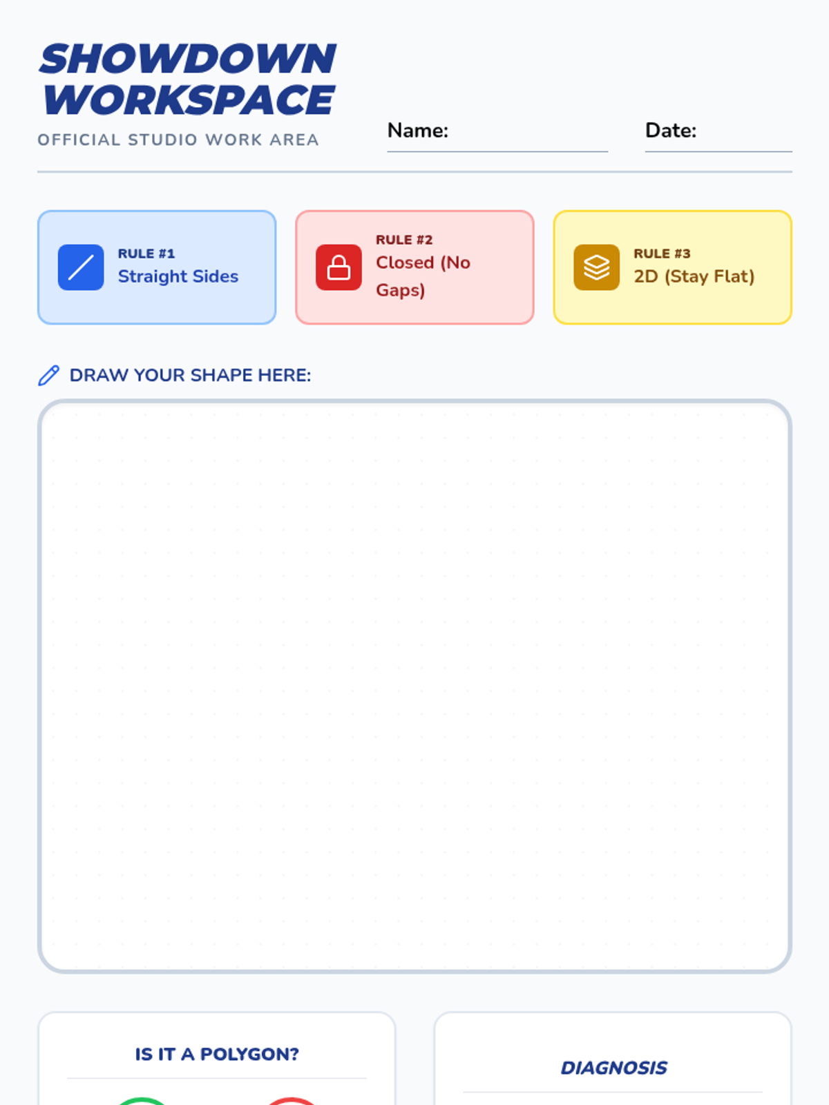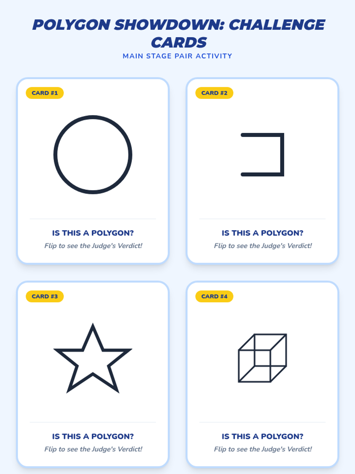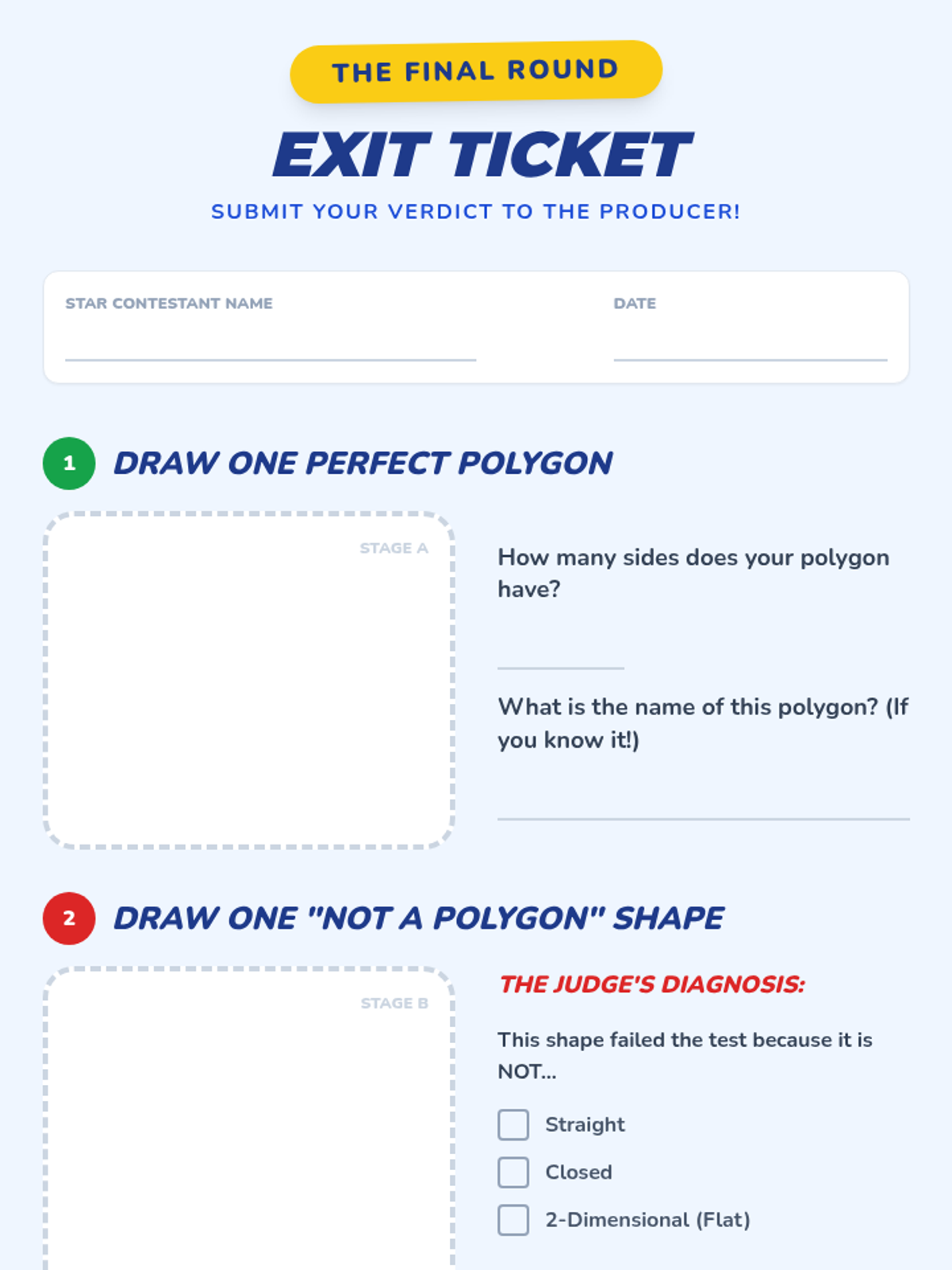 An energetic, game-show themed geometry lesson where 4th graders master the three criteria of polygons (straight, closed, and 2D) through interactive video viewing and peer-to-peer shape diagnosis.