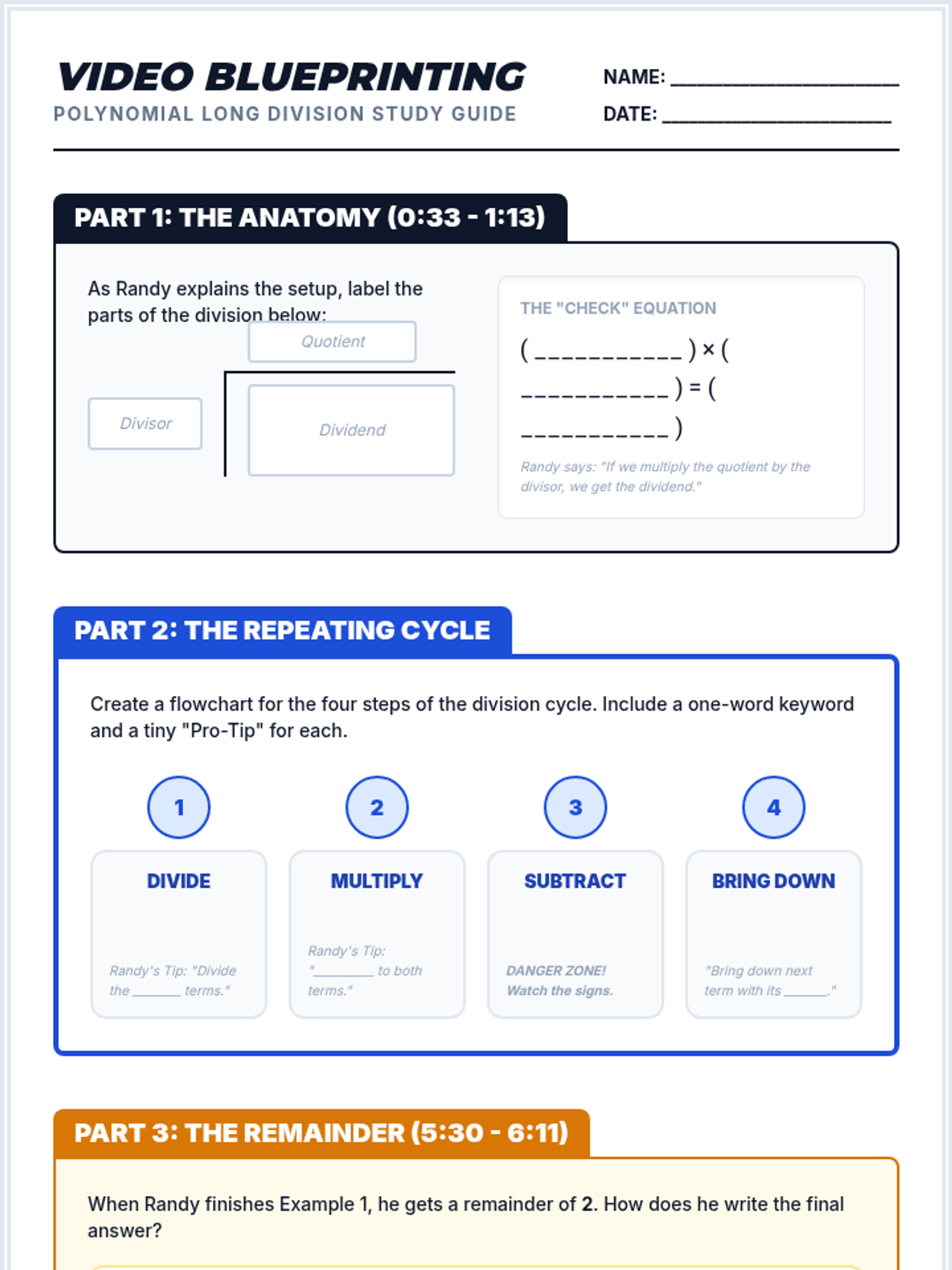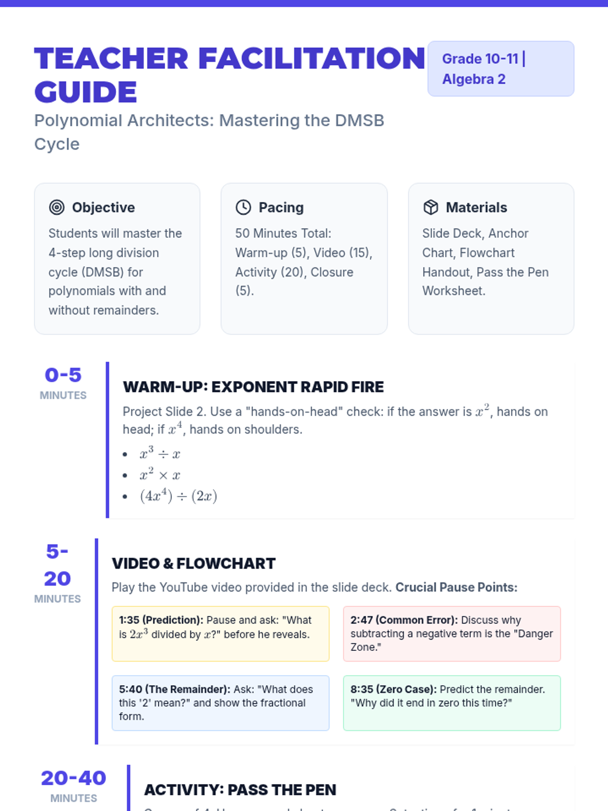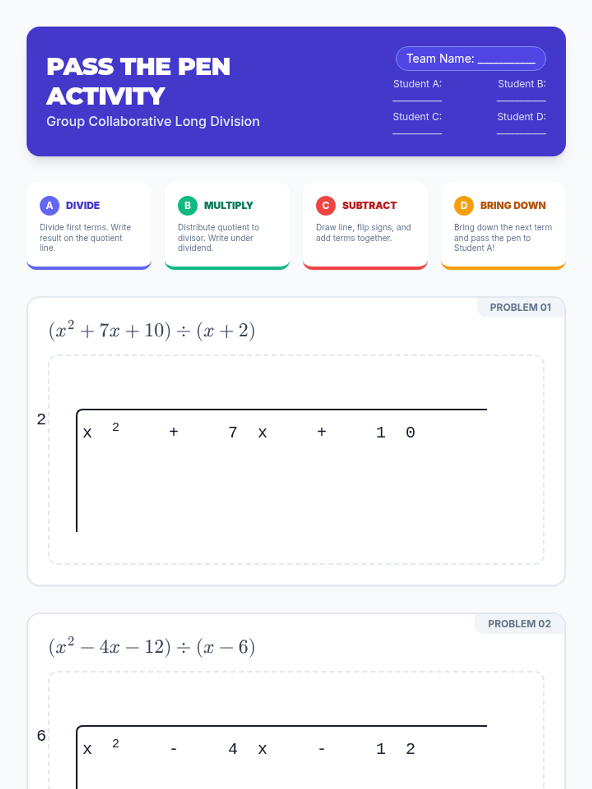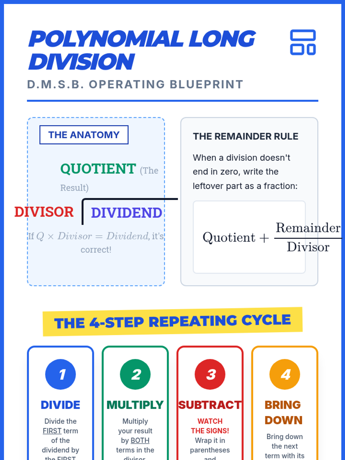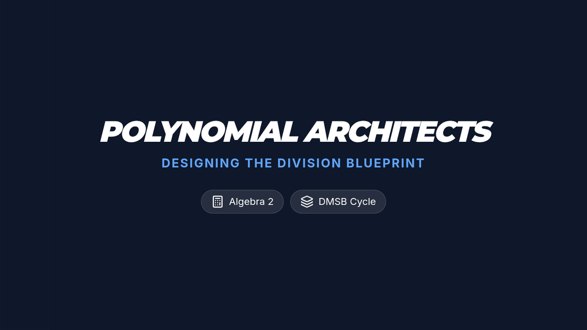 A comprehensive lesson on polynomial long division using the 'Divide, Multiply, Subtract, Bring Down' (DMSB) cycle. Students will use visual flowcharts, collaborative group work, and video examples to master the process of dividing complex algebraic expressions.