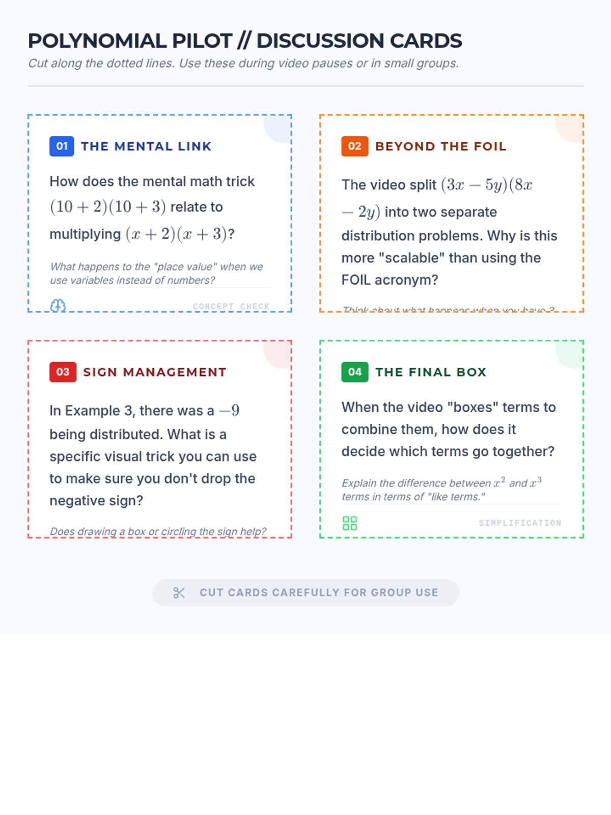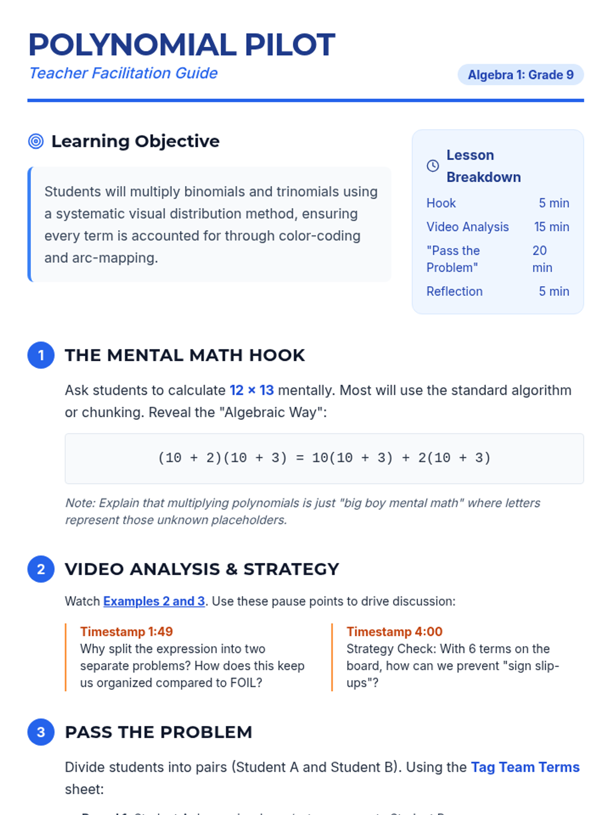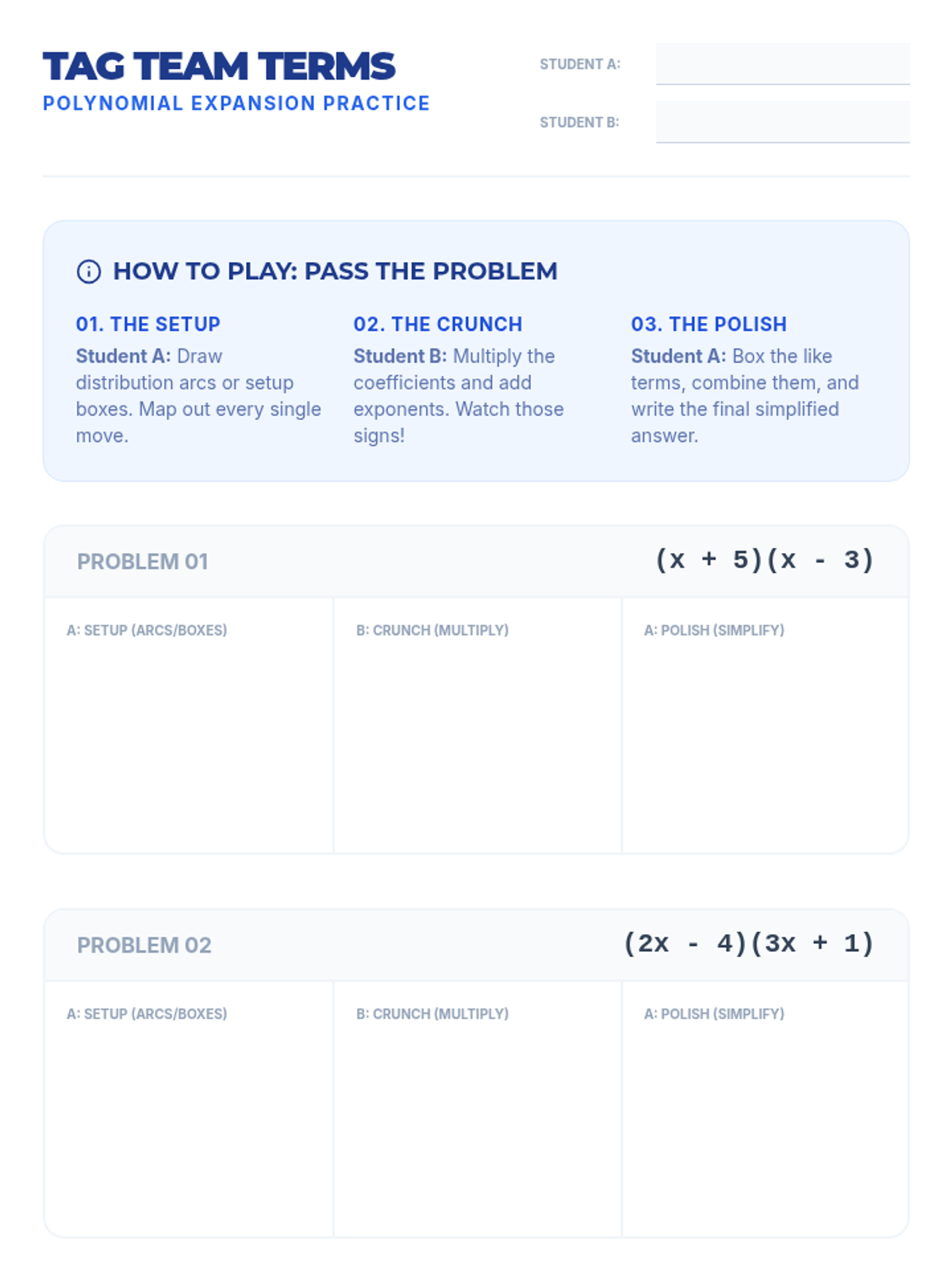 Students will master the multiplication of binomials and trinomials through a systematic visual distribution method, transitioning from basic FOIL to handling larger polynomial expressions.