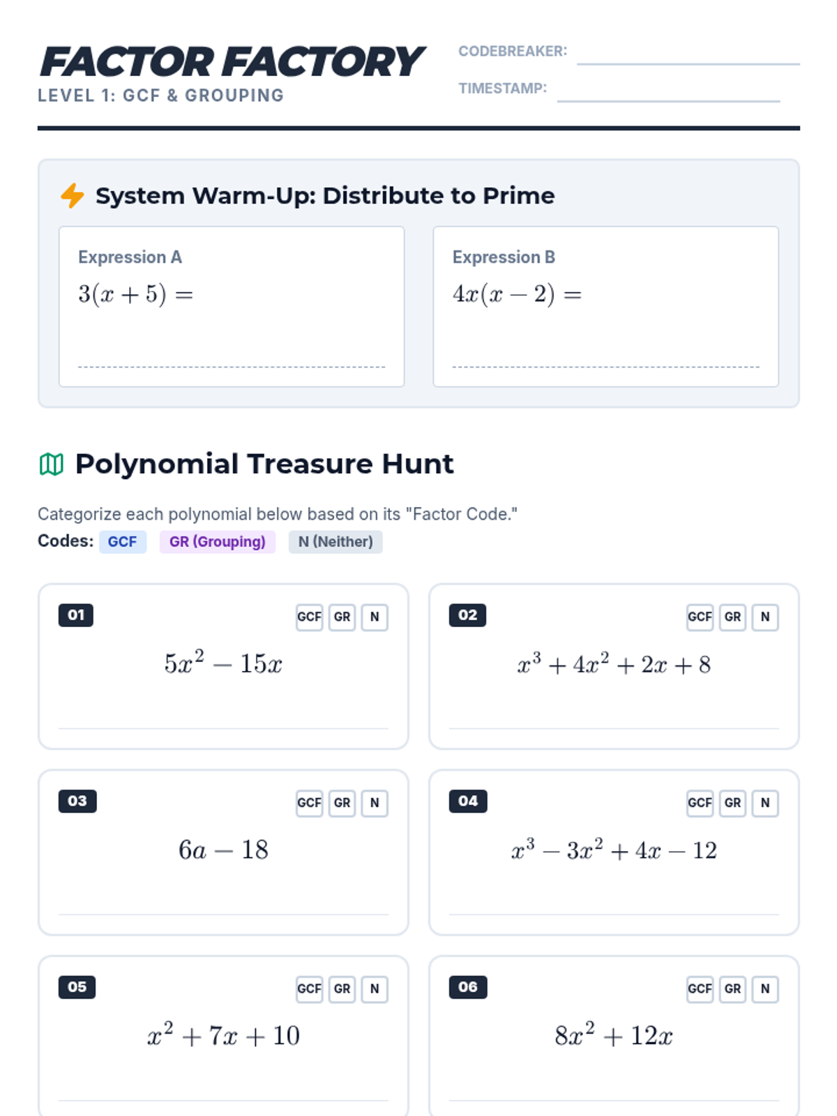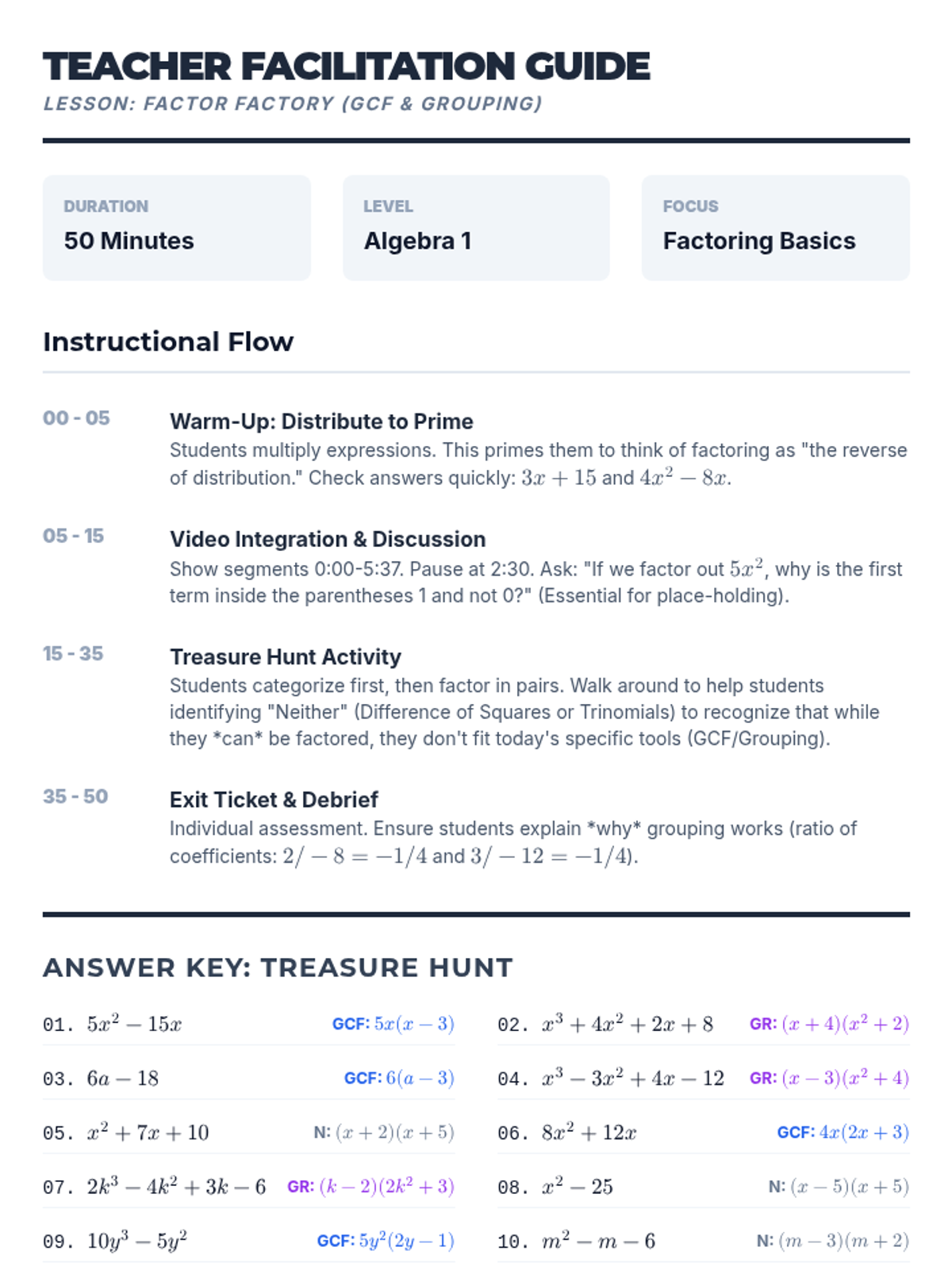 This lesson introduces students to the foundational concepts of factoring polynomials, focusing on identifying and extracting the Greatest Common Factor (GCF) and using the grouping method for four-term polynomials. Through a mix of direct instruction, video analysis, and a collaborative treasure hunt activity, students develop the skills to decompose complex expressions.
