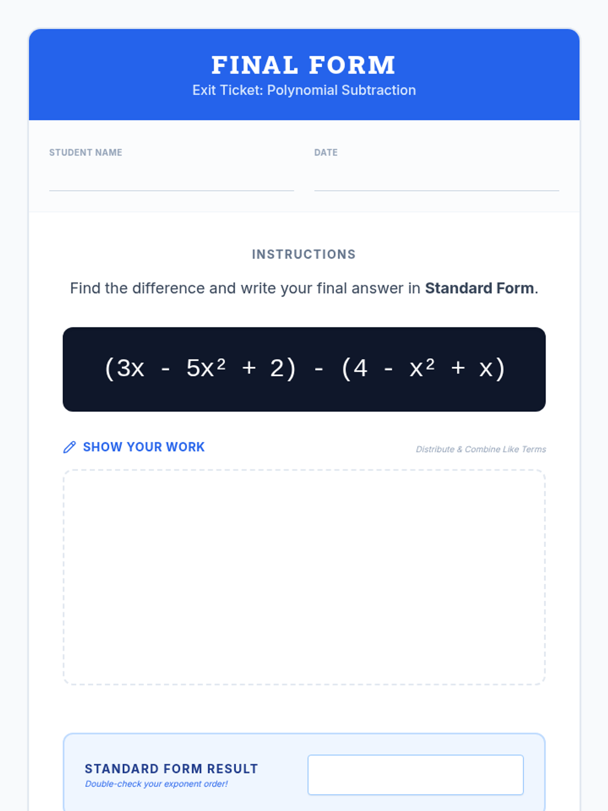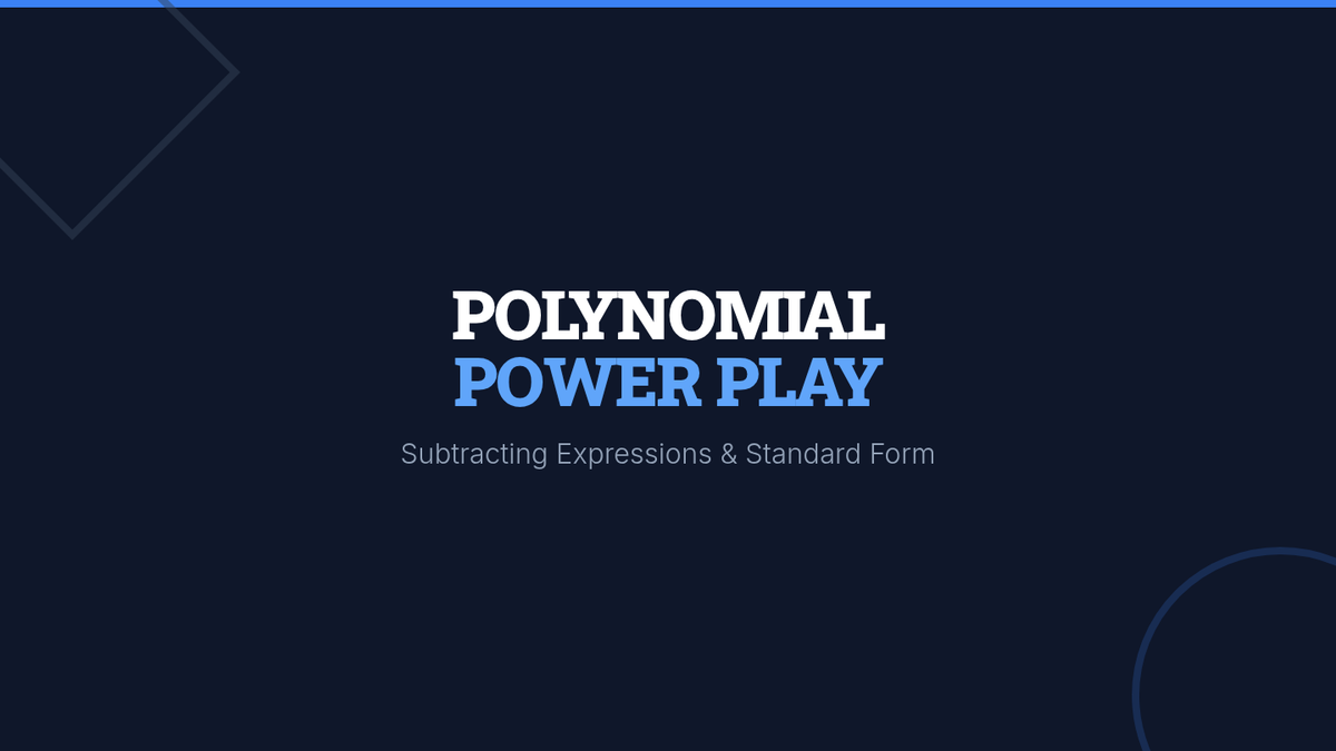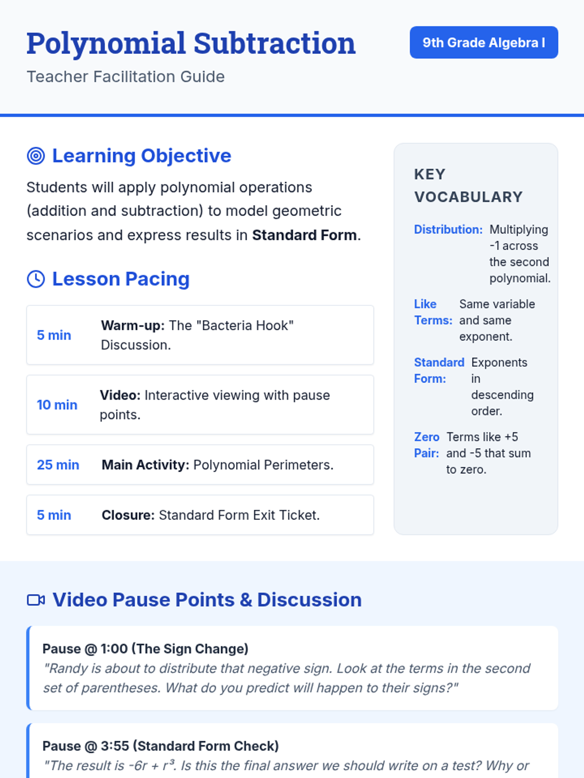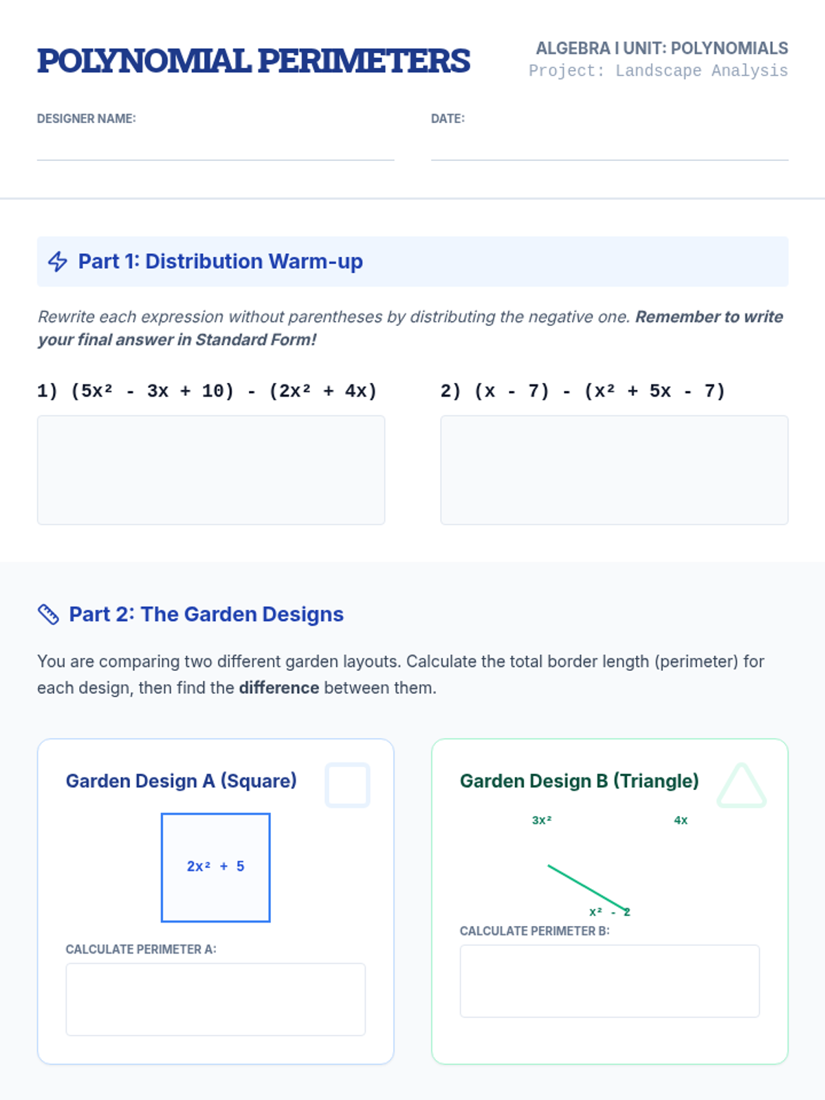 Students learn to subtract polynomials by distributing a negative one and combining like terms, then apply these skills to solve geometric perimeter problems and write answers in standard form.