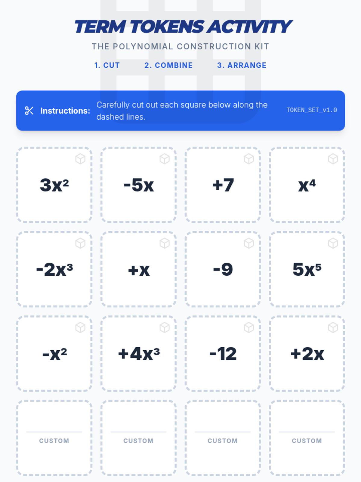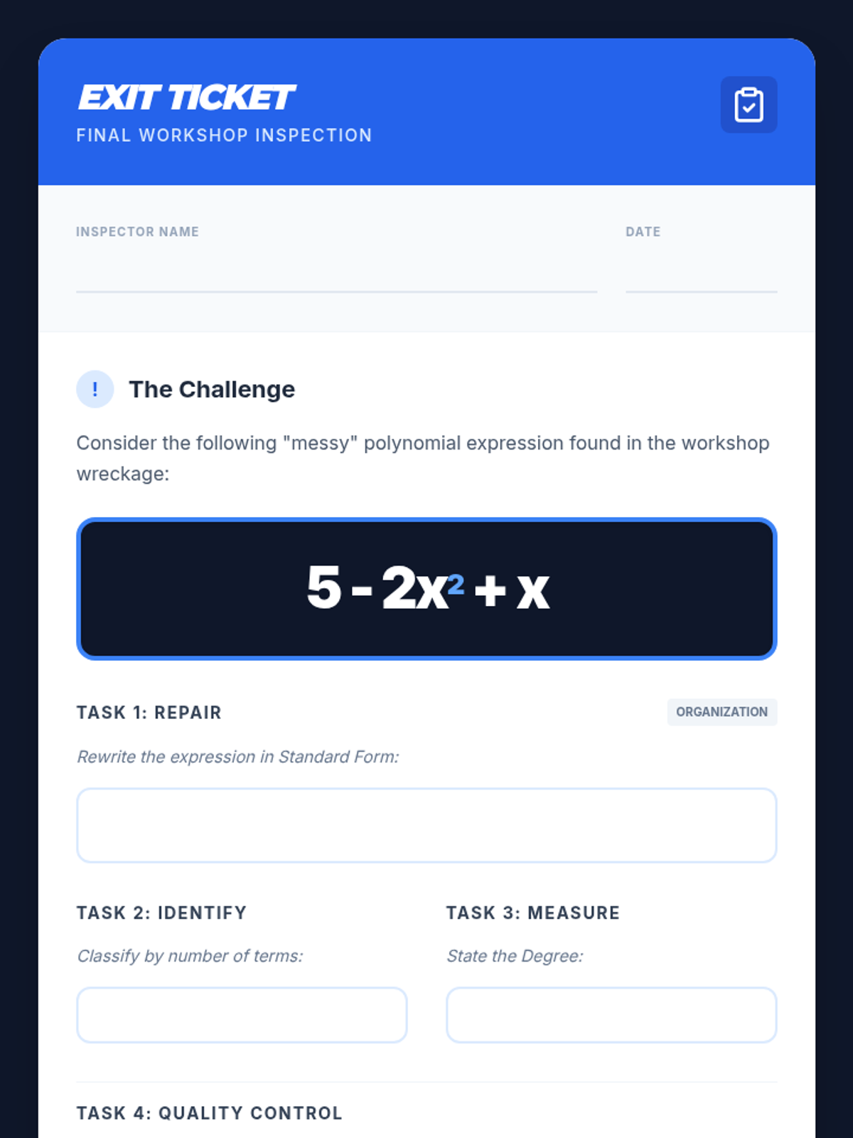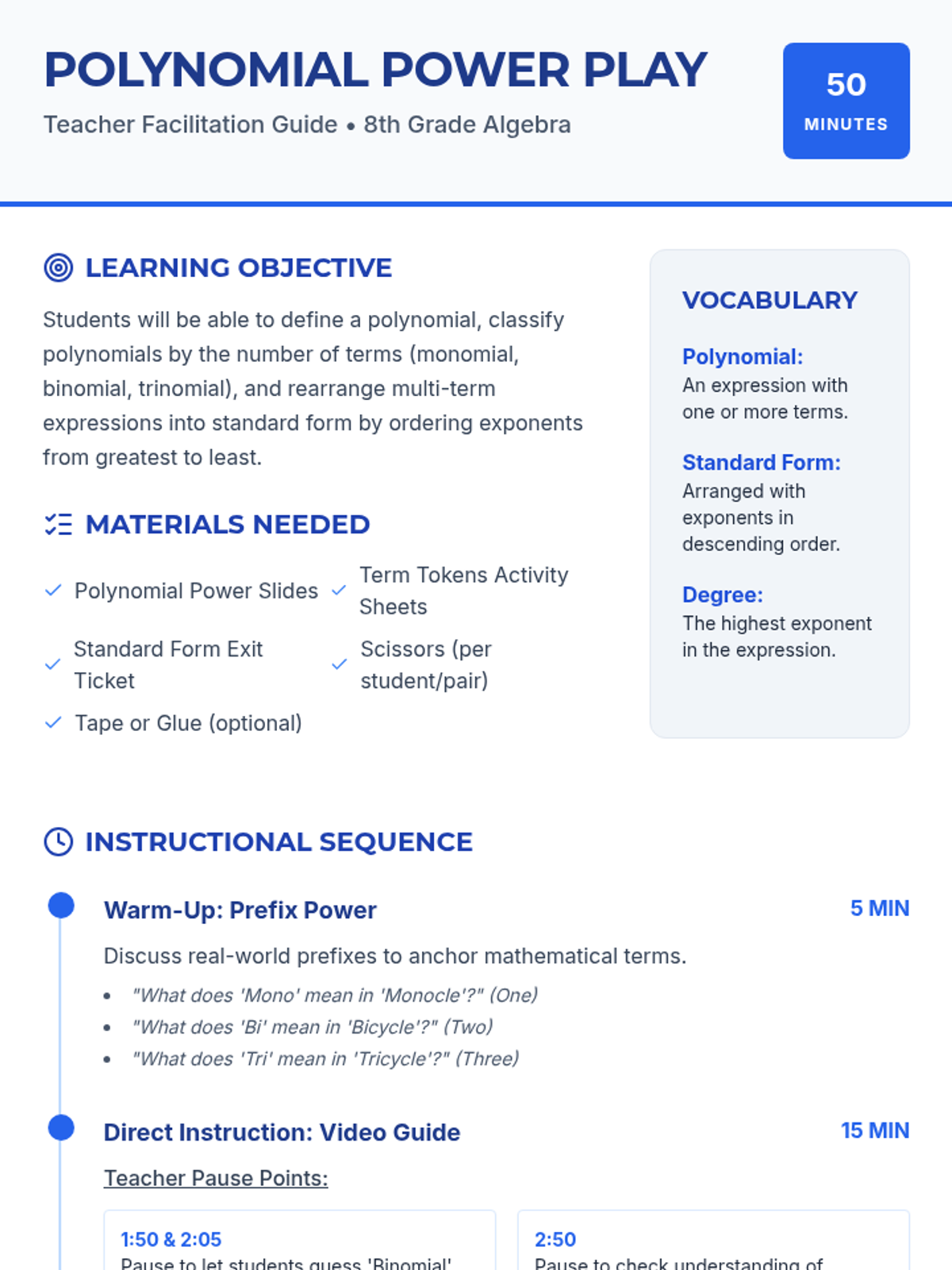 A foundational algebra lesson where 8th-grade students learn to identify the anatomy of polynomials, classify them by the number of terms, and organize them into standard form using a hands-on construction theme.