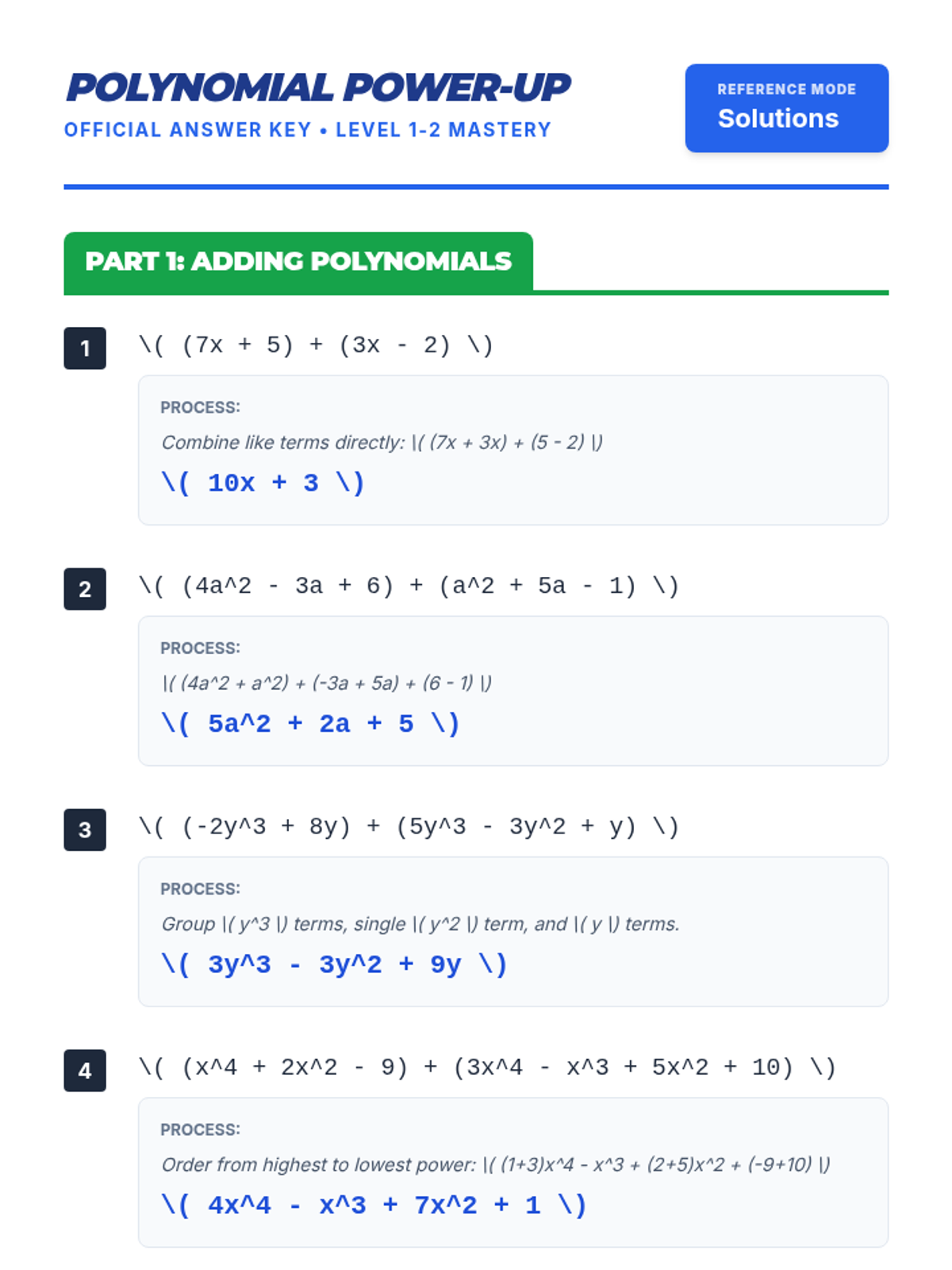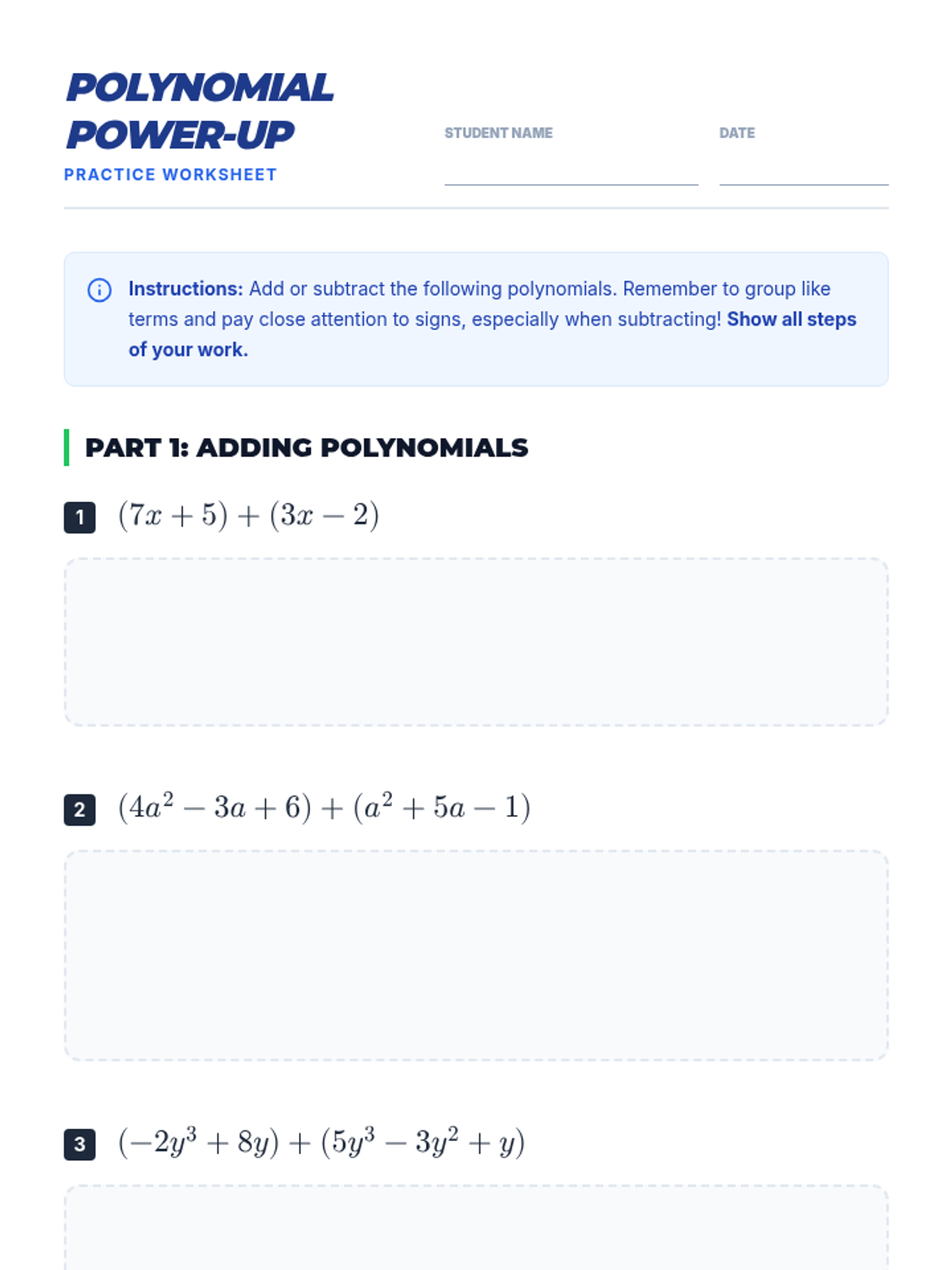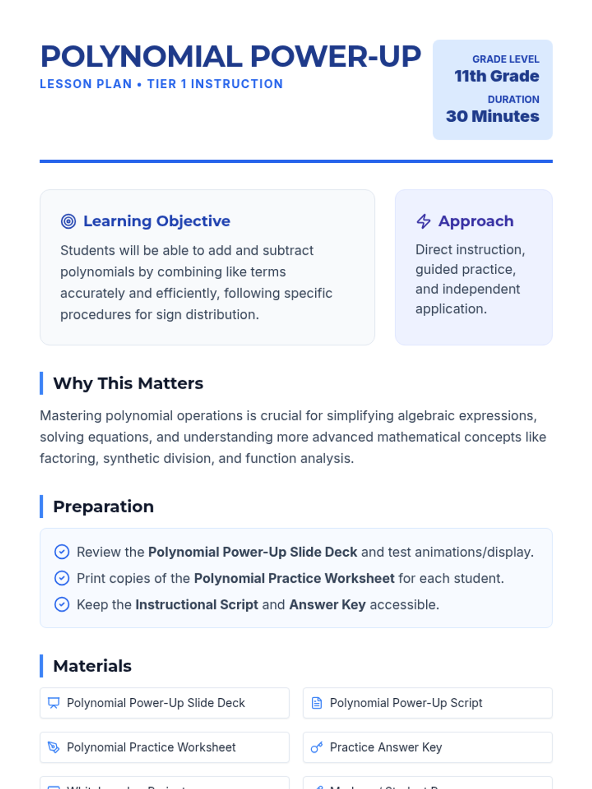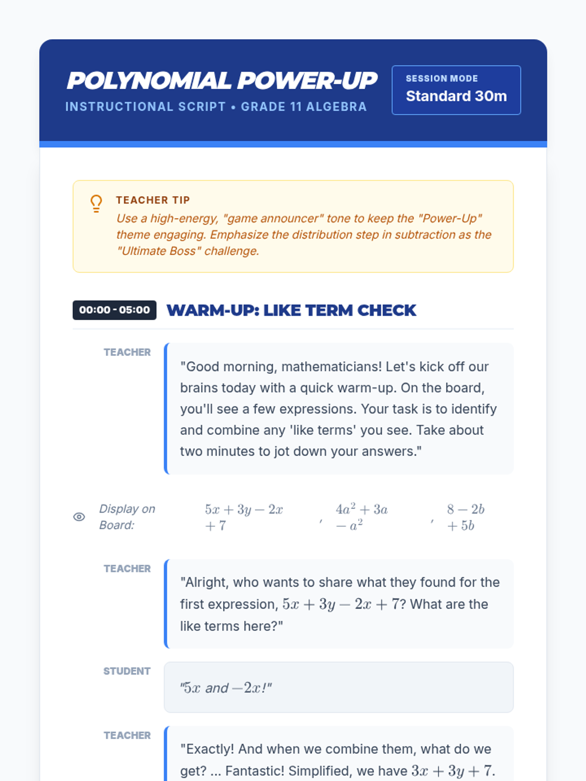 A high-energy algebra lesson focused on mastering the addition and subtraction of polynomials through combining like terms. Designed for 11th-grade students, this 30-minute session uses a 'Power-Up' theme to make algebraic operations engaging and clear.