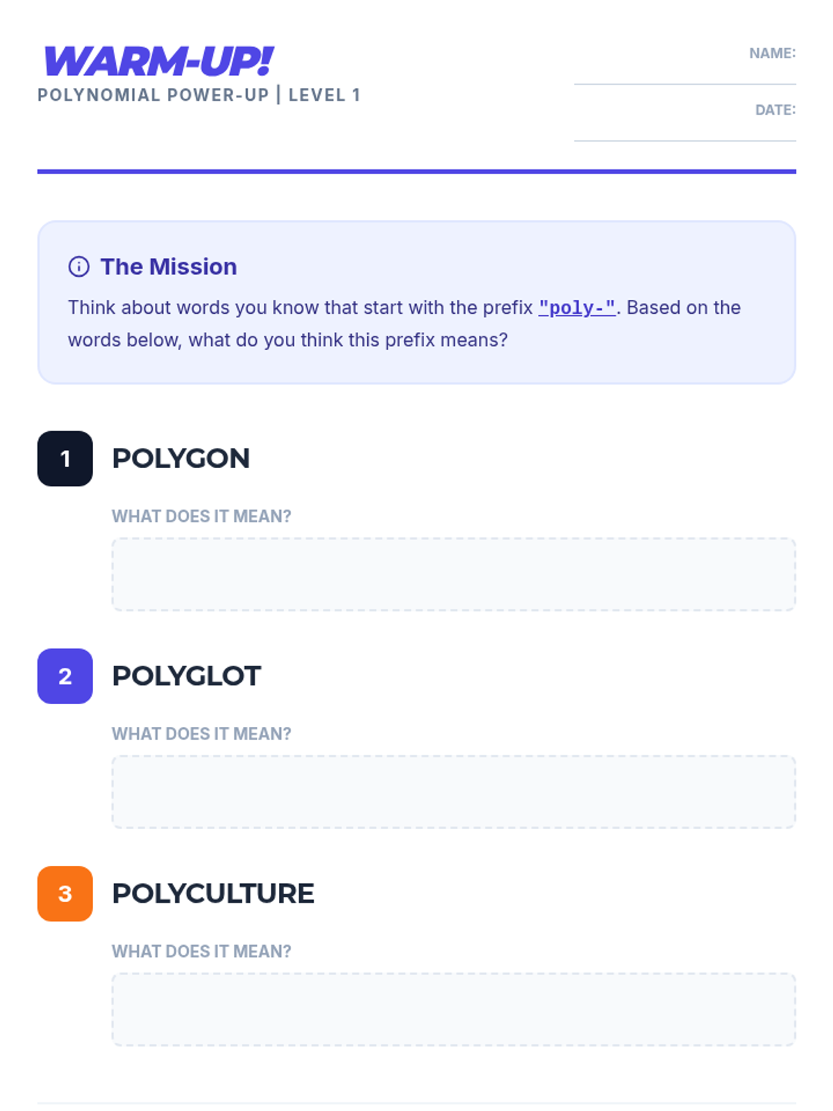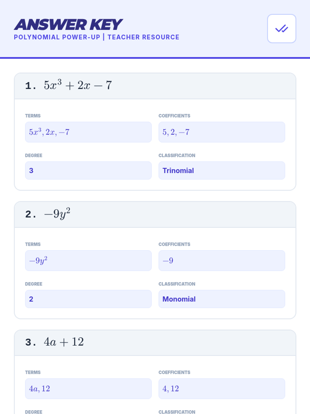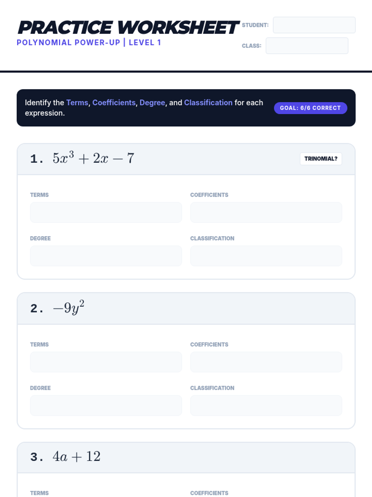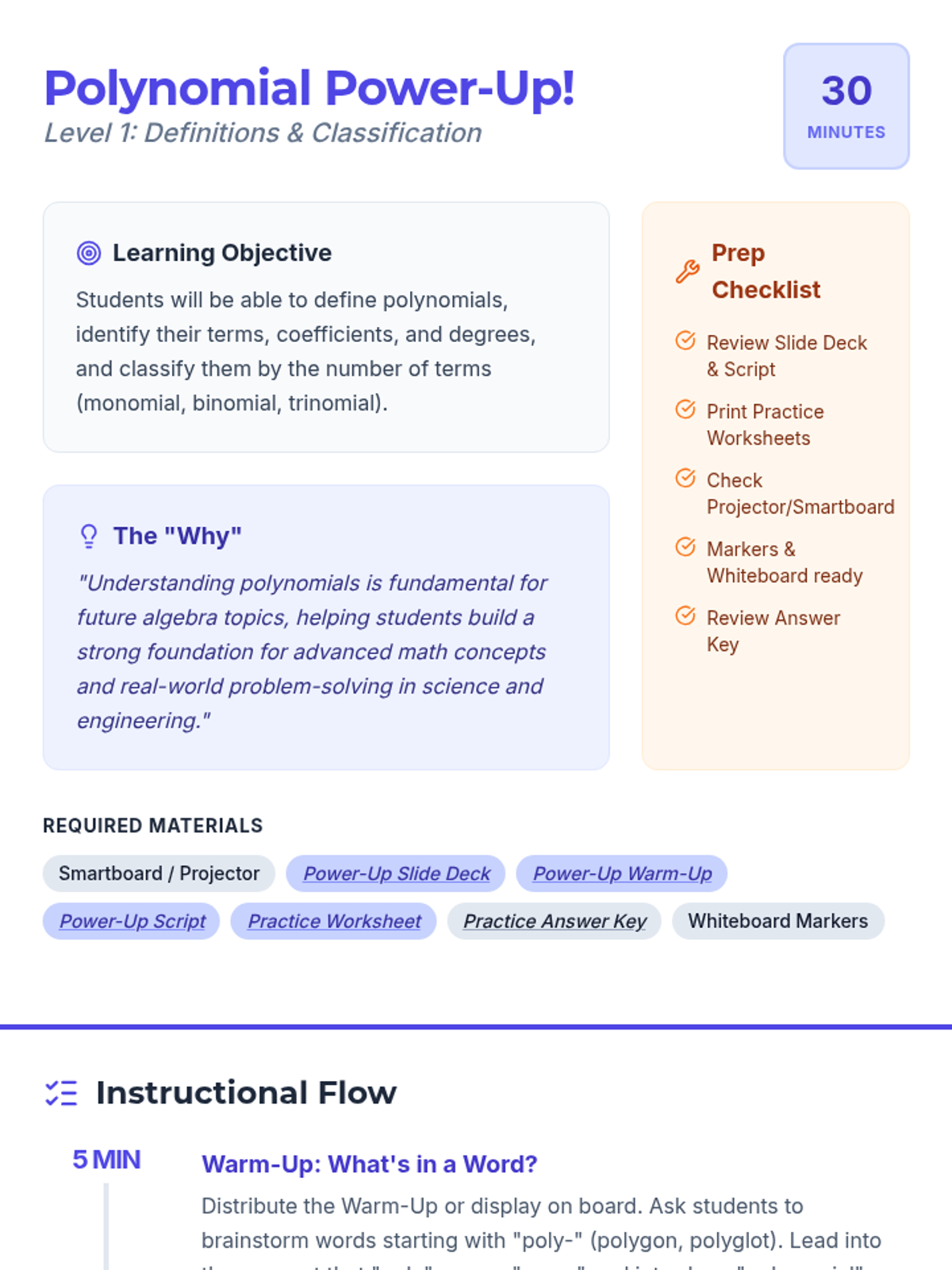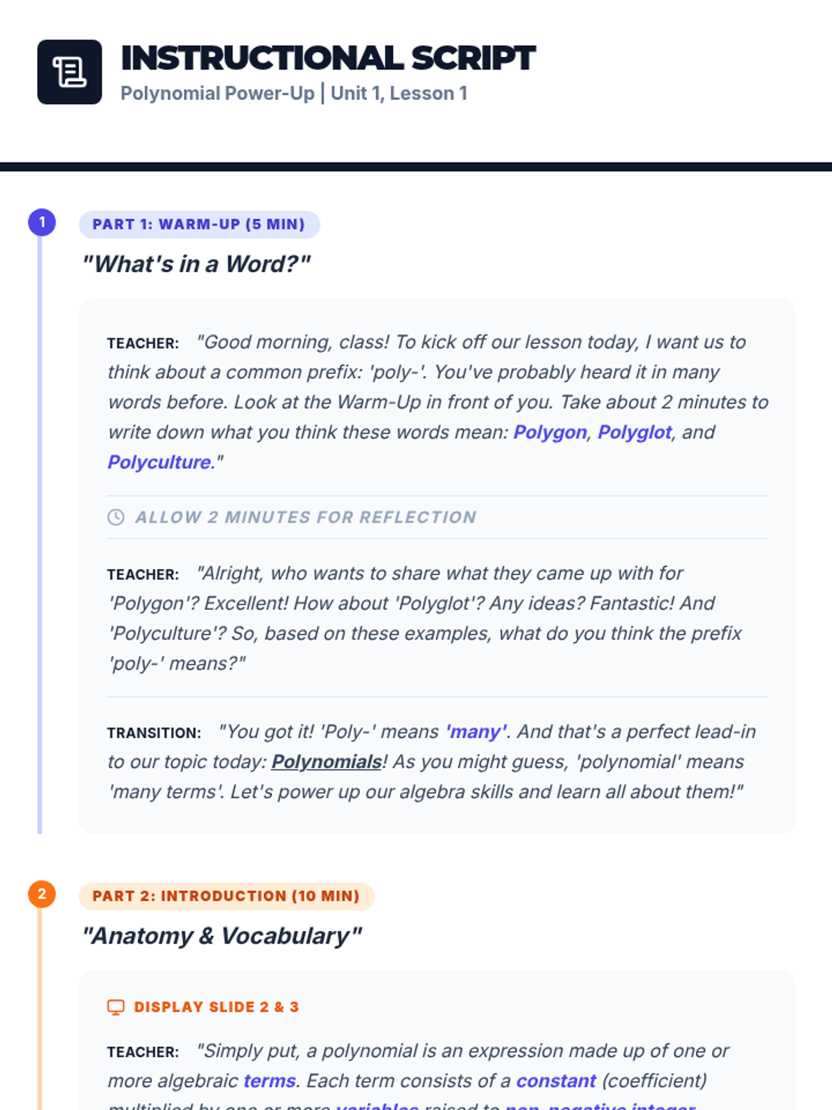 An engaging introductory lesson to help 7th-grade students define and classify polynomials through direct instruction and guided practice.