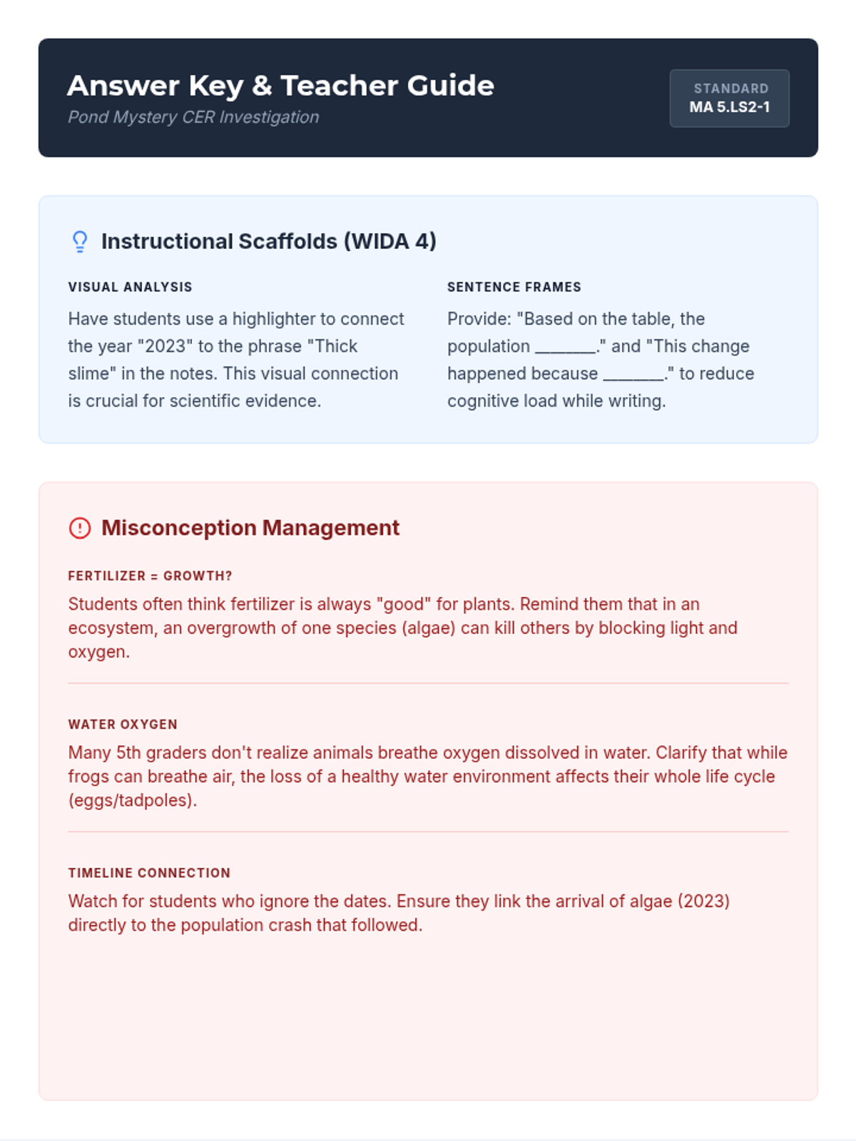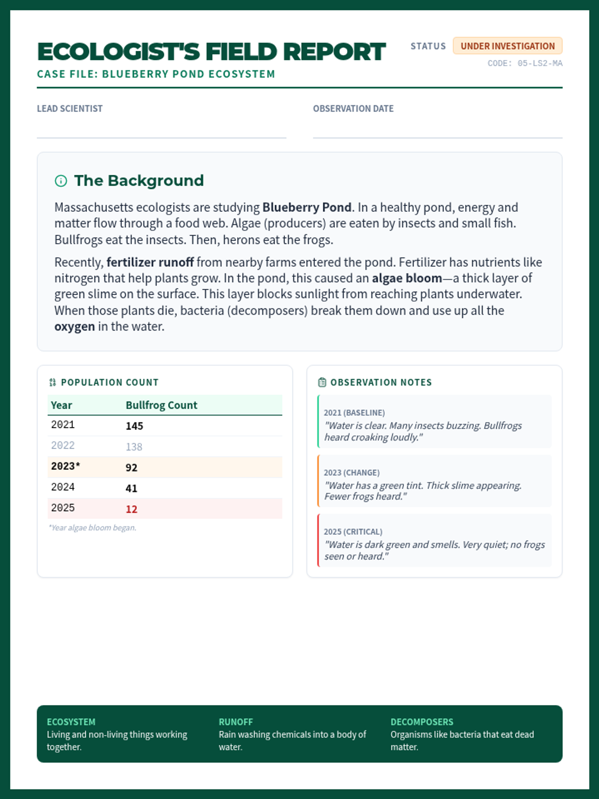 In this lesson, grade 5 students (WIDA Level 4) investigate a change in a local Massachusetts pond ecosystem. They will analyze quantitative frog population data and qualitative water quality observations to construct a Claim-Evidence-Reasoning (CER) argument about the impact of algae blooms on the food web.
