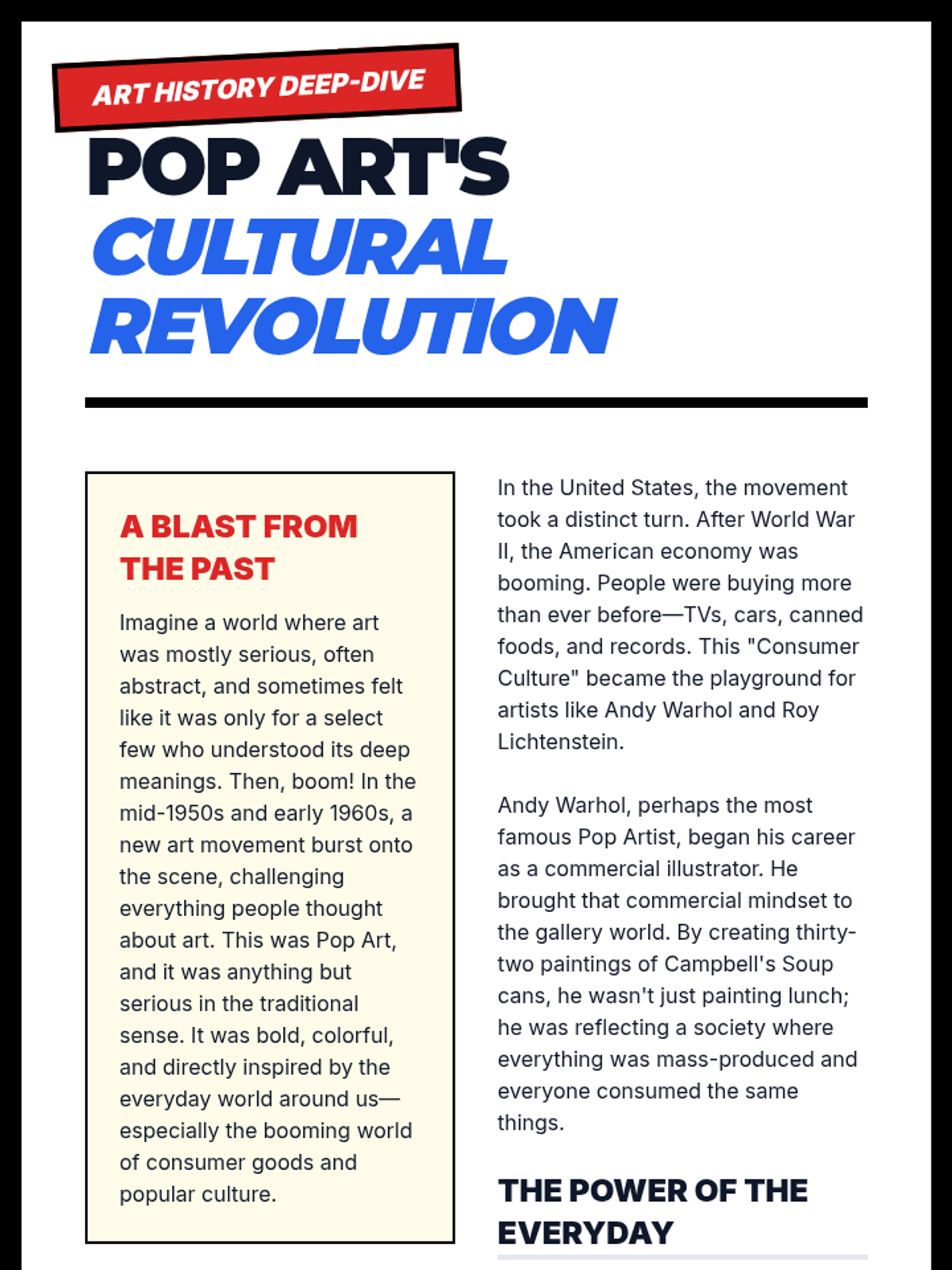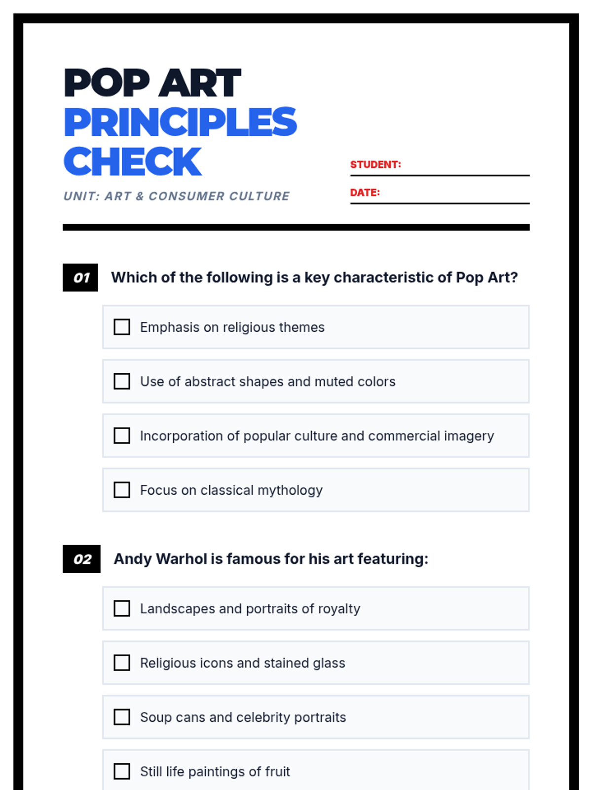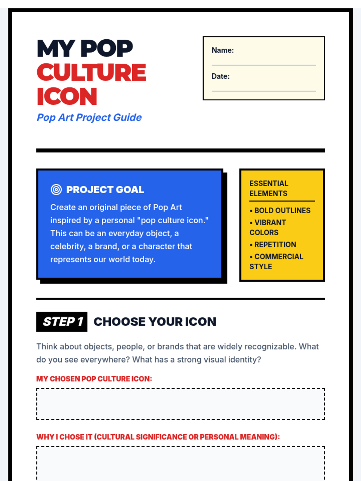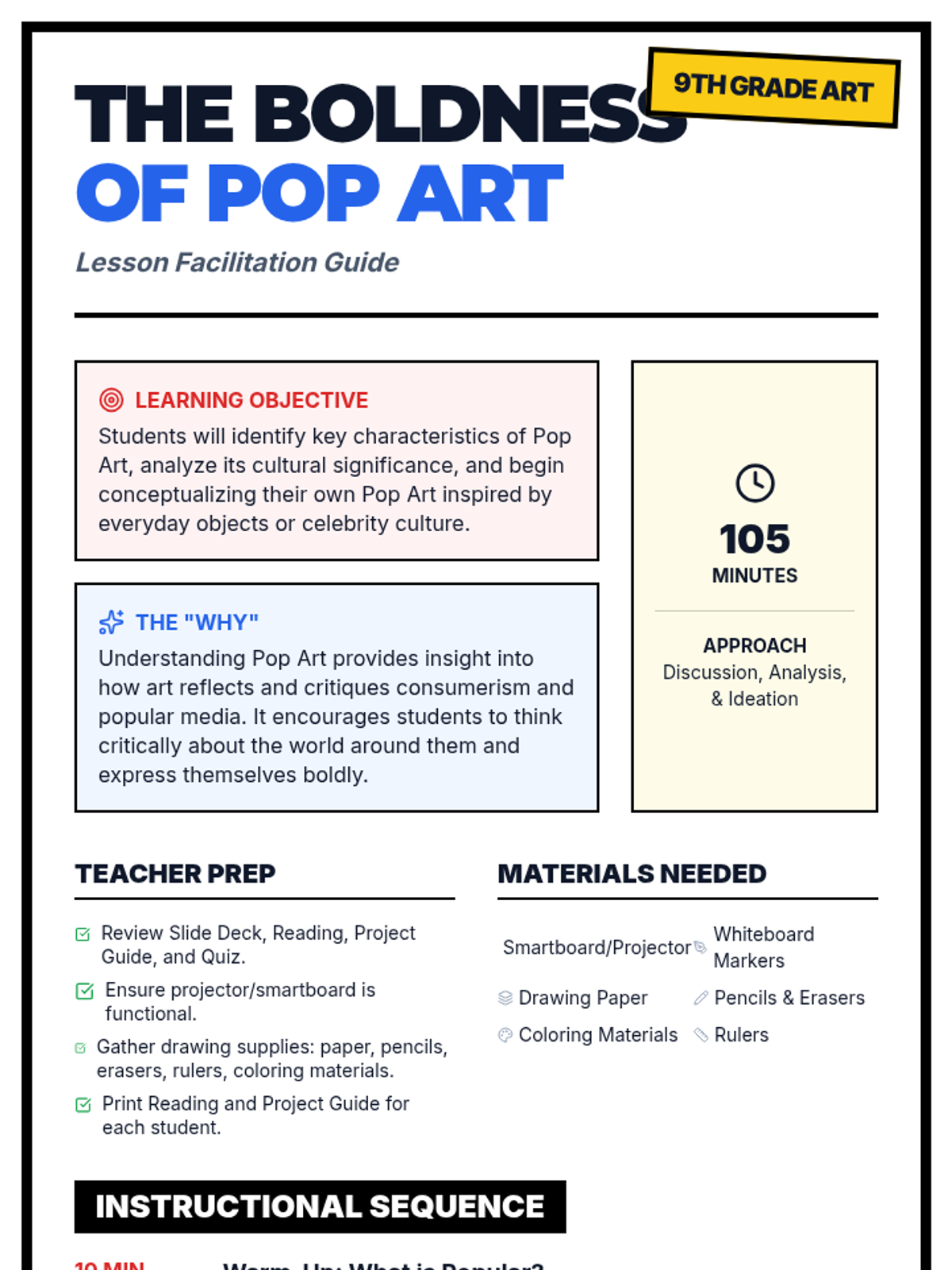 A vibrant 105-minute lesson exploring the Pop Art movement. Students analyze cultural impacts of consumerism and celebrity culture while creating their own inspired art pieces using everyday icons.