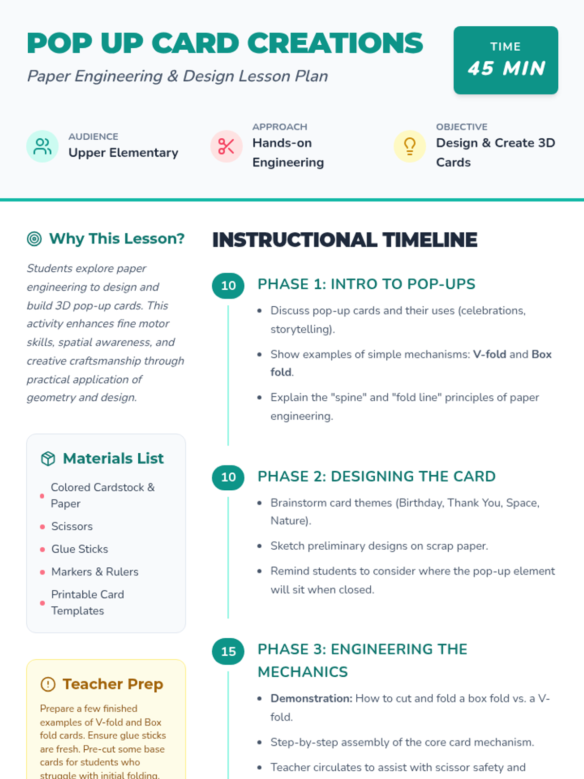 A hands-on lesson where students explore paper engineering to design and build 3D pop-up cards, developing fine motor skills and spatial awareness.
