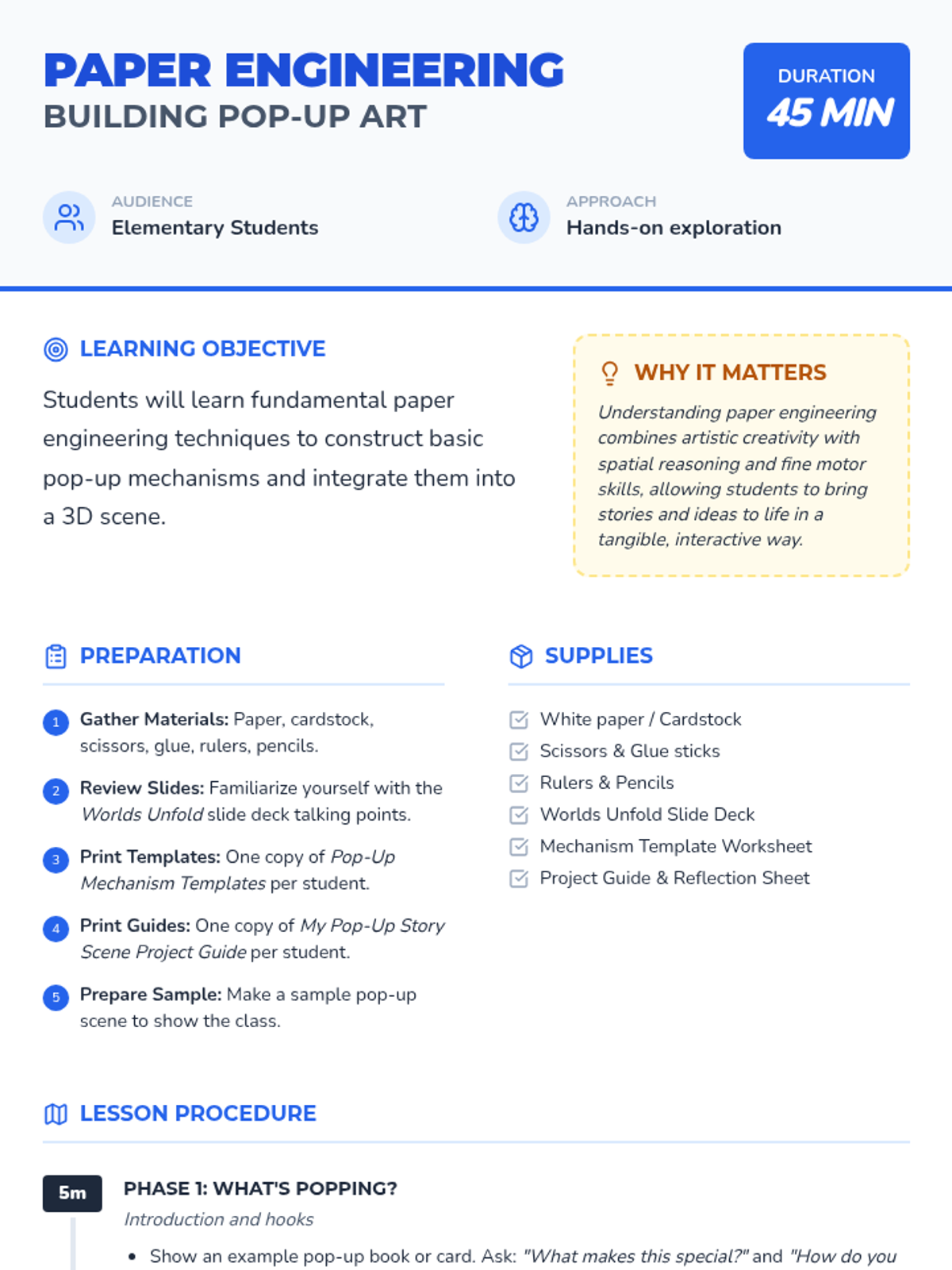 This lesson introduces elementary students to the fundamentals of paper engineering. Students learn to create V-folds and parallel folds to build their own 3D pop-up scenes, combining artistic expression with spatial reasoning and fine motor skills.