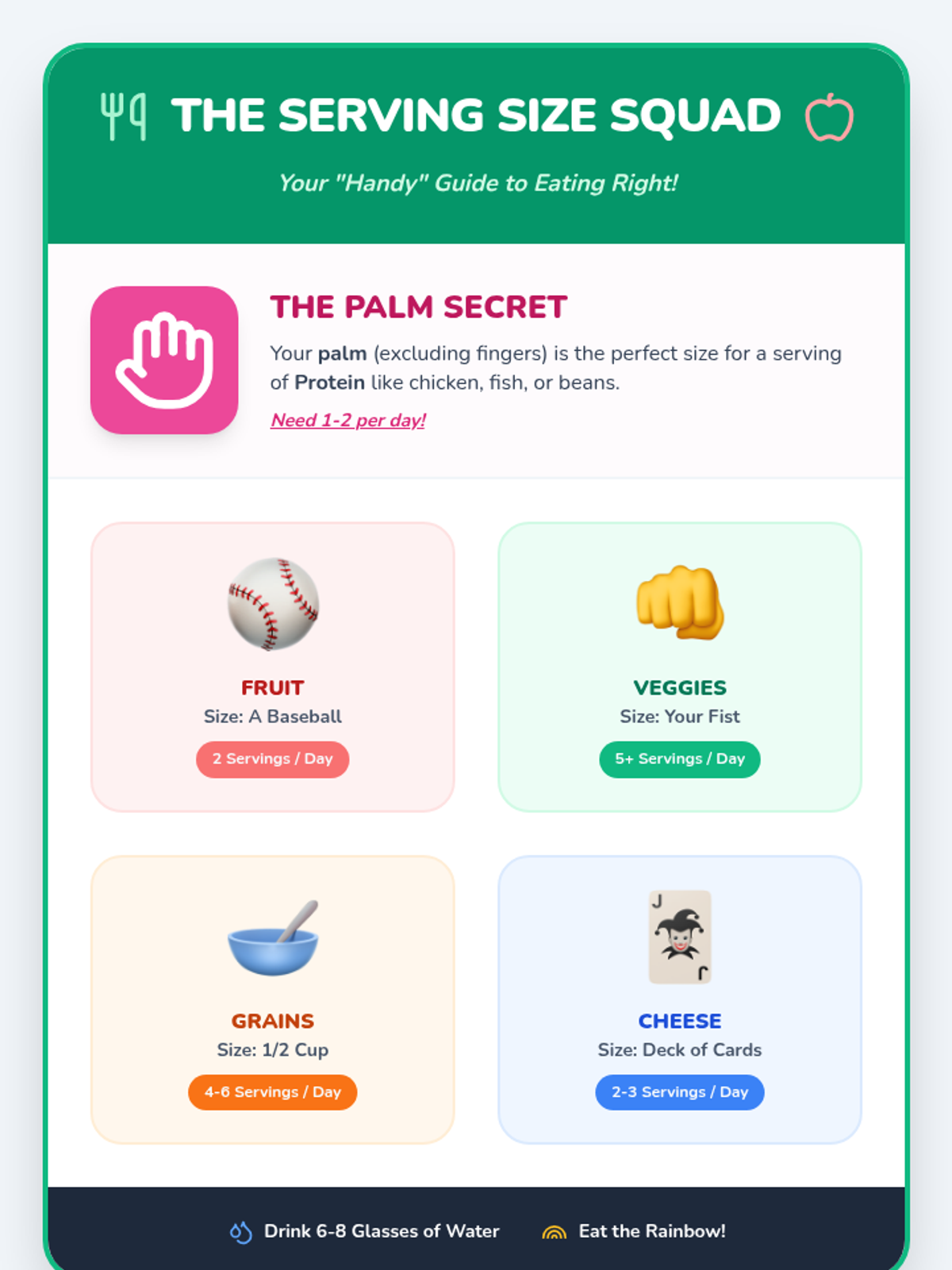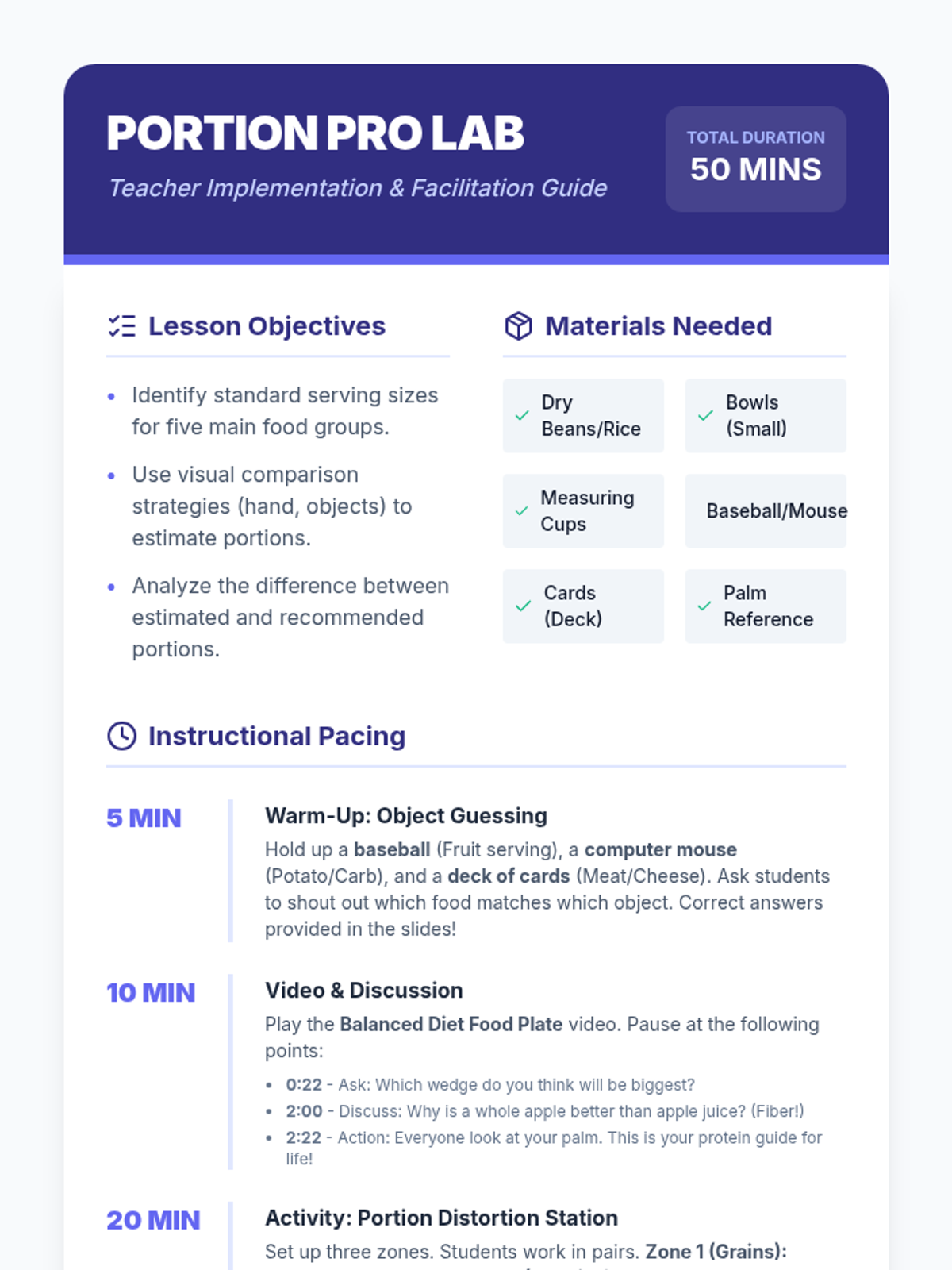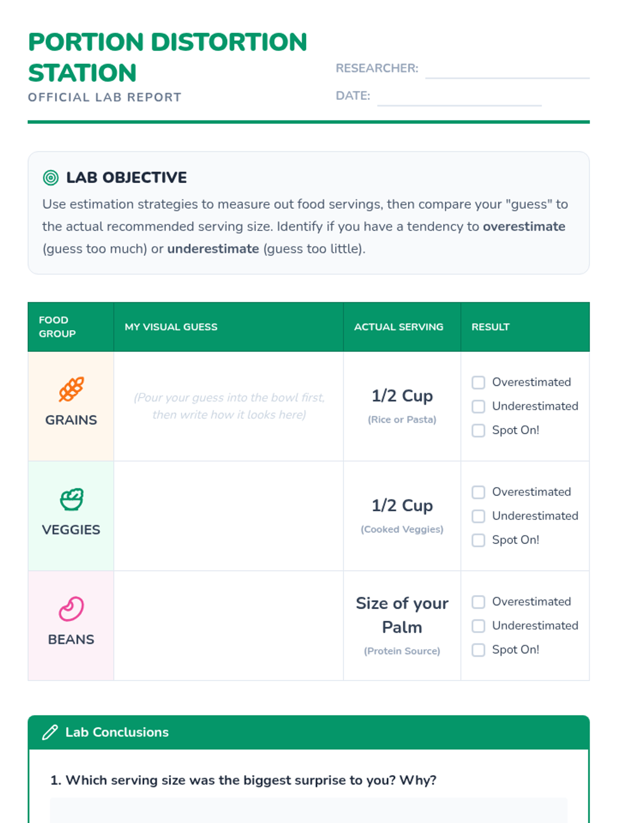 A hands-on nutrition lesson where students use visual estimation and physical measurement to understand serving sizes. Includes a video exploration of the balanced diet plate and a 'Portion Distortion' station activity.