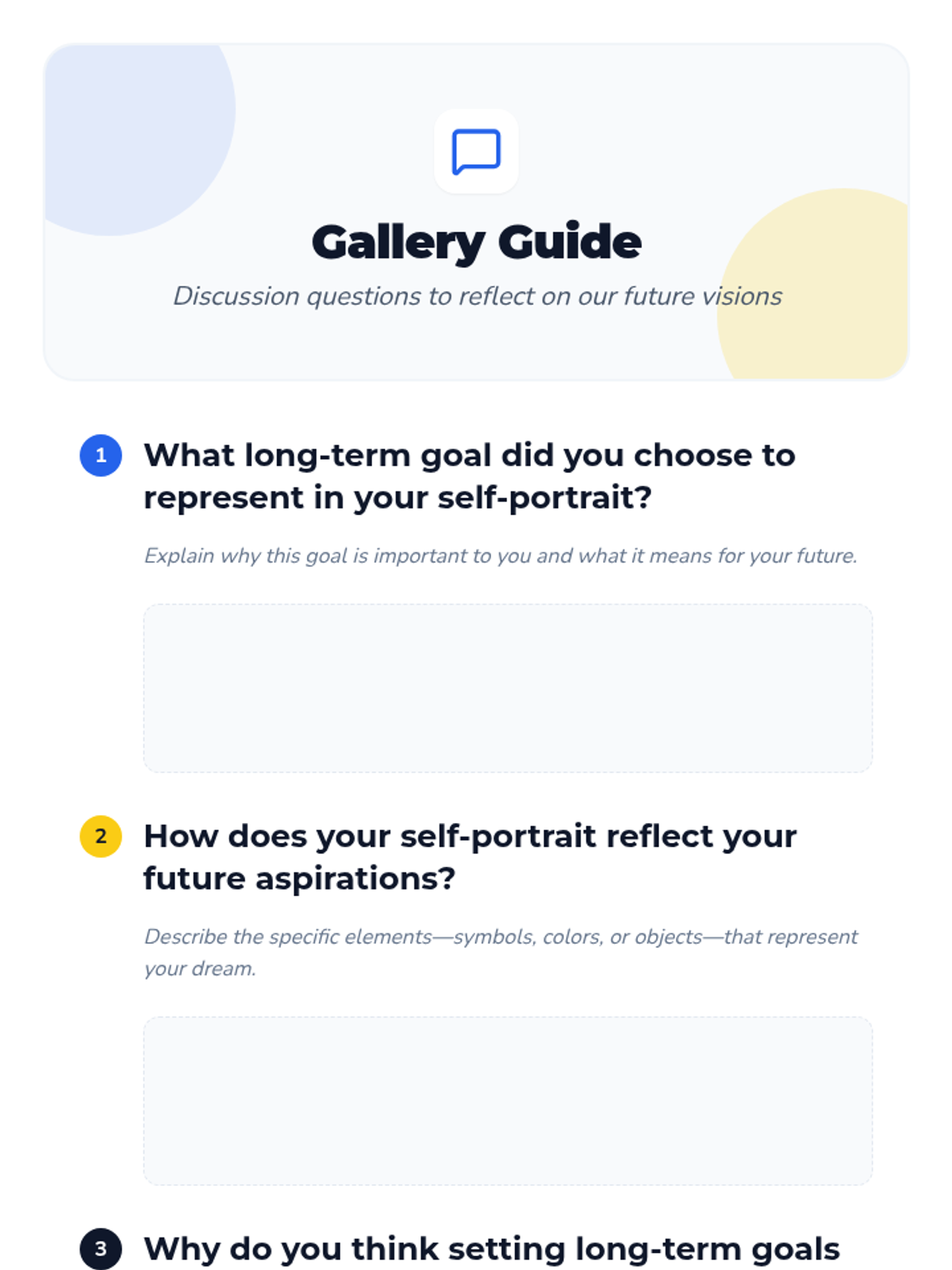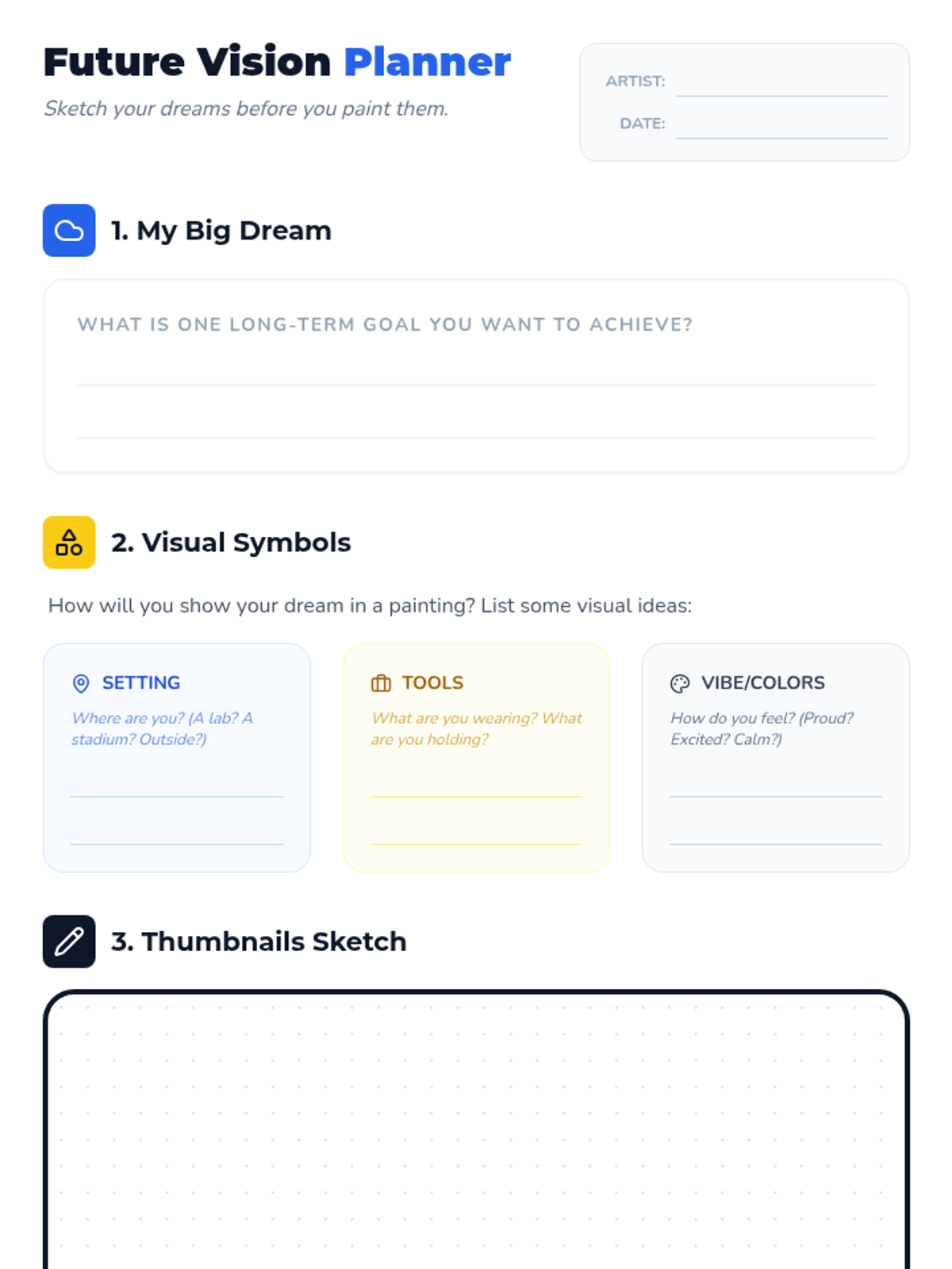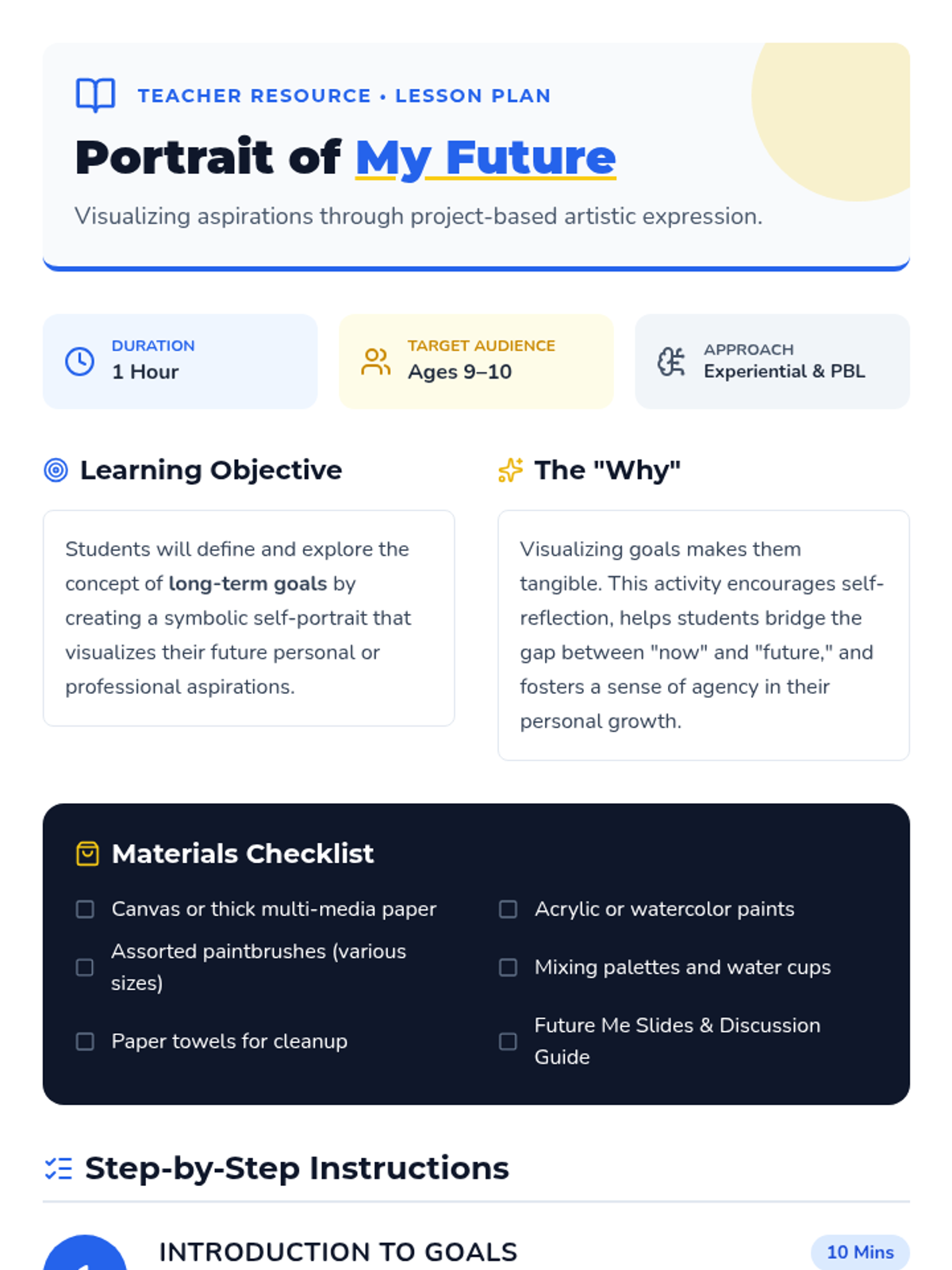 Students explore long-term goals by creating a self-portrait representing their future aspirations. This creative, project-based lesson combines artistic expression with self-reflection and goal-setting strategies.
