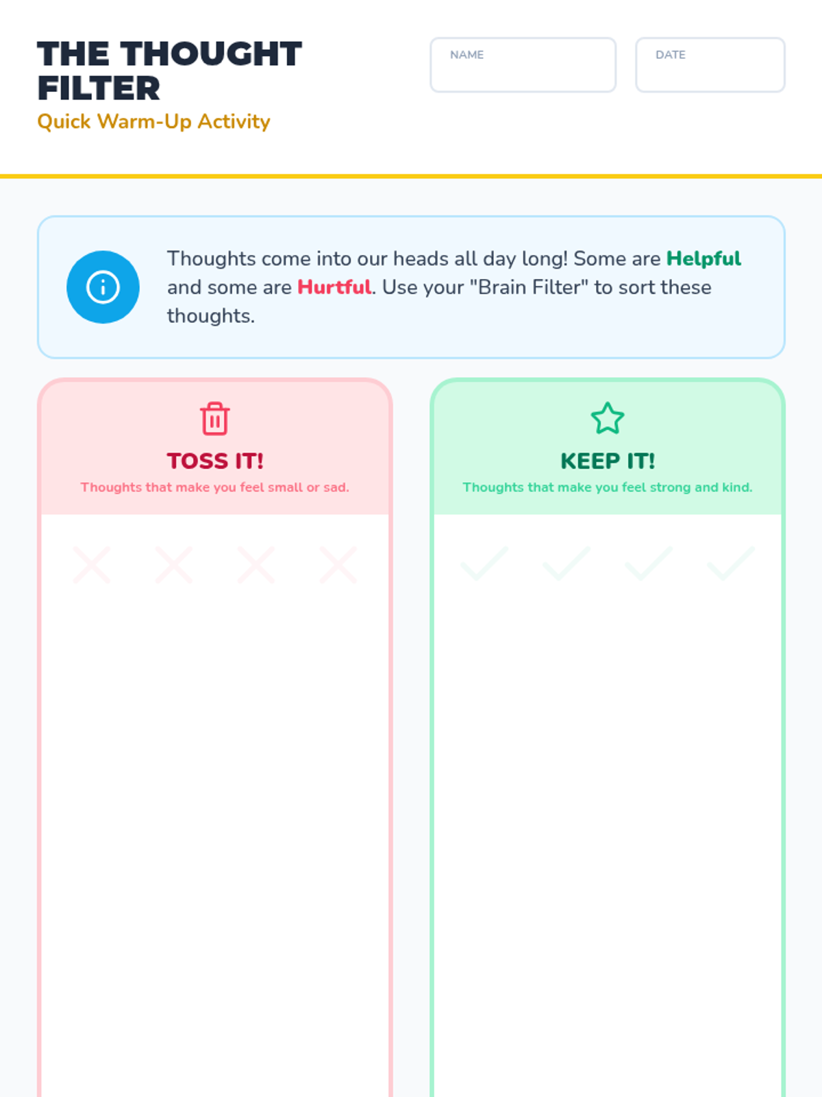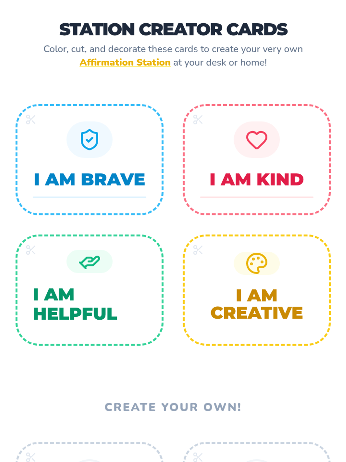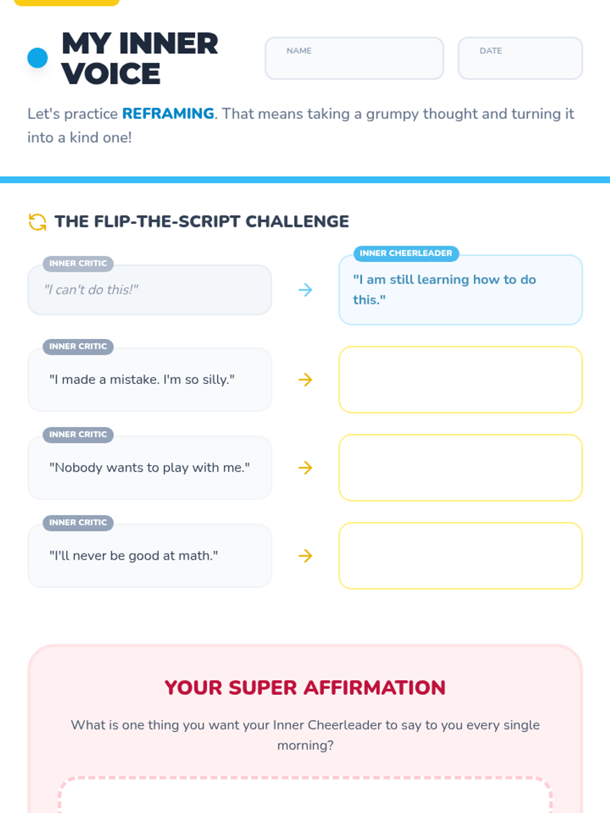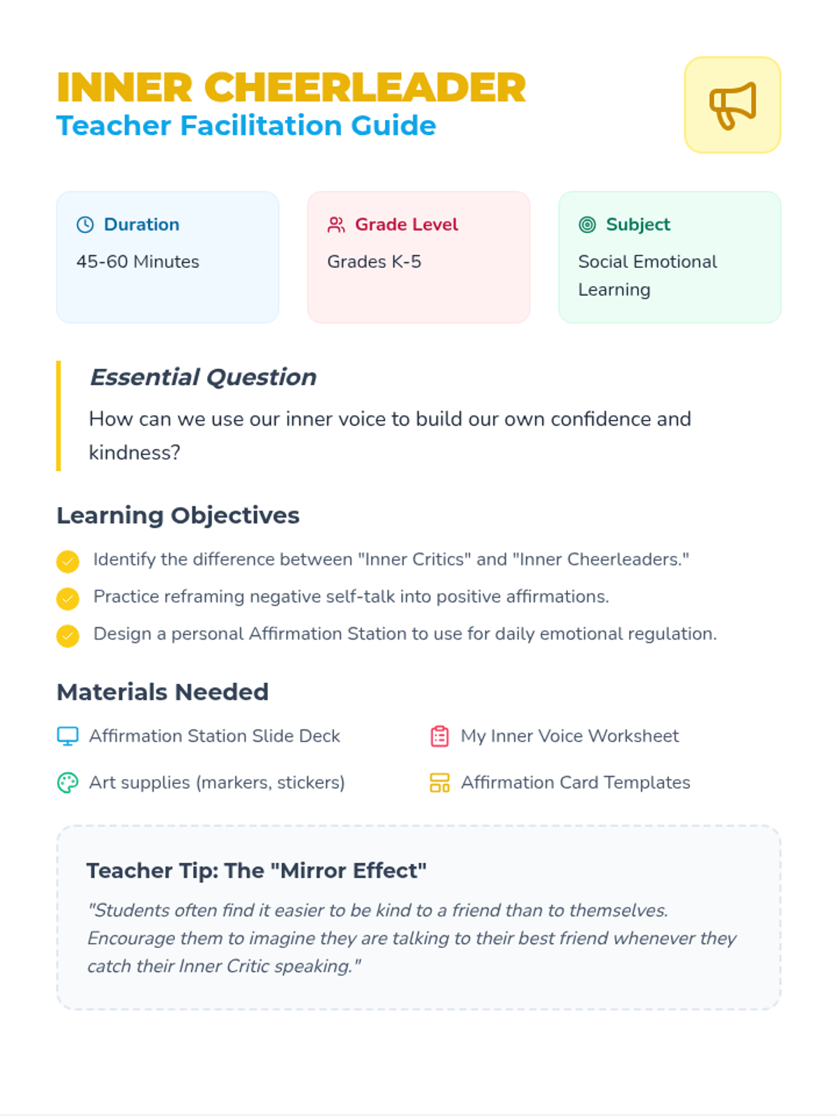 This lesson introduces students to positive self-talk and affirmations to boost confidence. Students learn to reframe negative thoughts and create a personal 'affirmation station' of supportive phrases.