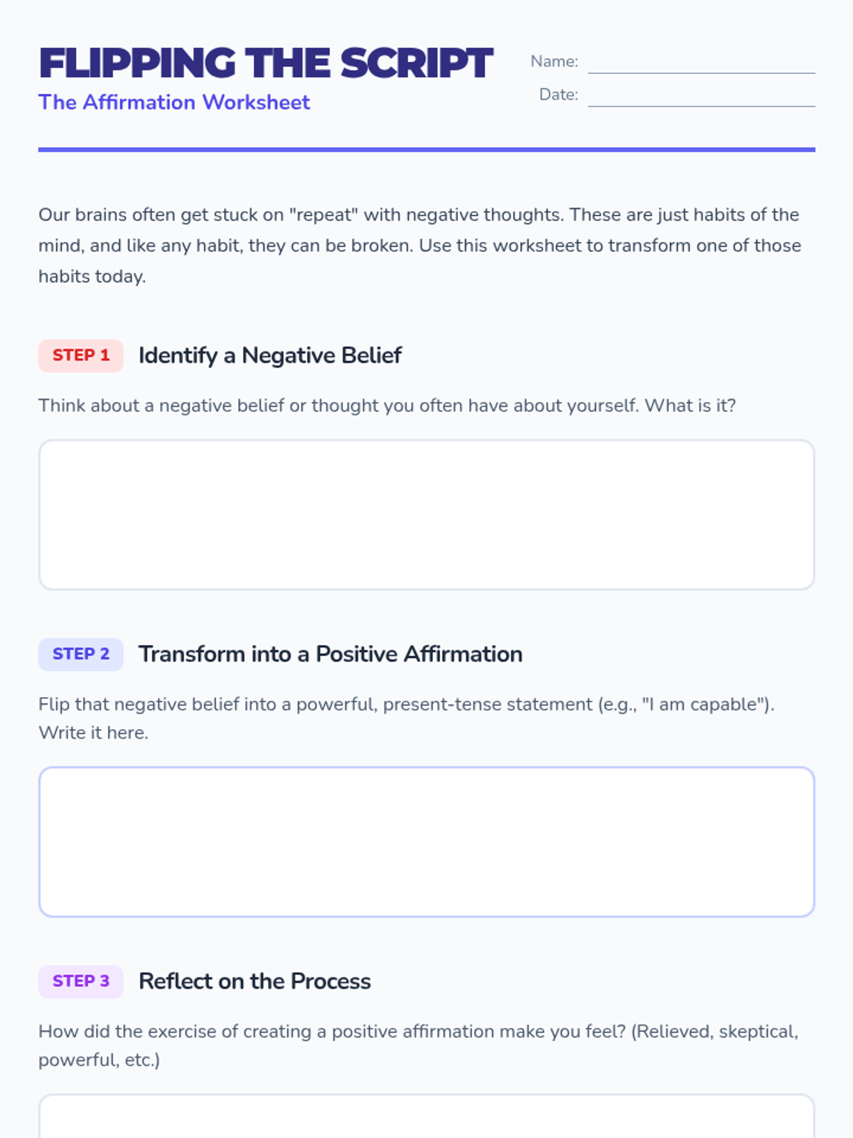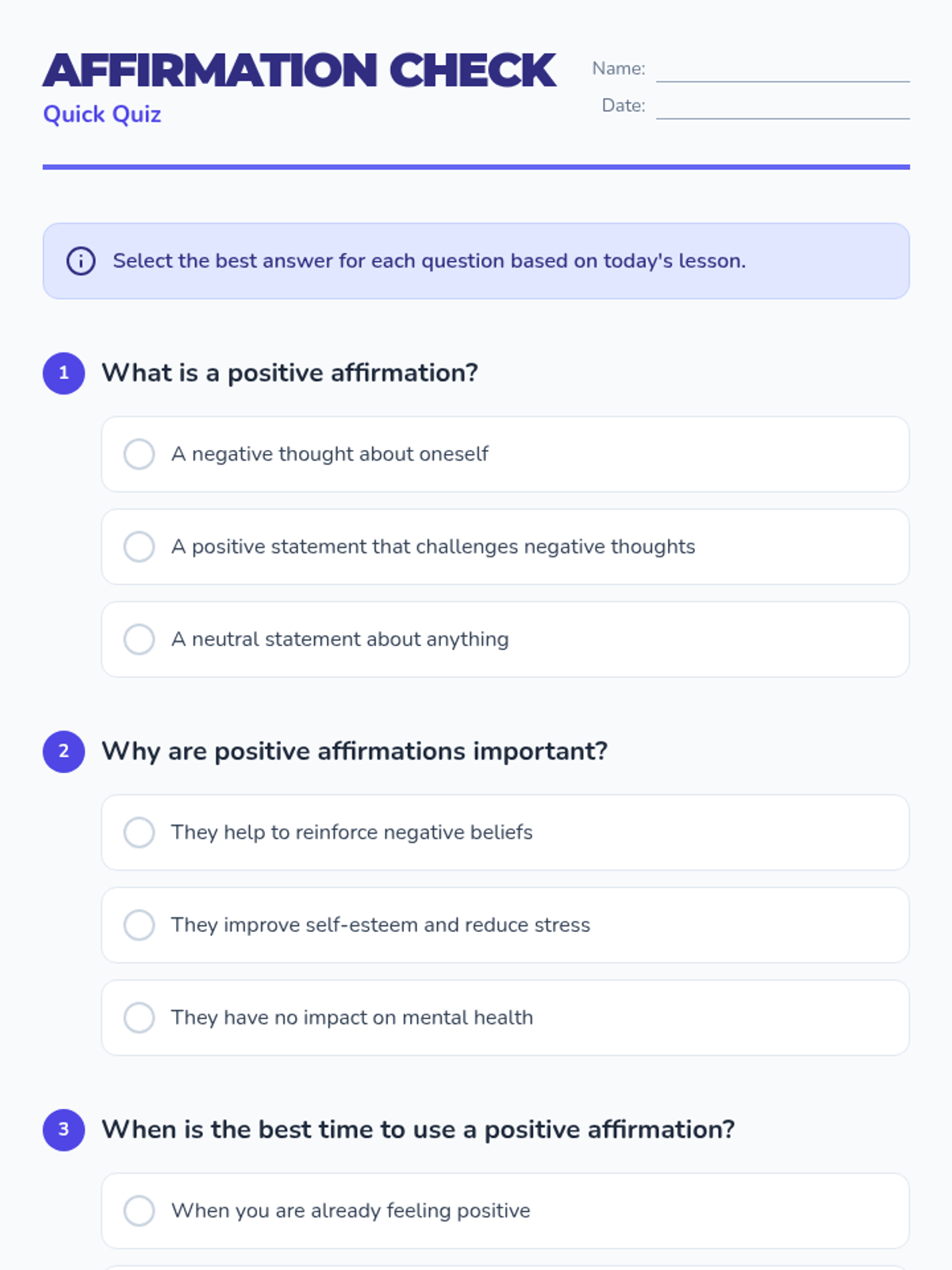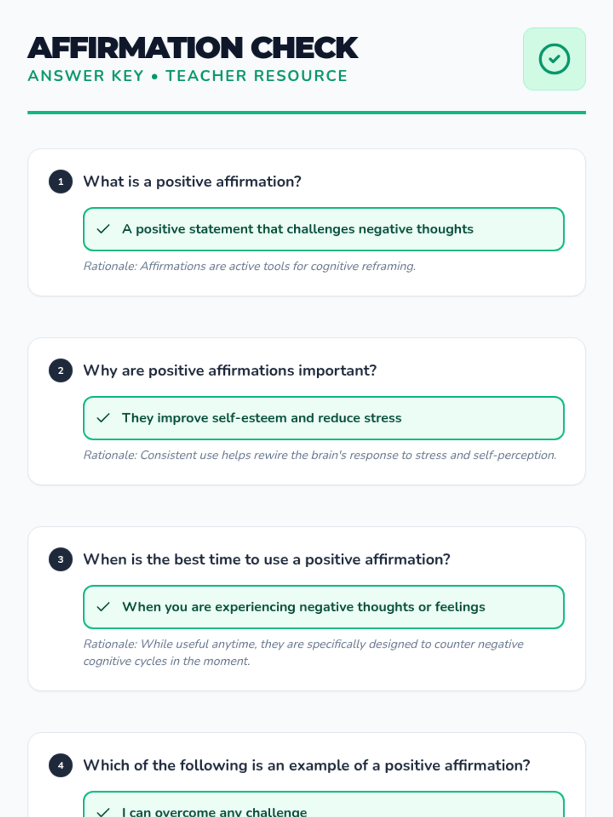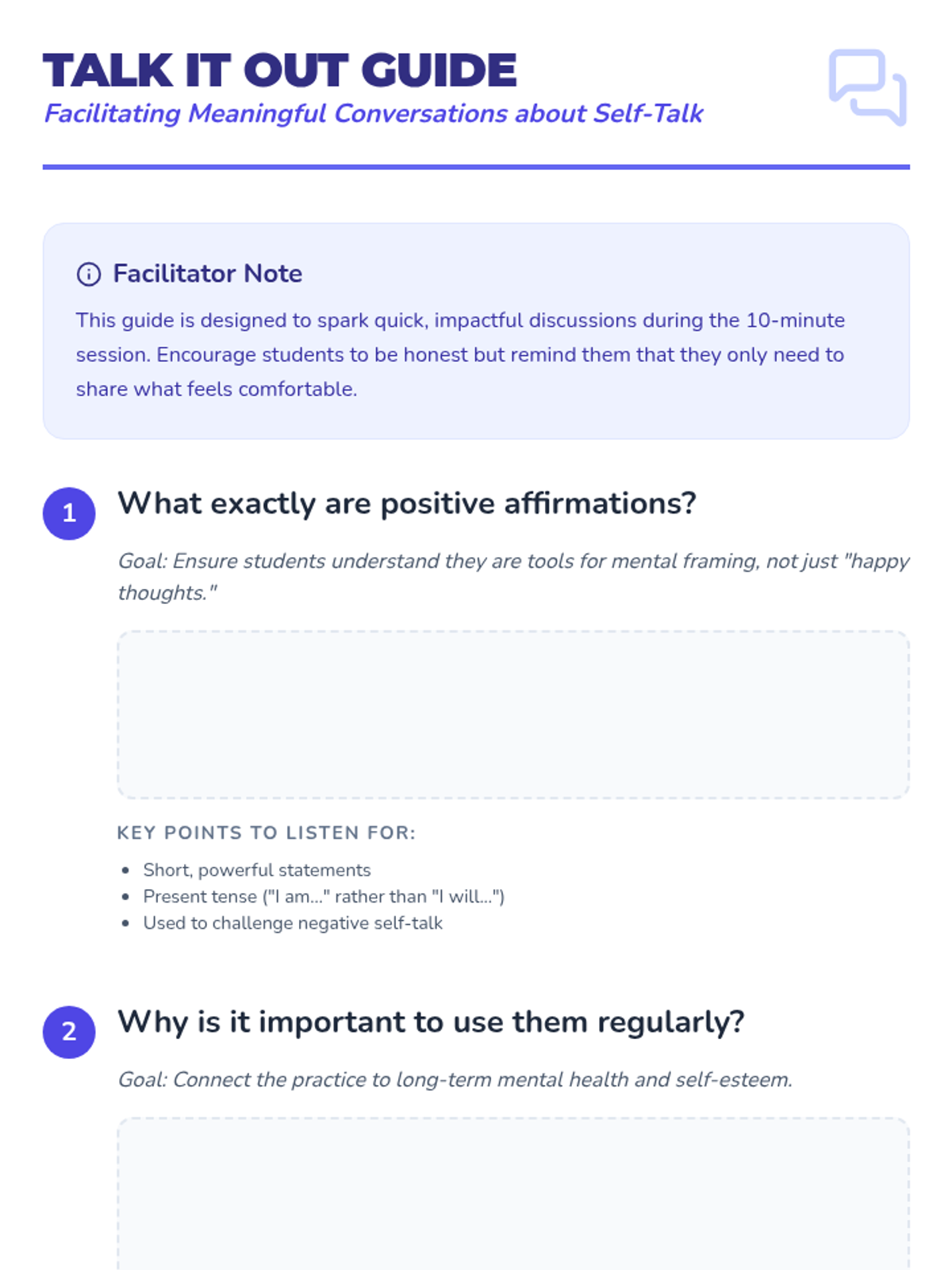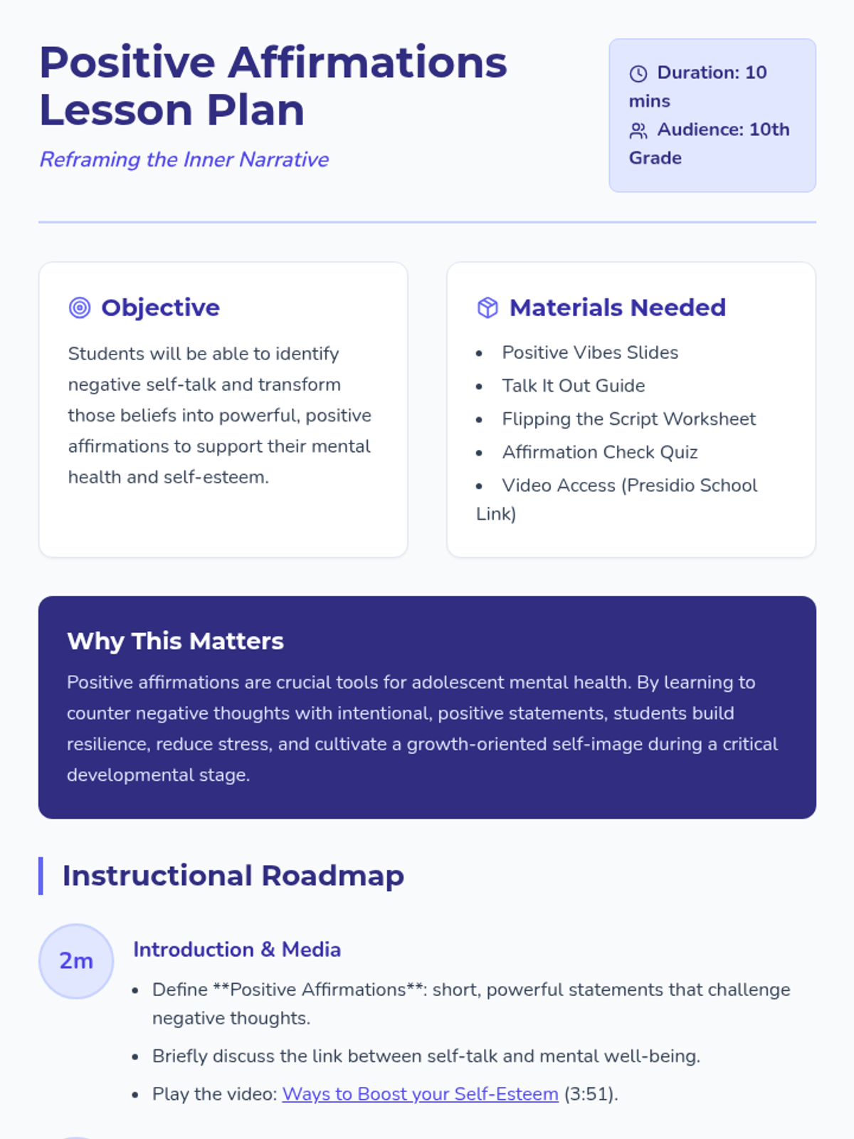 A quick, 10-minute session for 10th graders to understand, create, and practice positive affirmations to improve mental well-being and challenge negative self-talk.