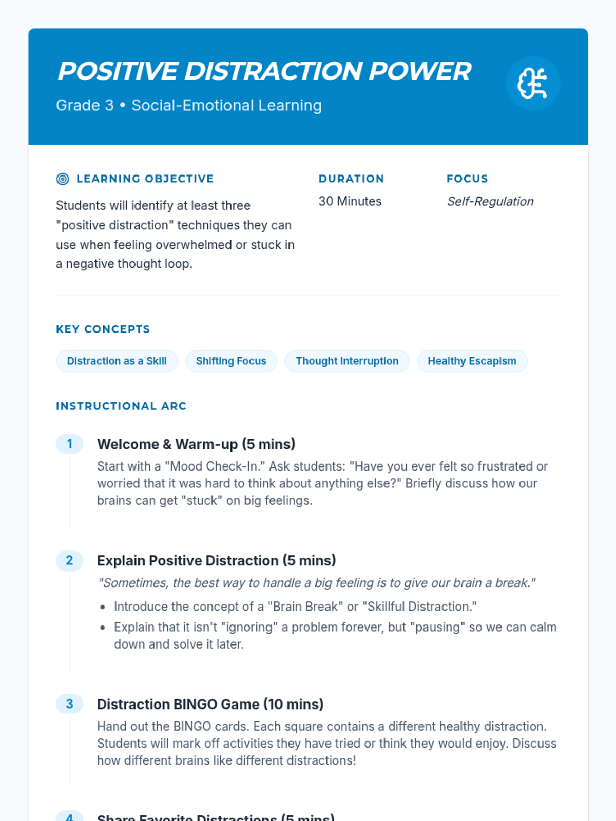 A 30-minute social-emotional learning lesson for 3rd graders on using positive distraction to manage big feelings. Students explore various activities to shift their focus and build a personalized toolkit of regulation strategies.