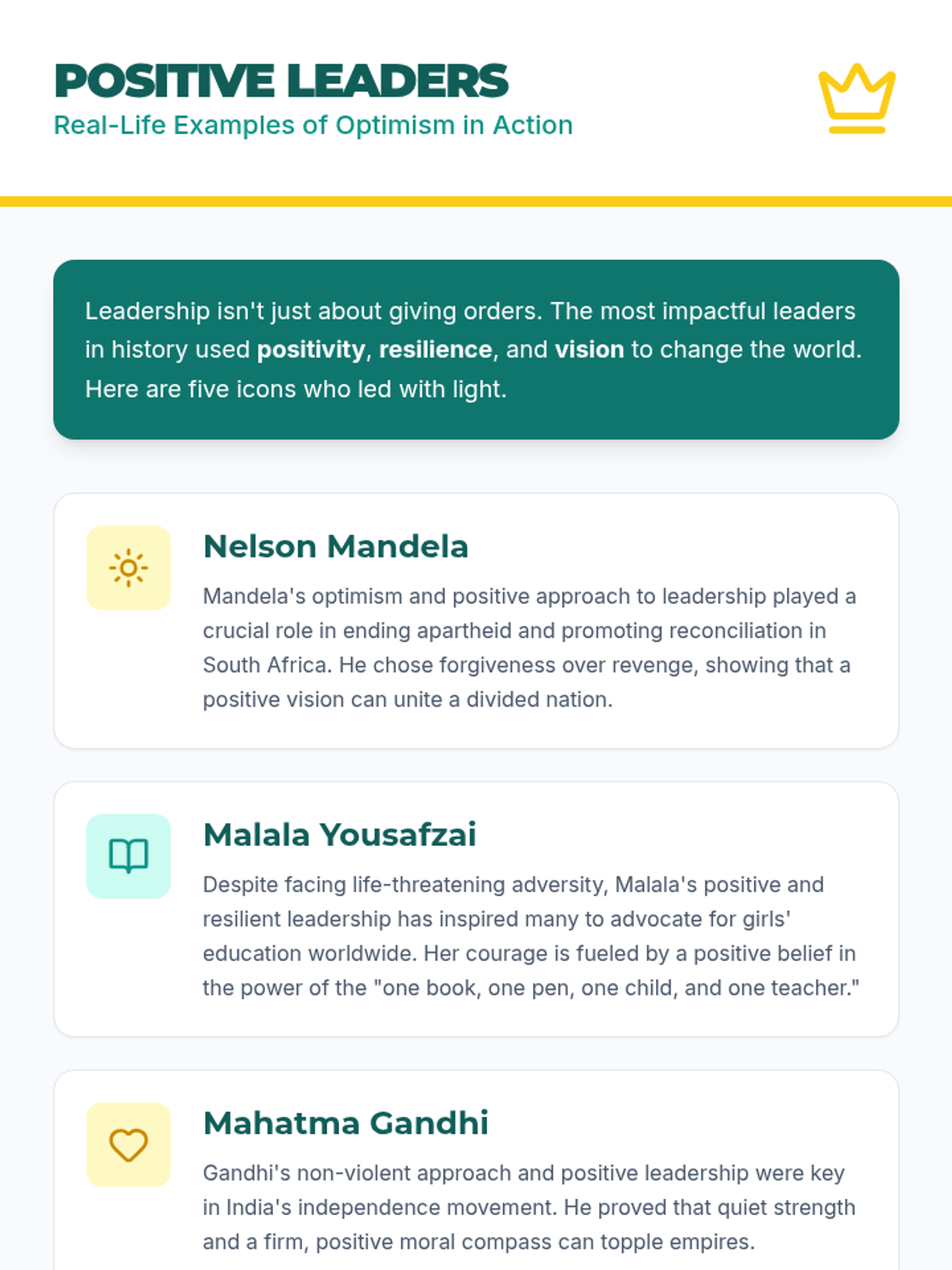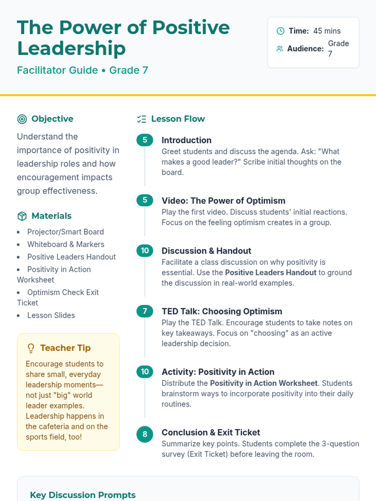 A 45-minute lesson for 7th-grade students exploring the impact of optimism and encouragement on leadership effectiveness through video analysis, discussion, and reflective activities.