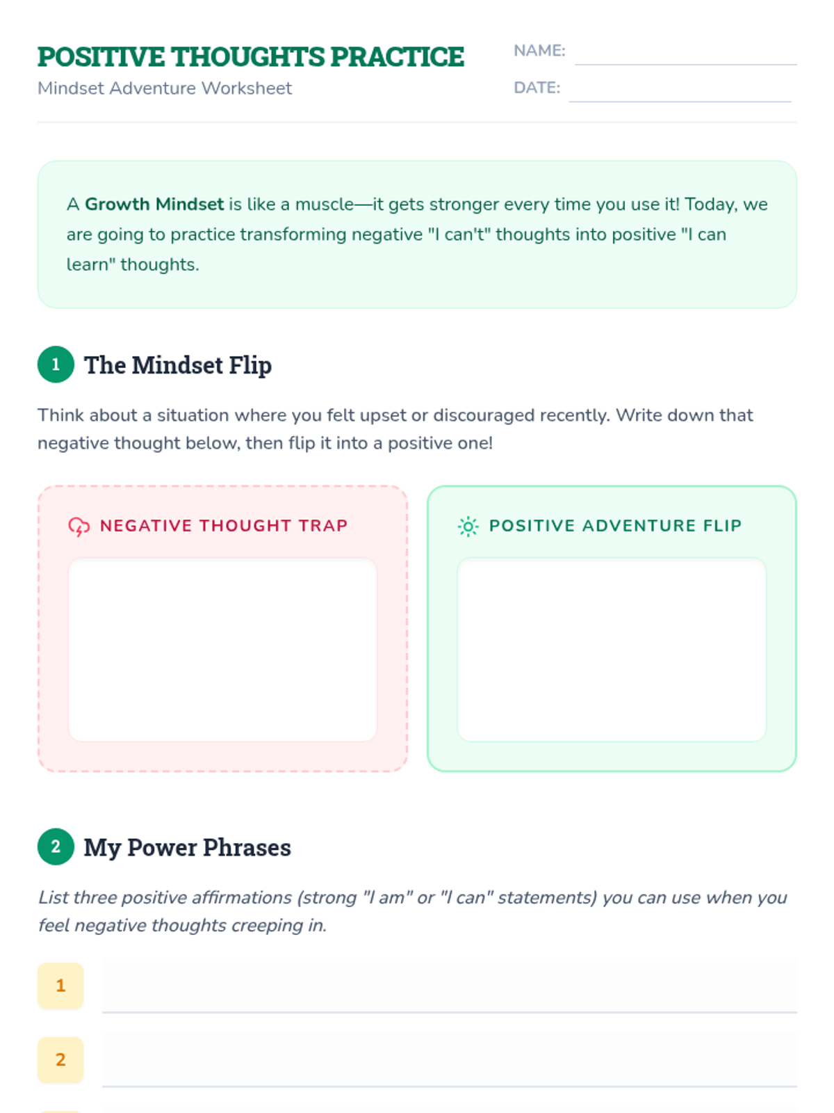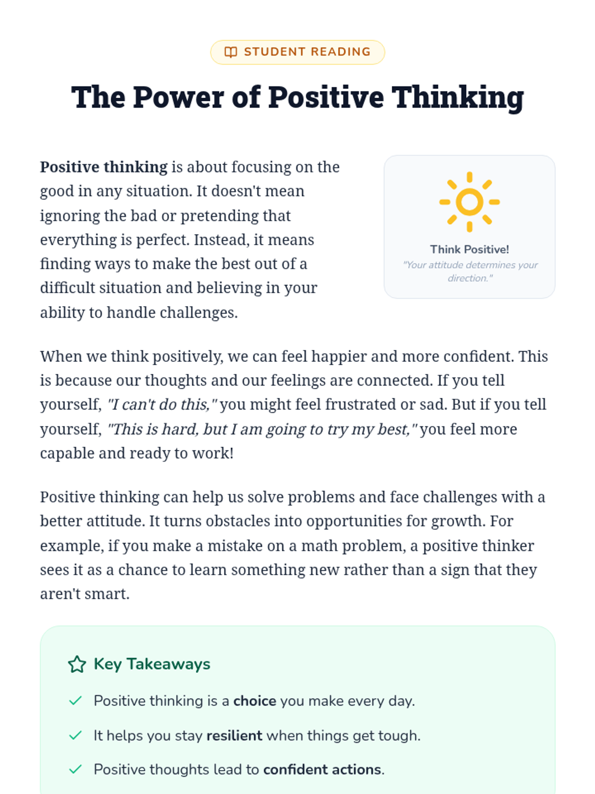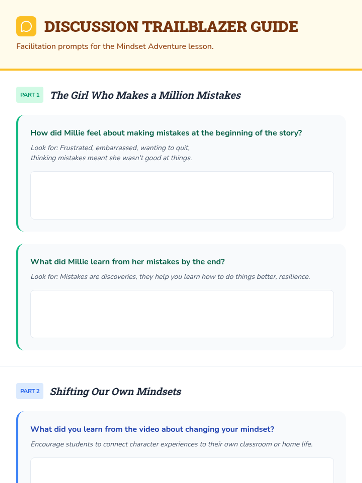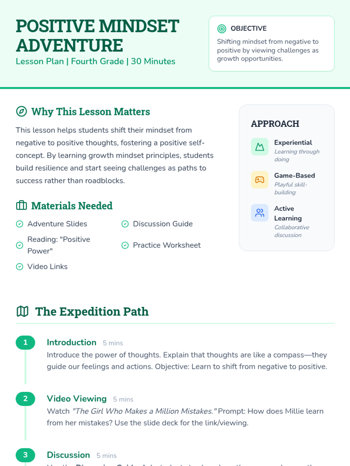A fourth-grade lesson focused on shifting from negative to positive mindsets through stories, discussions, and reflective activities. Students learn to view challenges as opportunities and develop self-compassion.