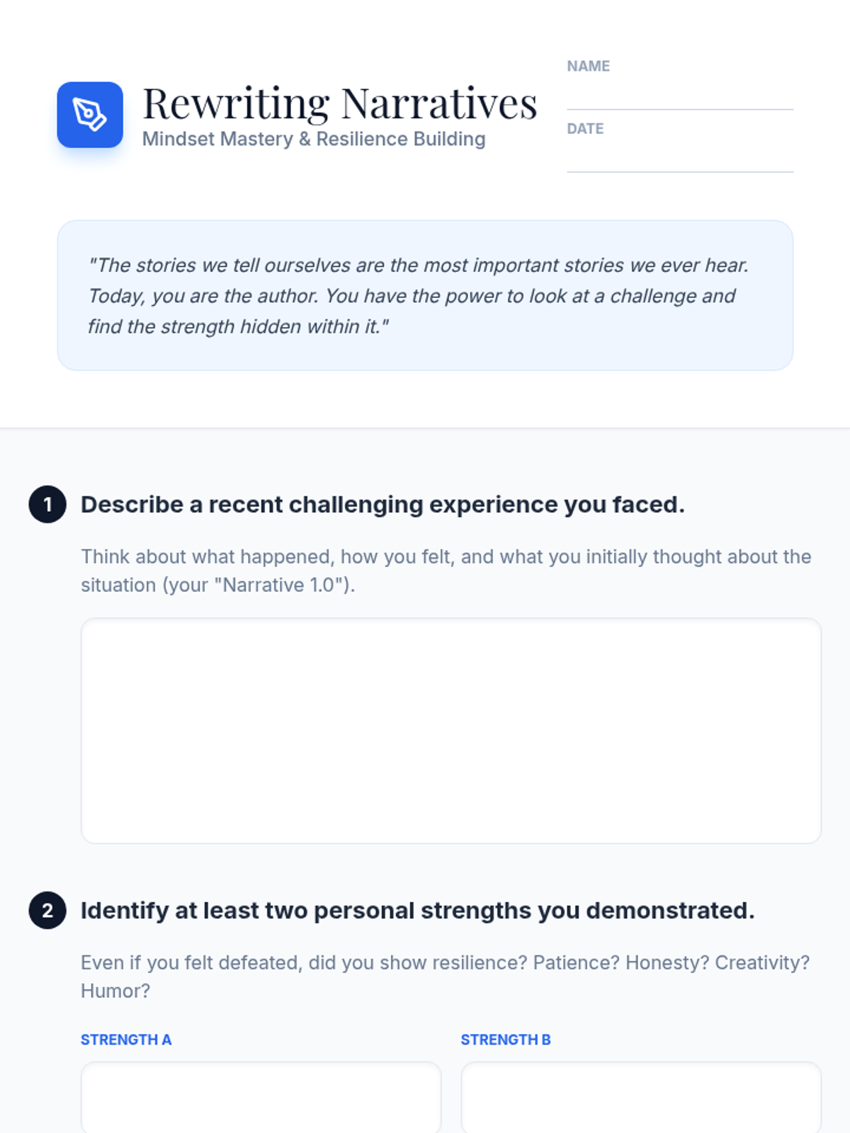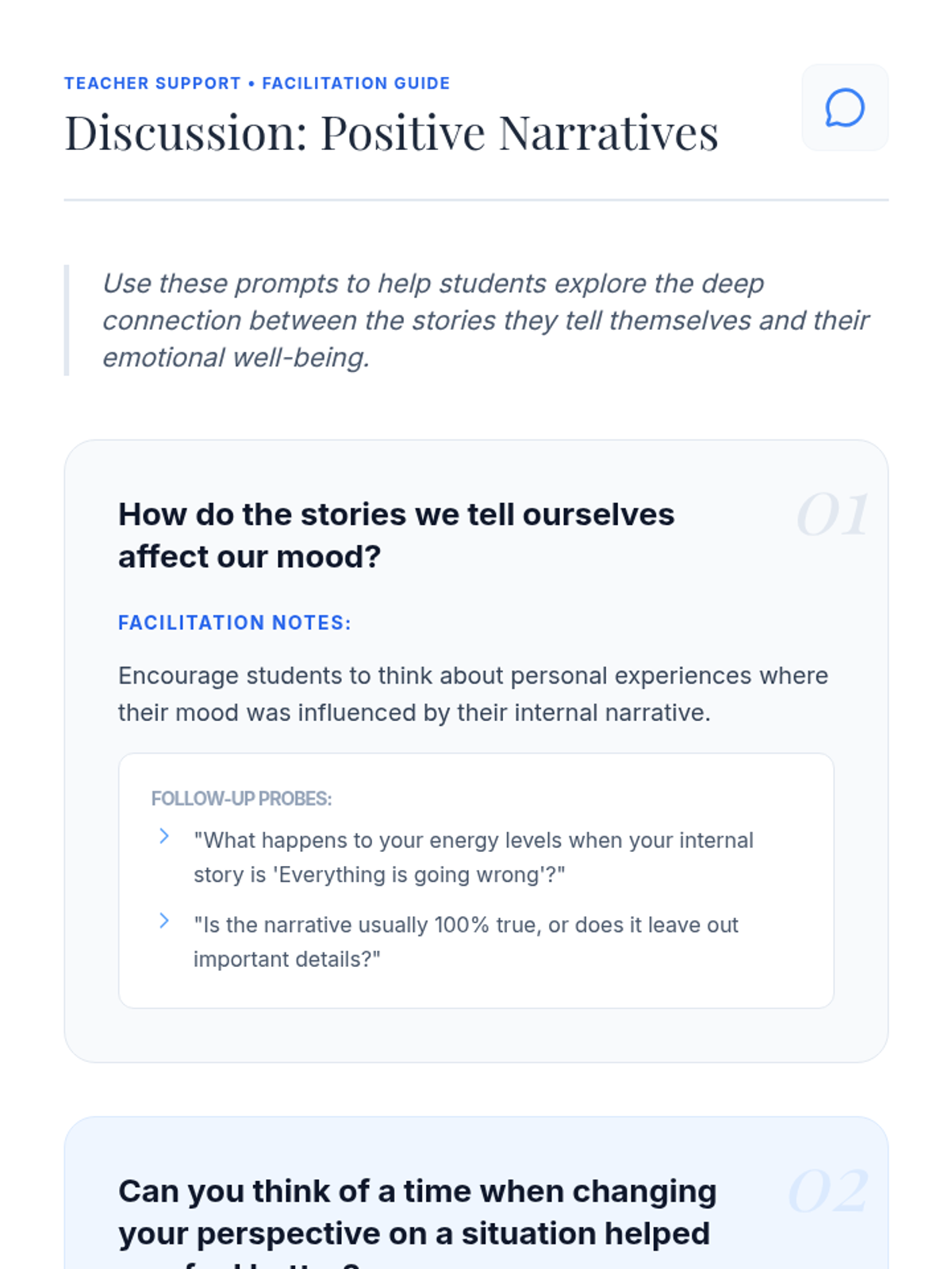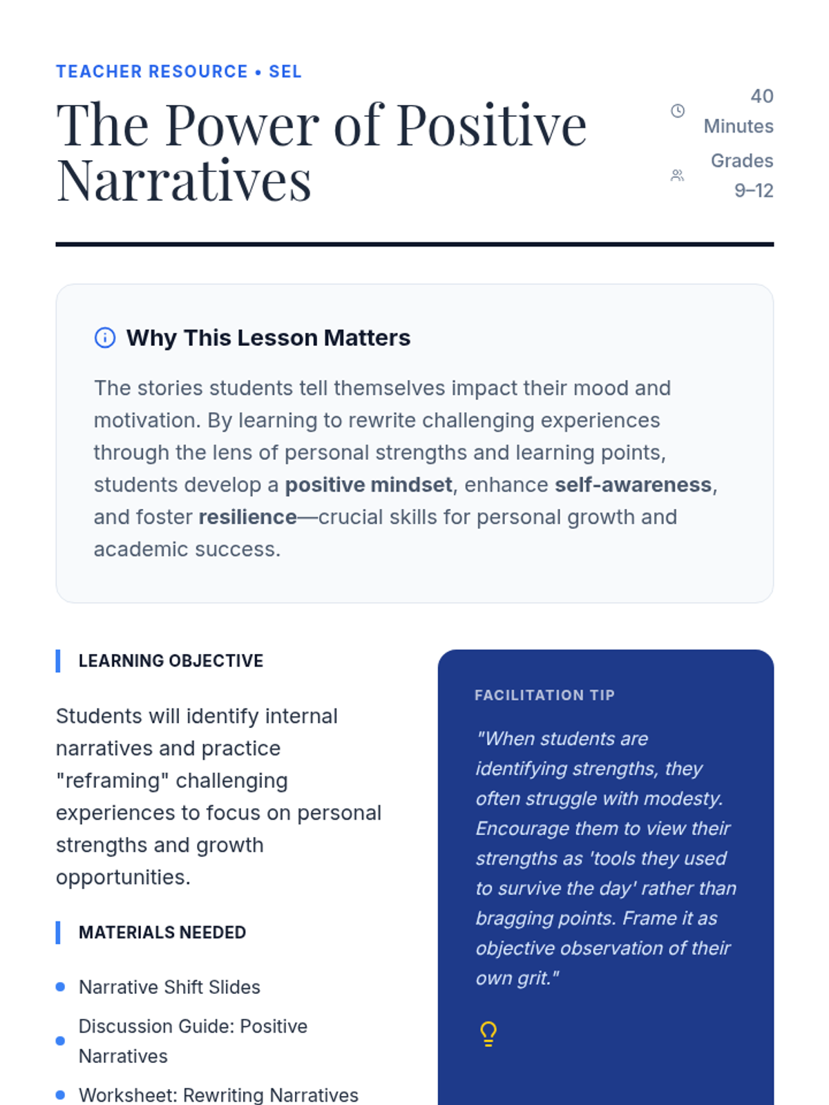 A lesson for high school students to explore the impact of internal narratives on mood and motivation, teaching them to reframe challenges through personal strengths and growth.
