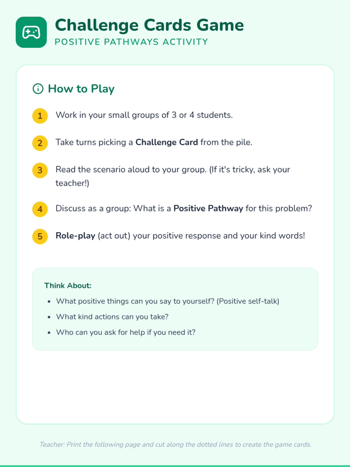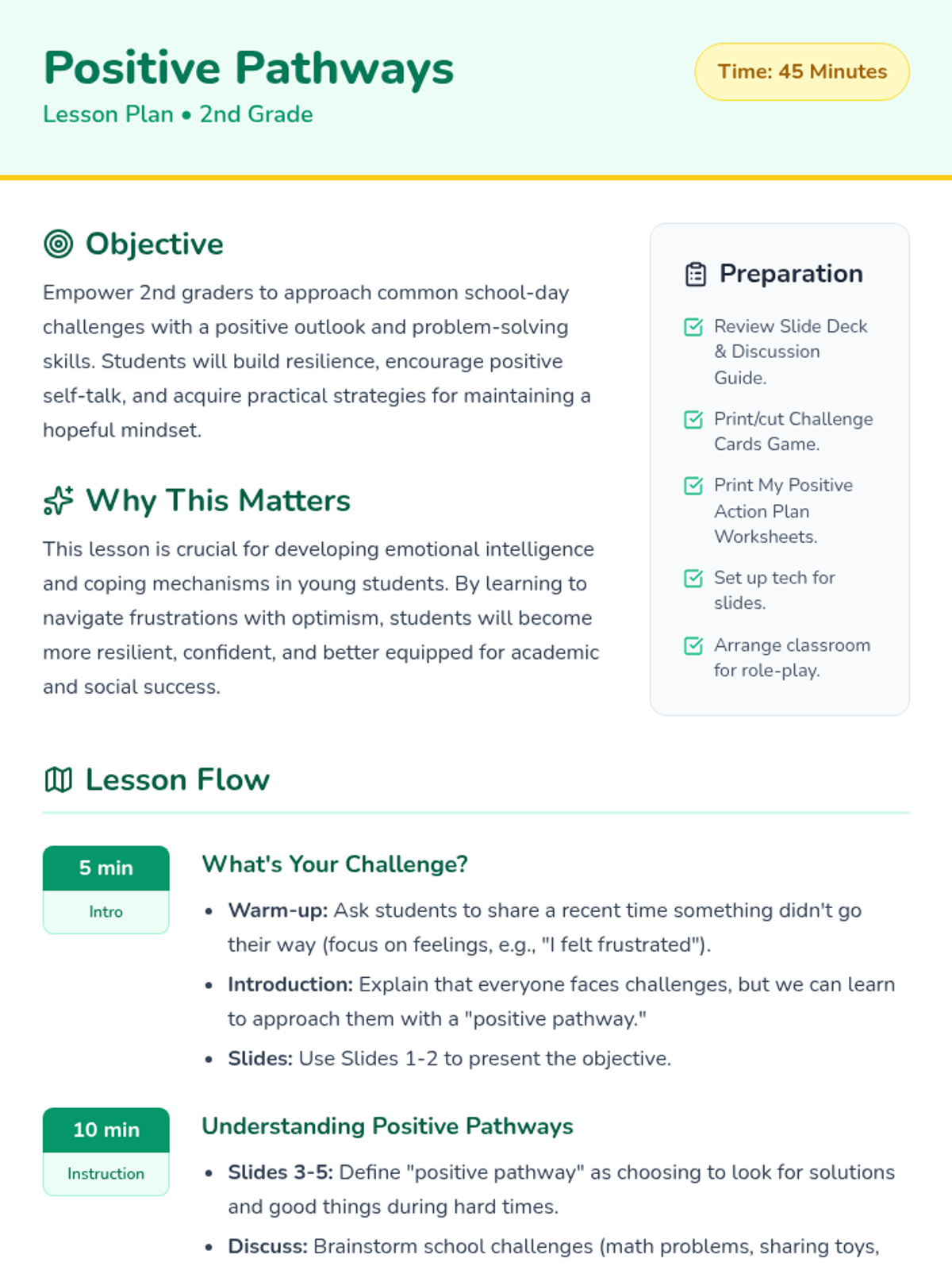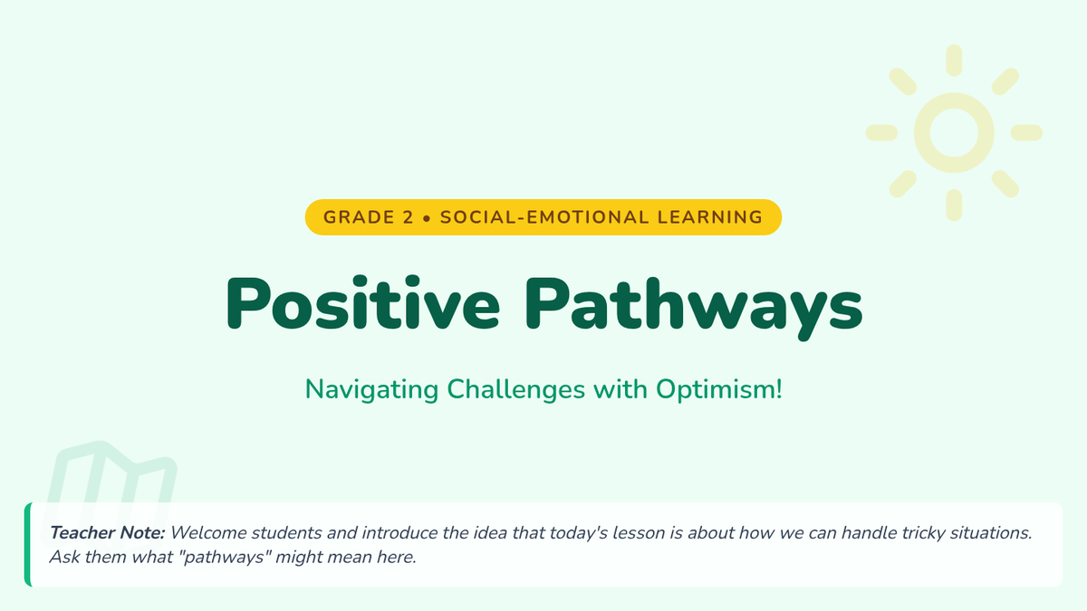 A 45-minute lesson for 2nd graders to develop resilience and a positive outlook by identifying school-day challenges and practicing positive self-talk and problem-solving.