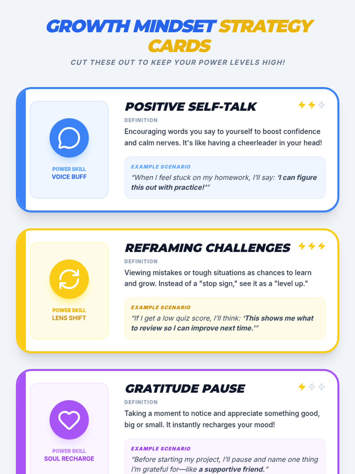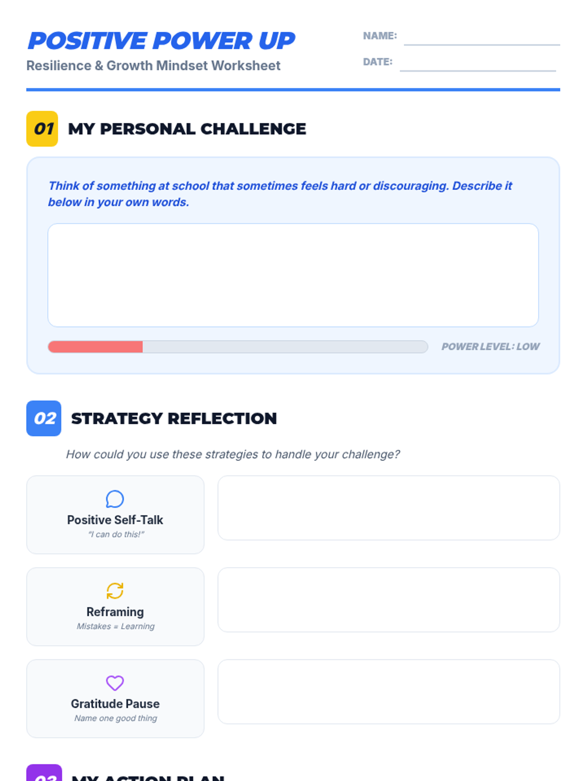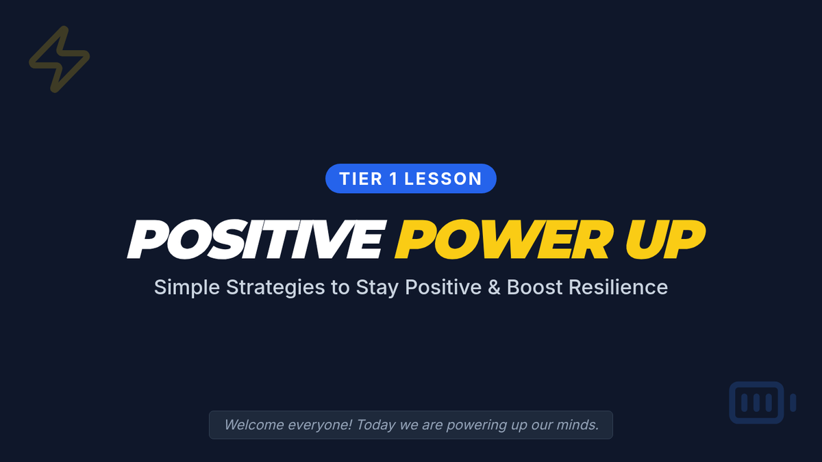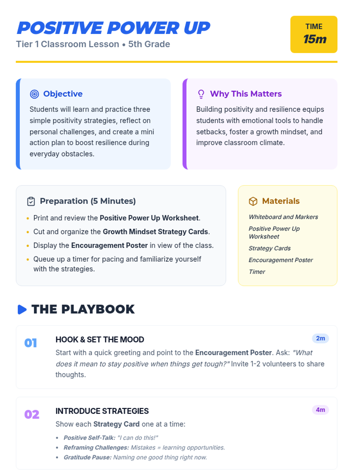 A quick, 15-minute Tier 1 classroom lesson for 5th graders focused on building resilience and optimism through simple positivity strategies like self-talk, reframing, and gratitude.