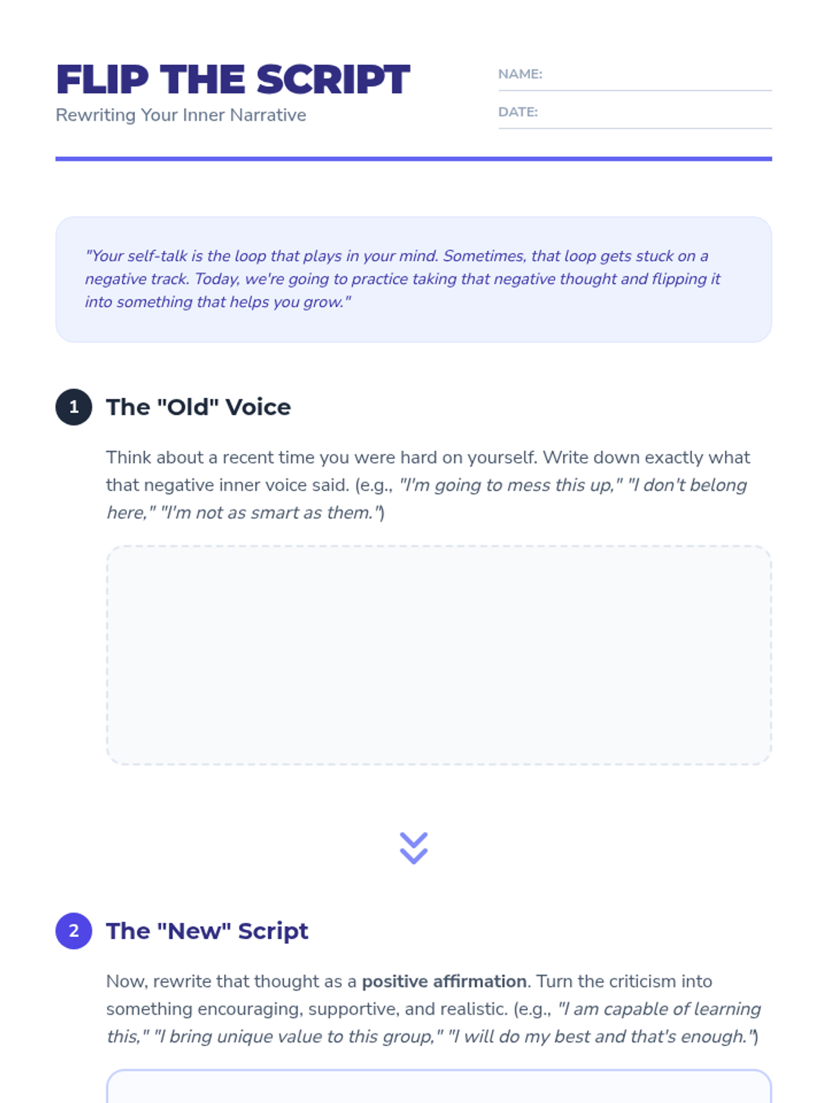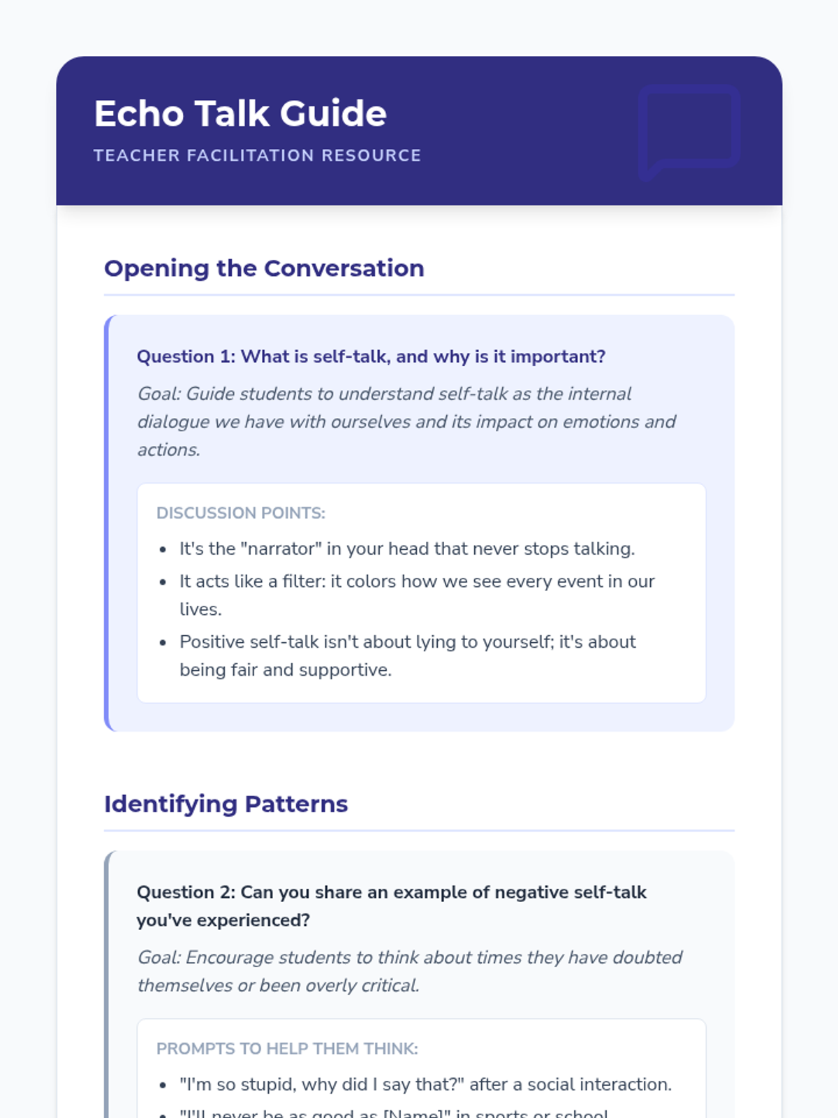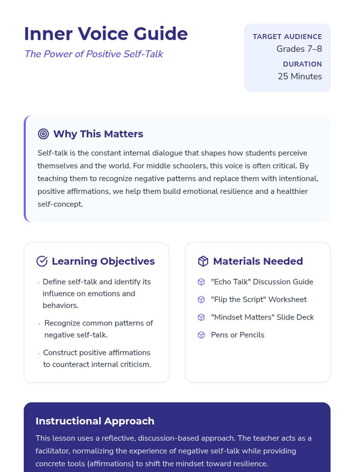 This lesson guides students in understanding the importance of self-talk and how it affects their overall well-being. Through group discussion and personal reflection activities, students learn to recognize negative self-talk patterns and practice replacing them with positive affirmations. This lesson is crucial for fostering a positive mindset and improving students' emotional resilience.