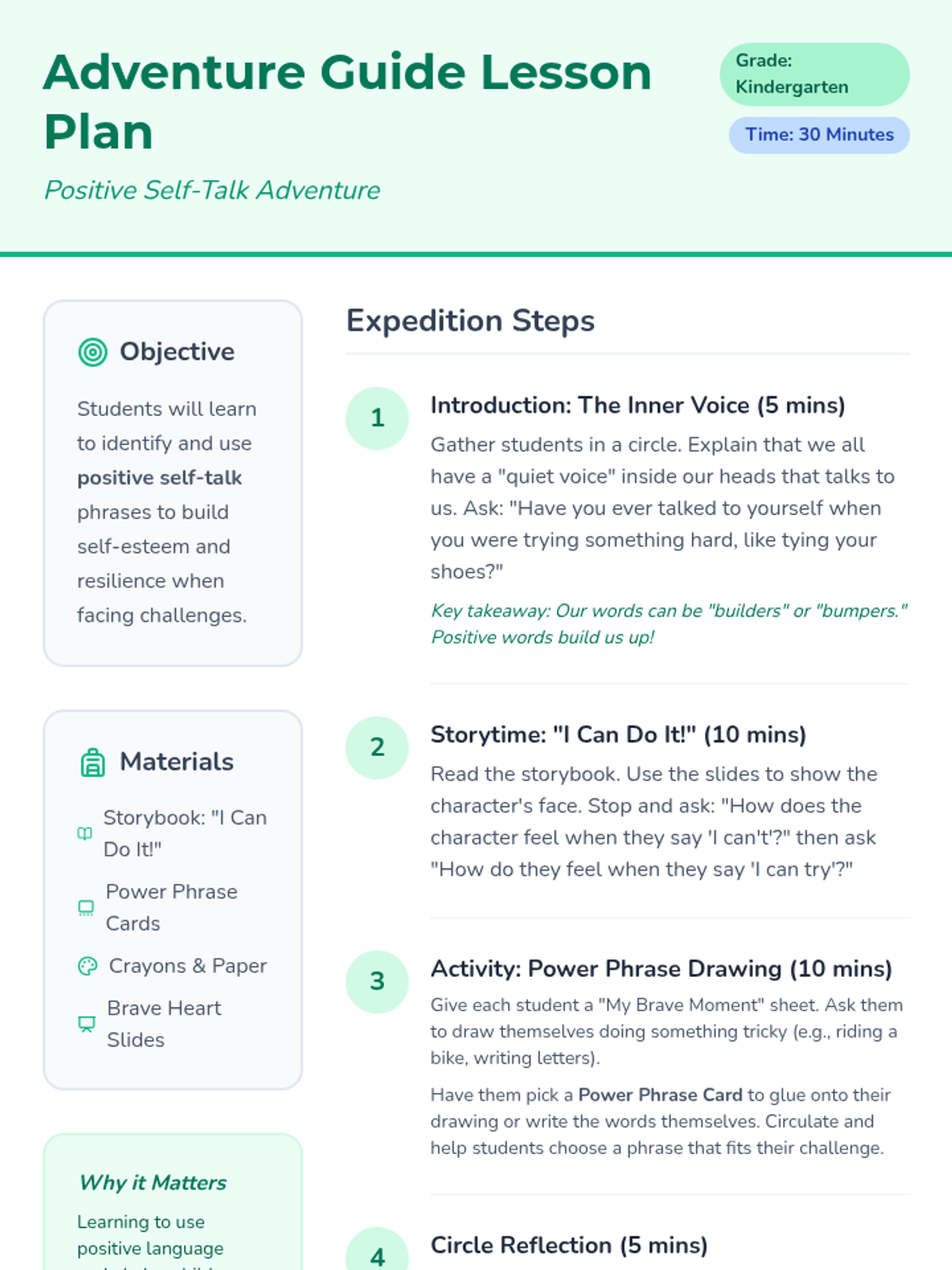 This lesson introduces kindergarten students to the concept of positive self-talk through storytelling and interactive activities. By learning to use positive language, students can build self-esteem and resilience, which are crucial for their emotional development and social interactions.