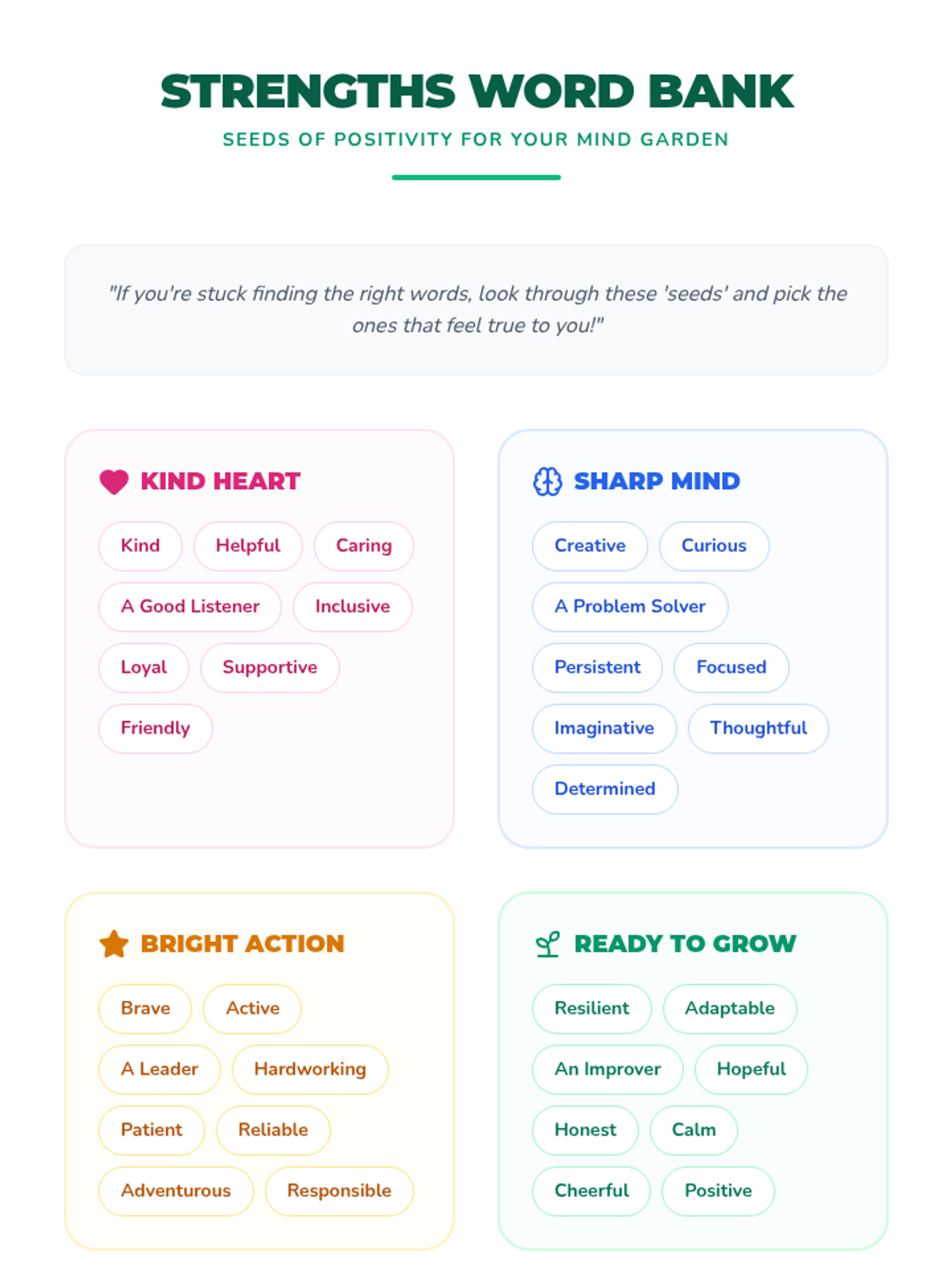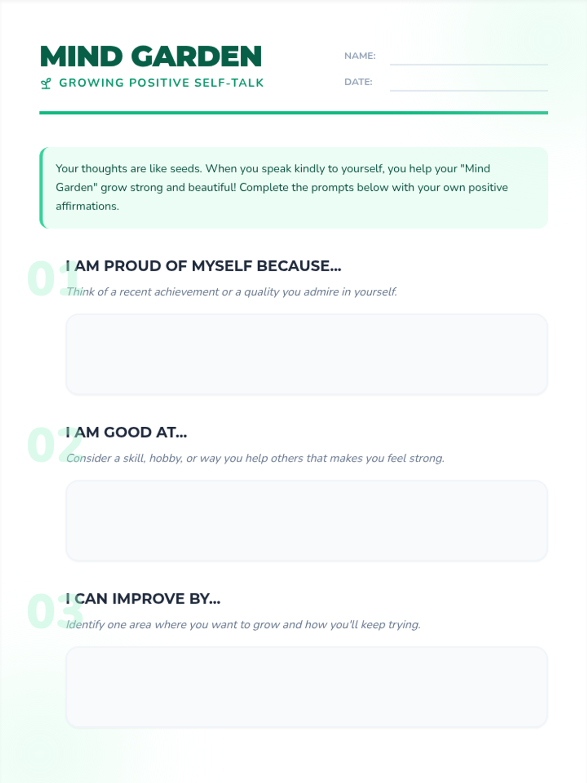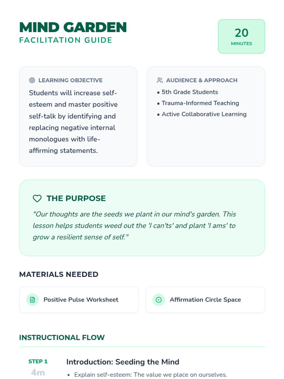 A lesson designed to help 5th graders recognize and replace negative thoughts with positive affirmations, fostering emotional resilience and self-esteem through a 'Brain Garden' metaphor.