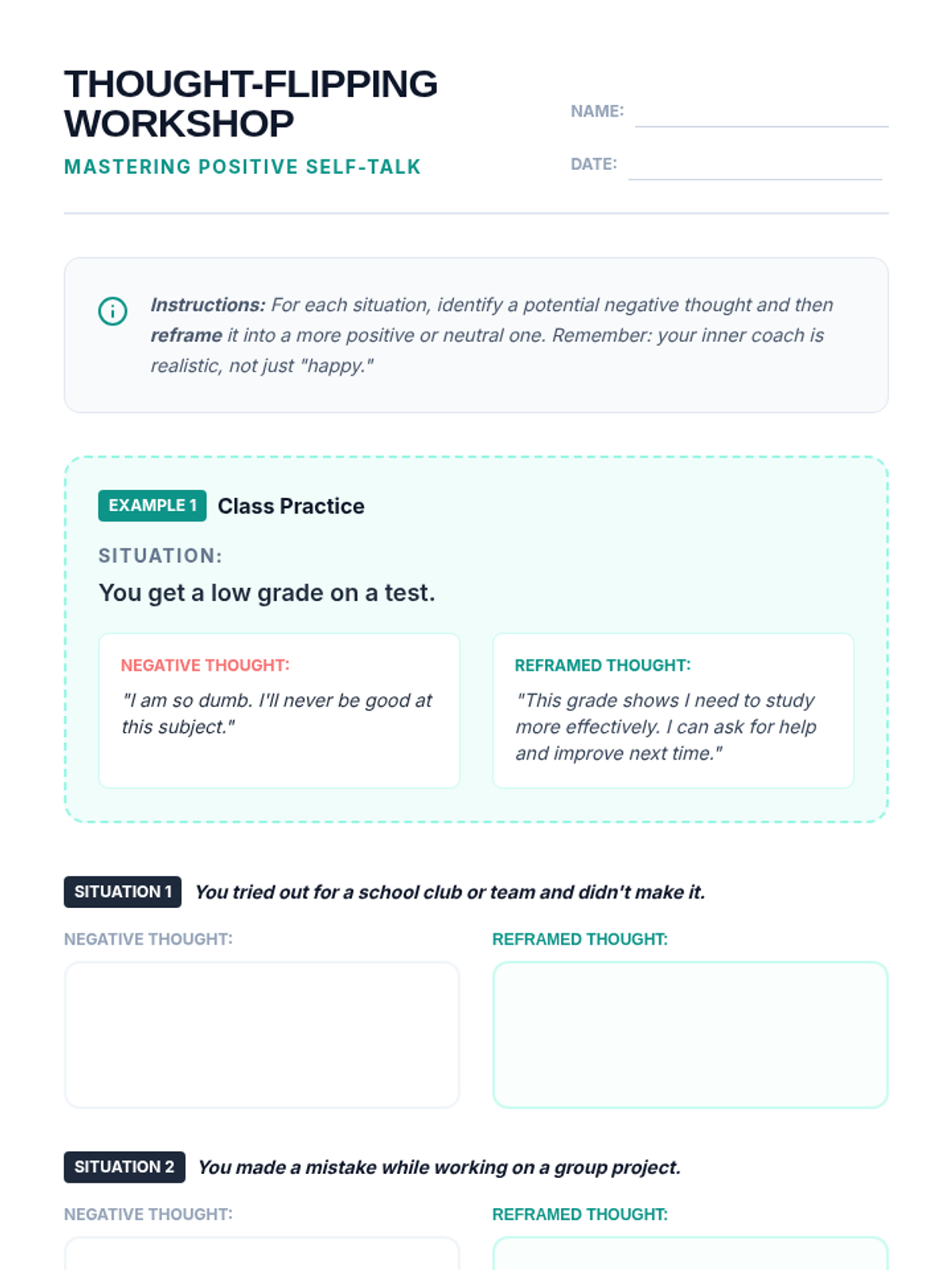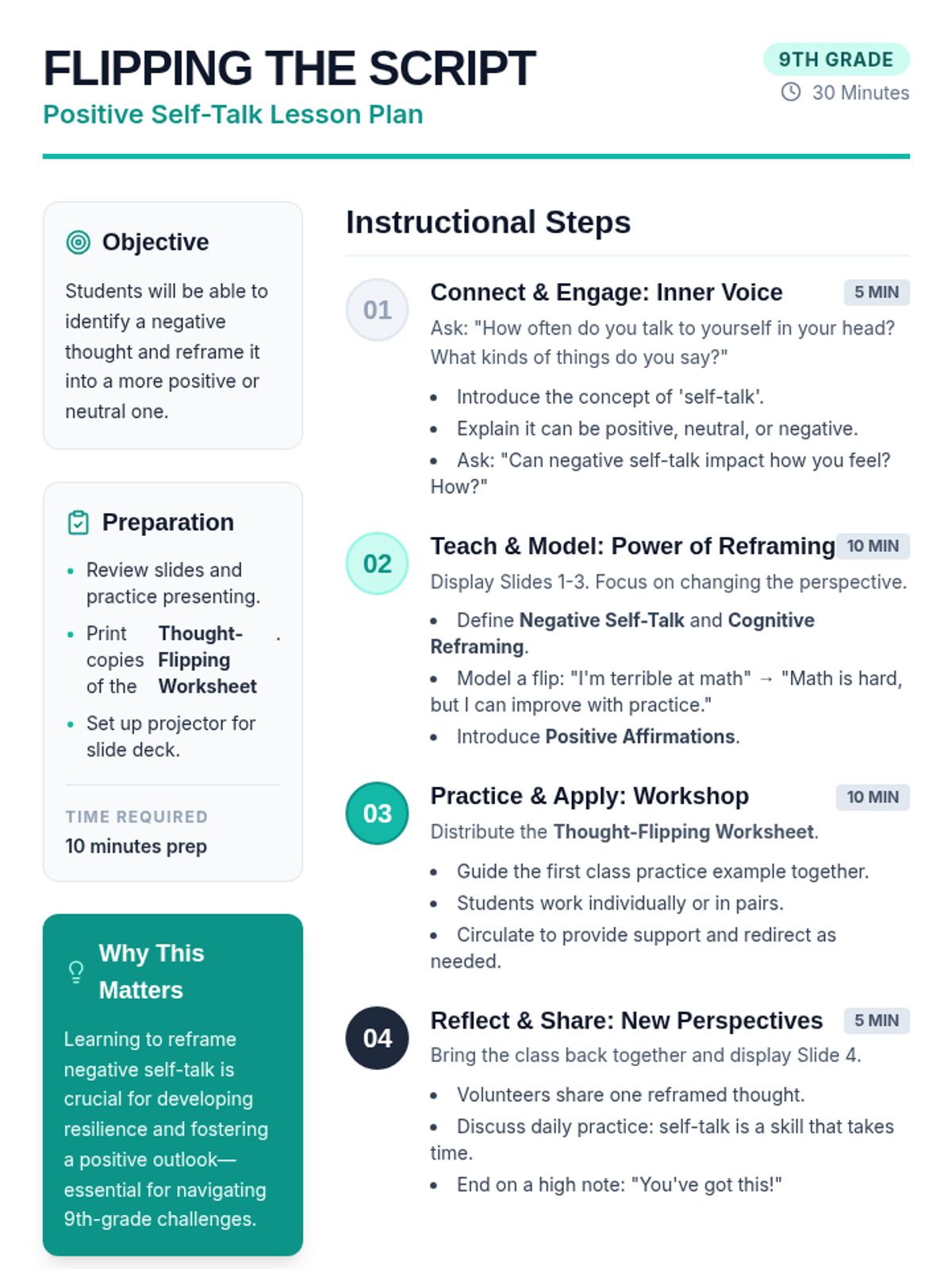 A 30-minute lesson for 9th-grade students focused on identifying and reframing negative thoughts using cognitive reframing and positive affirmations. Students will learn to 'flip the script' of their inner monologue to build resilience and improve mental well-being.
