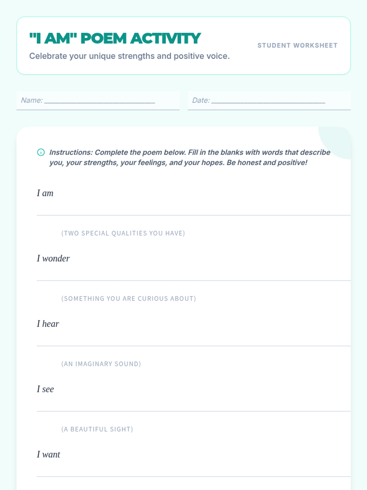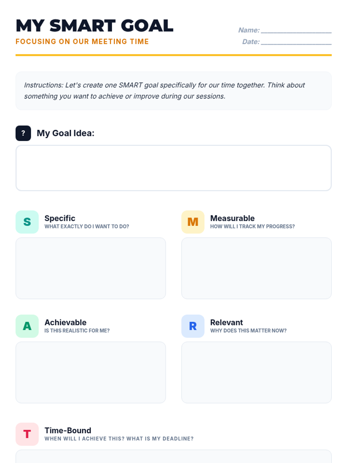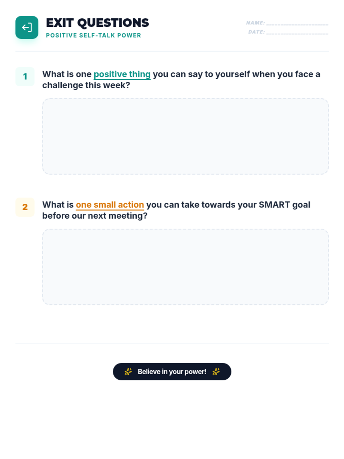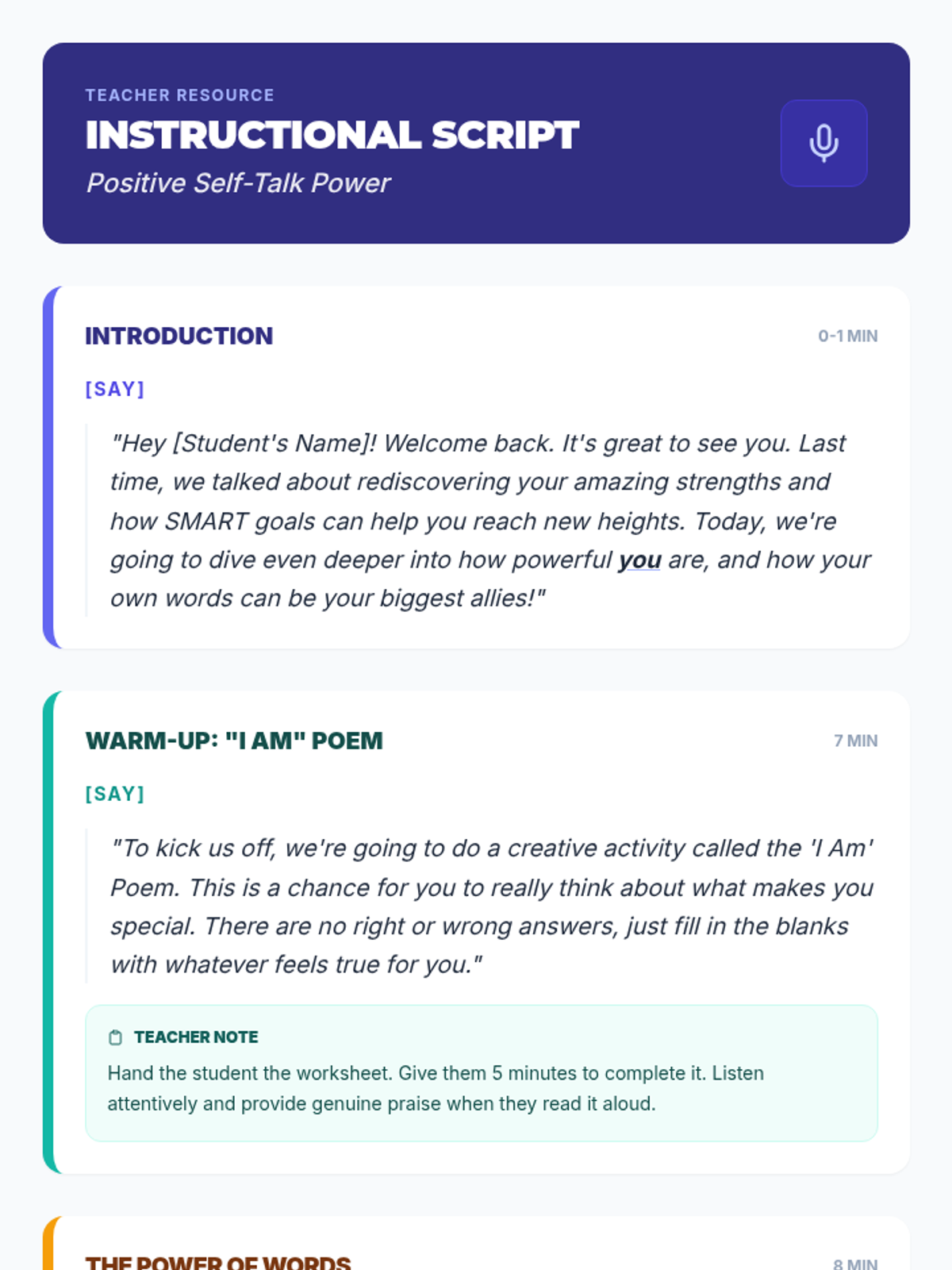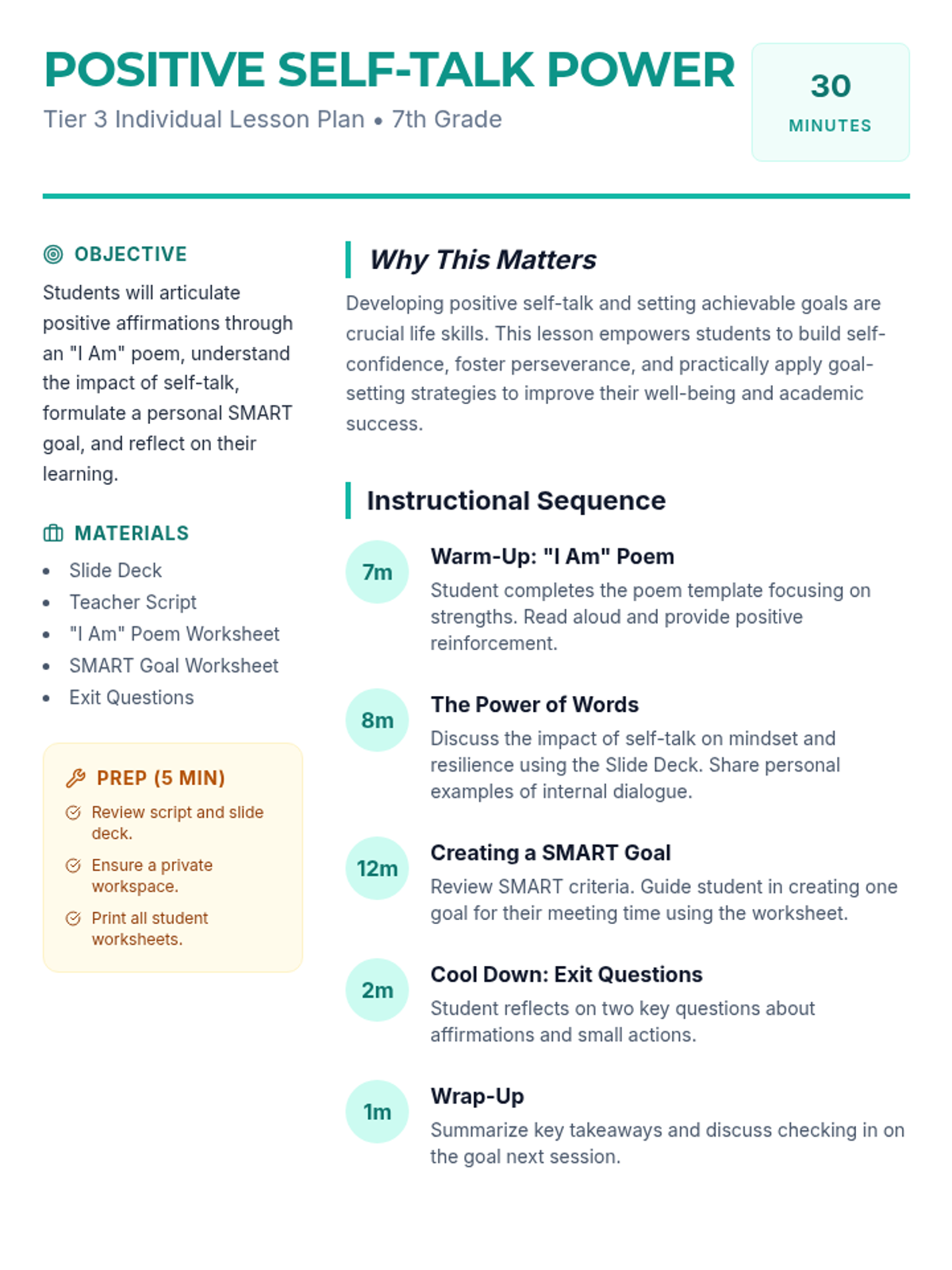 This 30-minute Tier 3 individual lesson for 7th graders focuses on developing positive self-talk and setting a SMART goal for the student's meeting time. It includes an 'I Am' poem activity to identify strengths and a guided worksheet to build a specific, actionable goal.