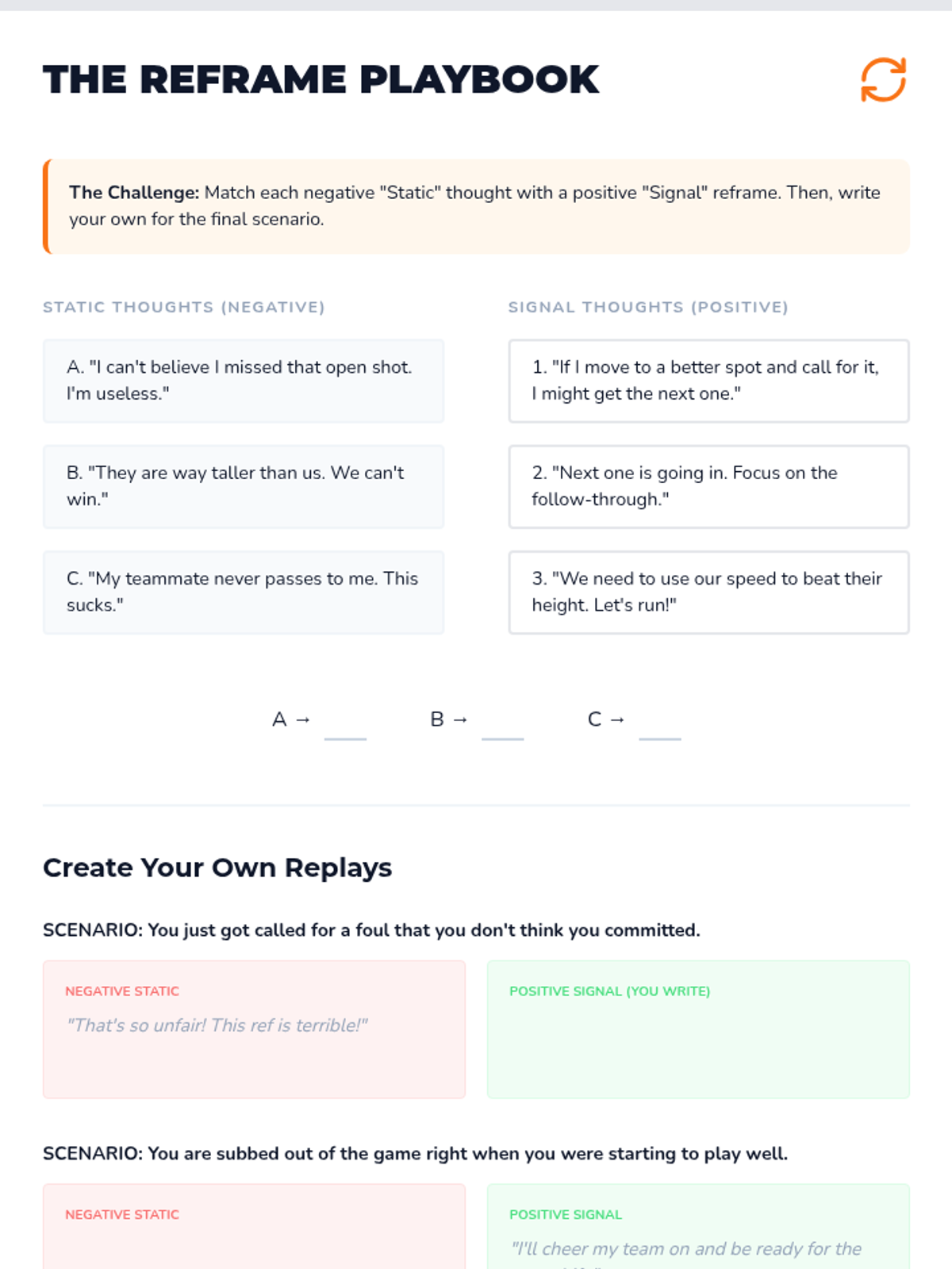 Students work on changing their internal monologue from negative to constructive. They practice reframing mistakes and using positive affirmations during active drills.