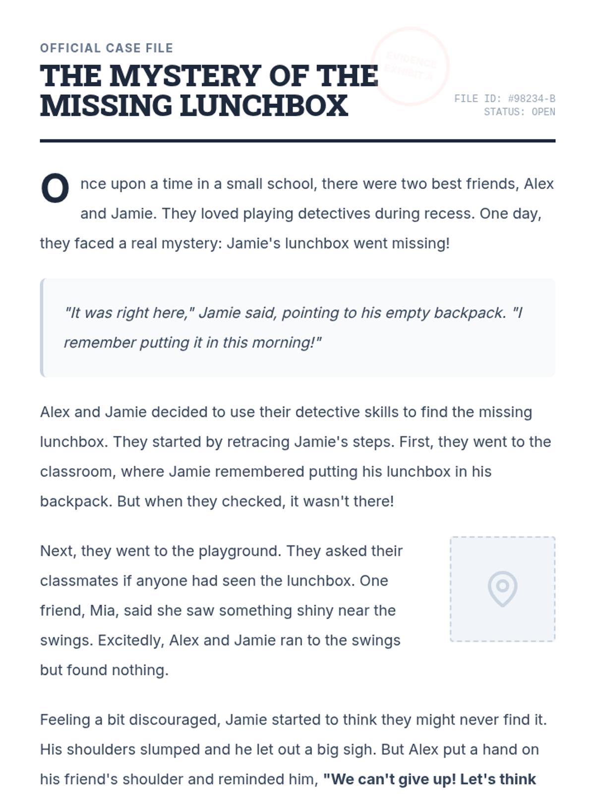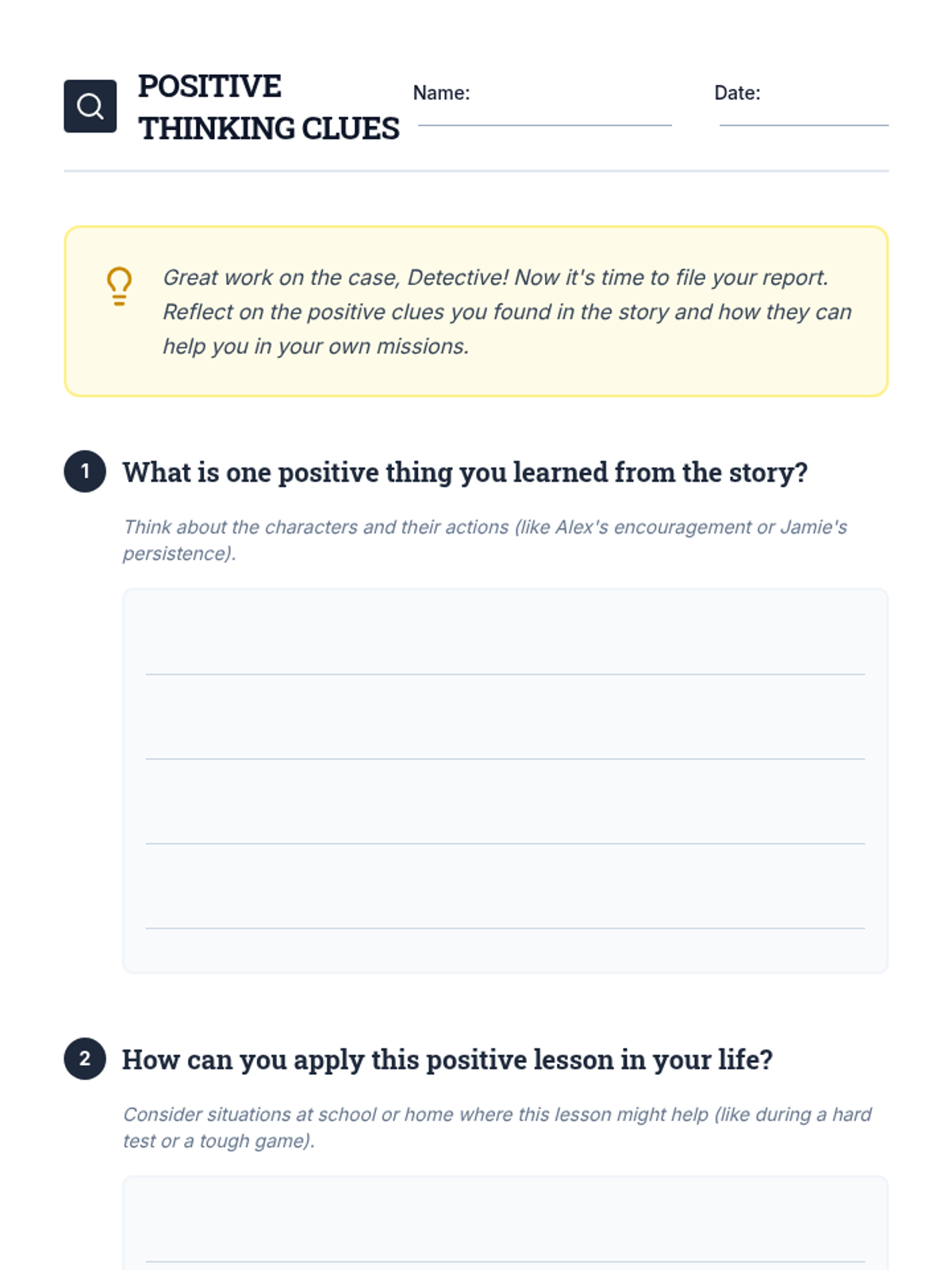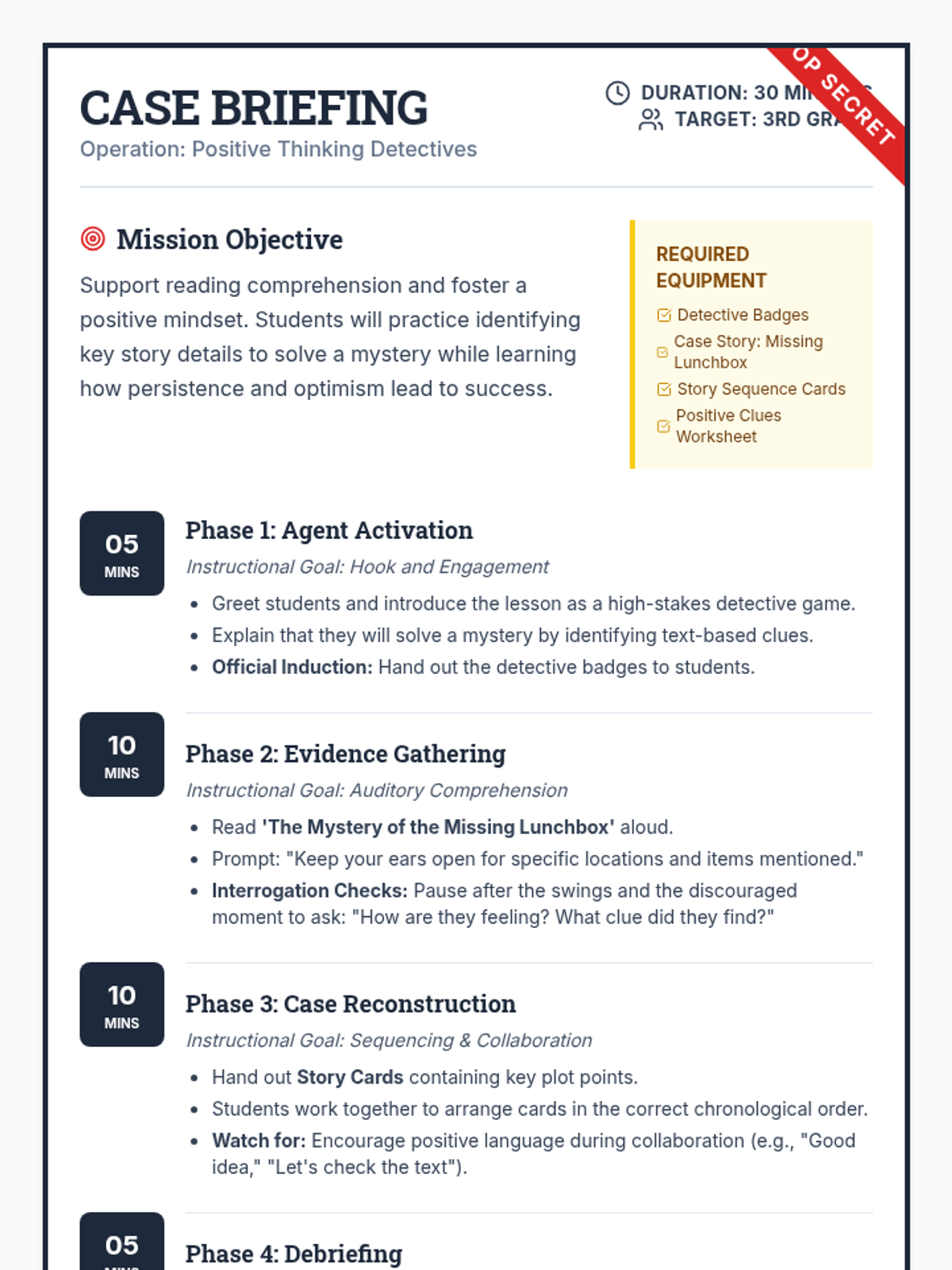 A fun, interactive detective-themed lesson for 3rd graders that combines reading comprehension with positive mindset exercises. Students solve the 'Mystery of the Missing Lunchbox' while learning how persistence and positive thinking lead to success.