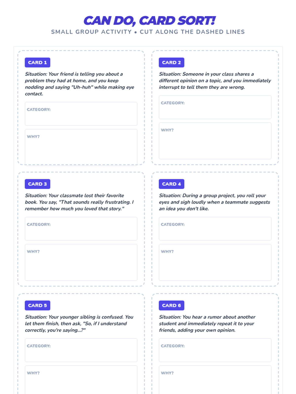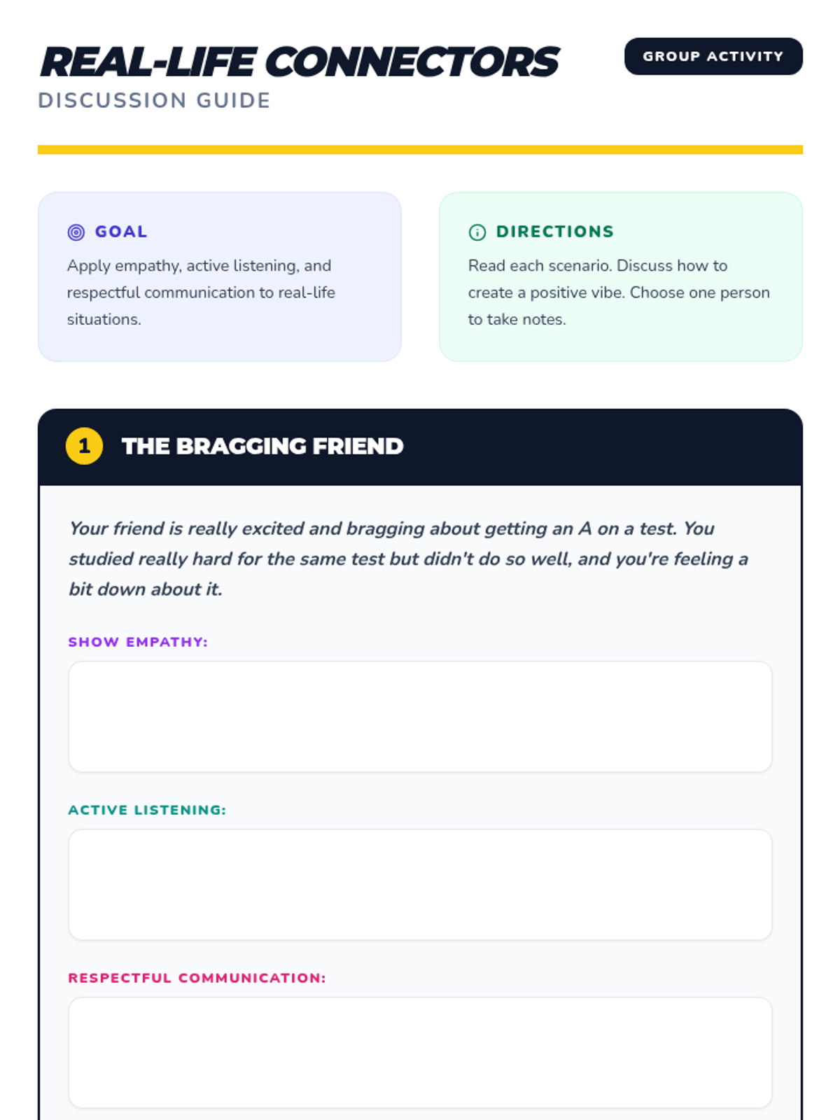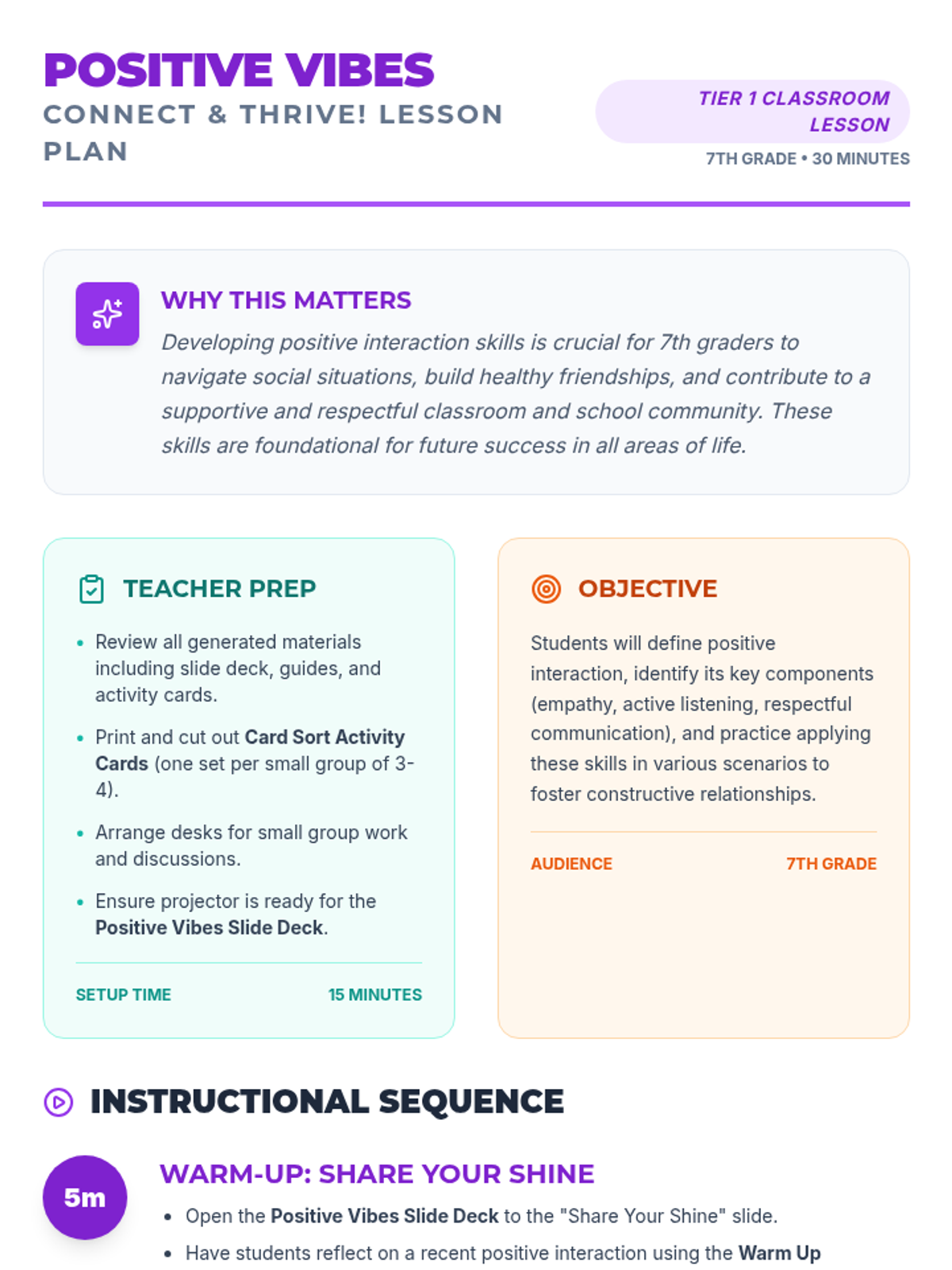A 30-minute interactive lesson for 7th graders focusing on empathy, active listening, and respectful communication to build positive relationships.