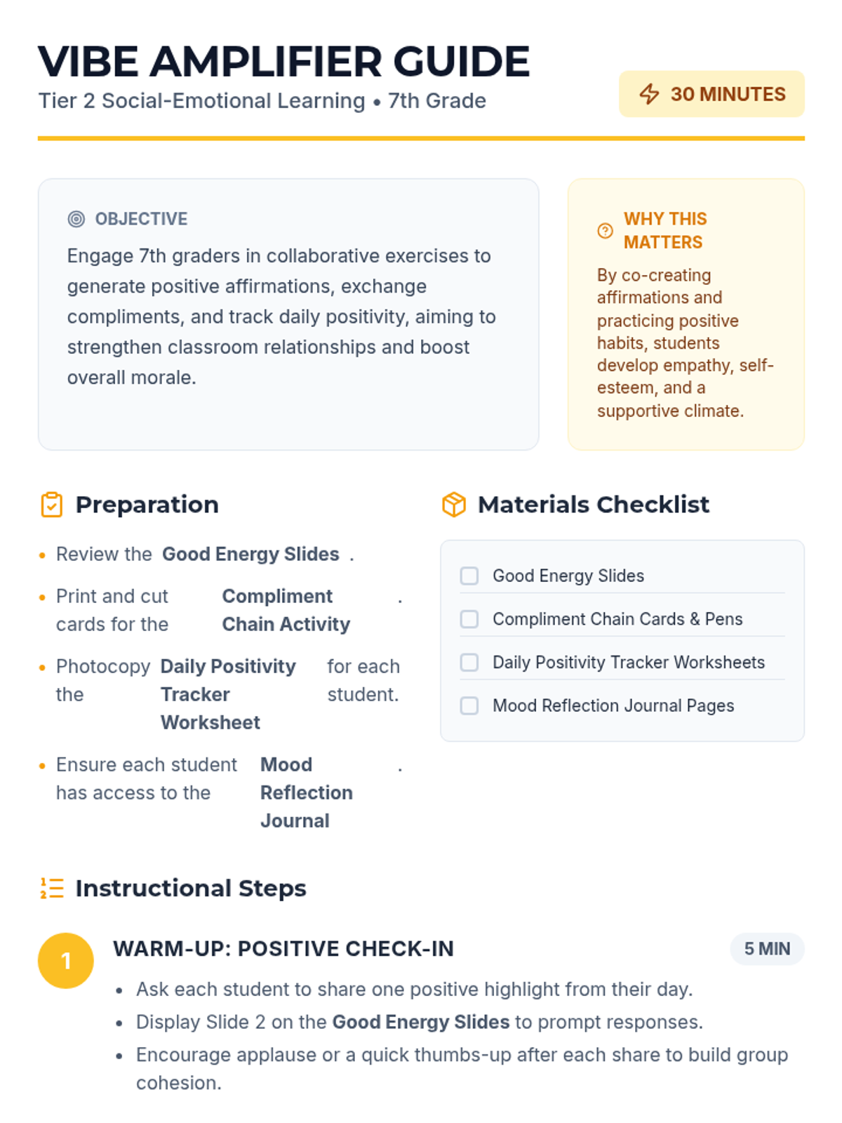 A small-group (Tier 2) lesson focused on co-creating affirmations and practicing positive habits to boost classroom morale and strengthen peer relationships for 7th graders.