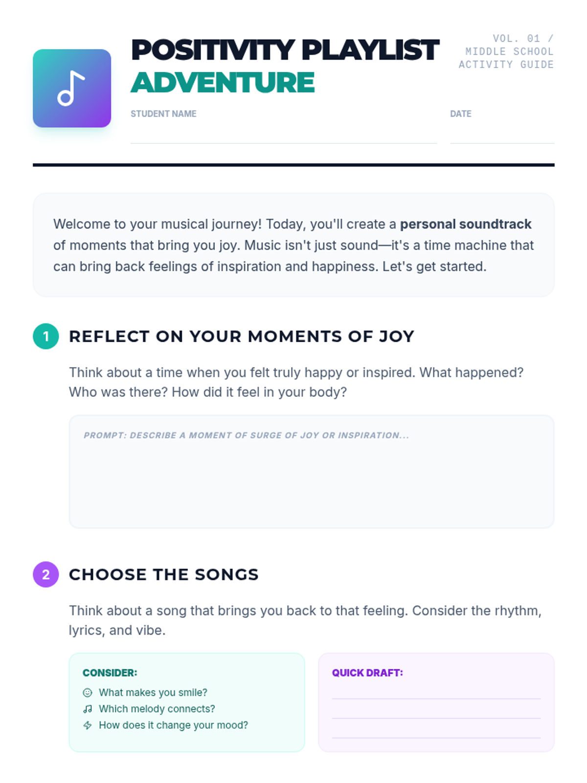 A 45-minute lesson for middle schoolers to explore the emotional impact of music by creating personalized 'positivity playlists' linked to joyful life moments.