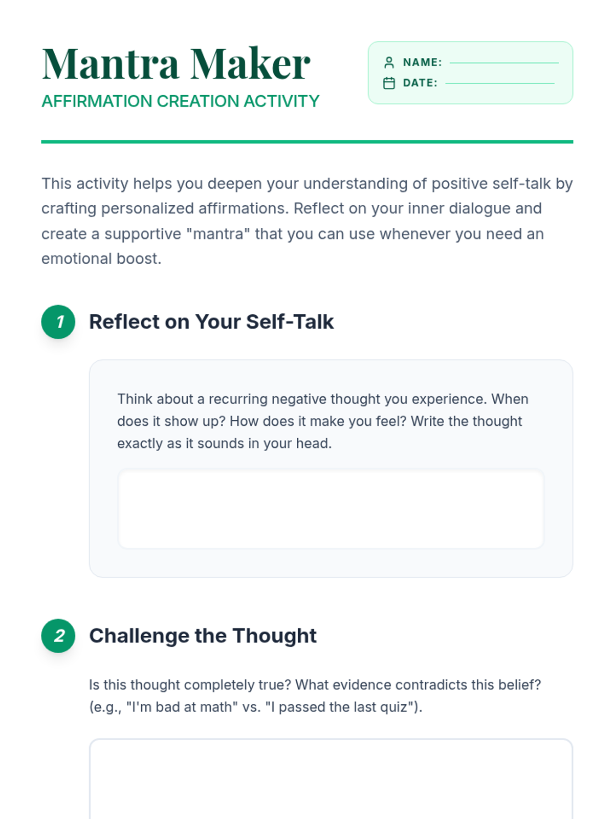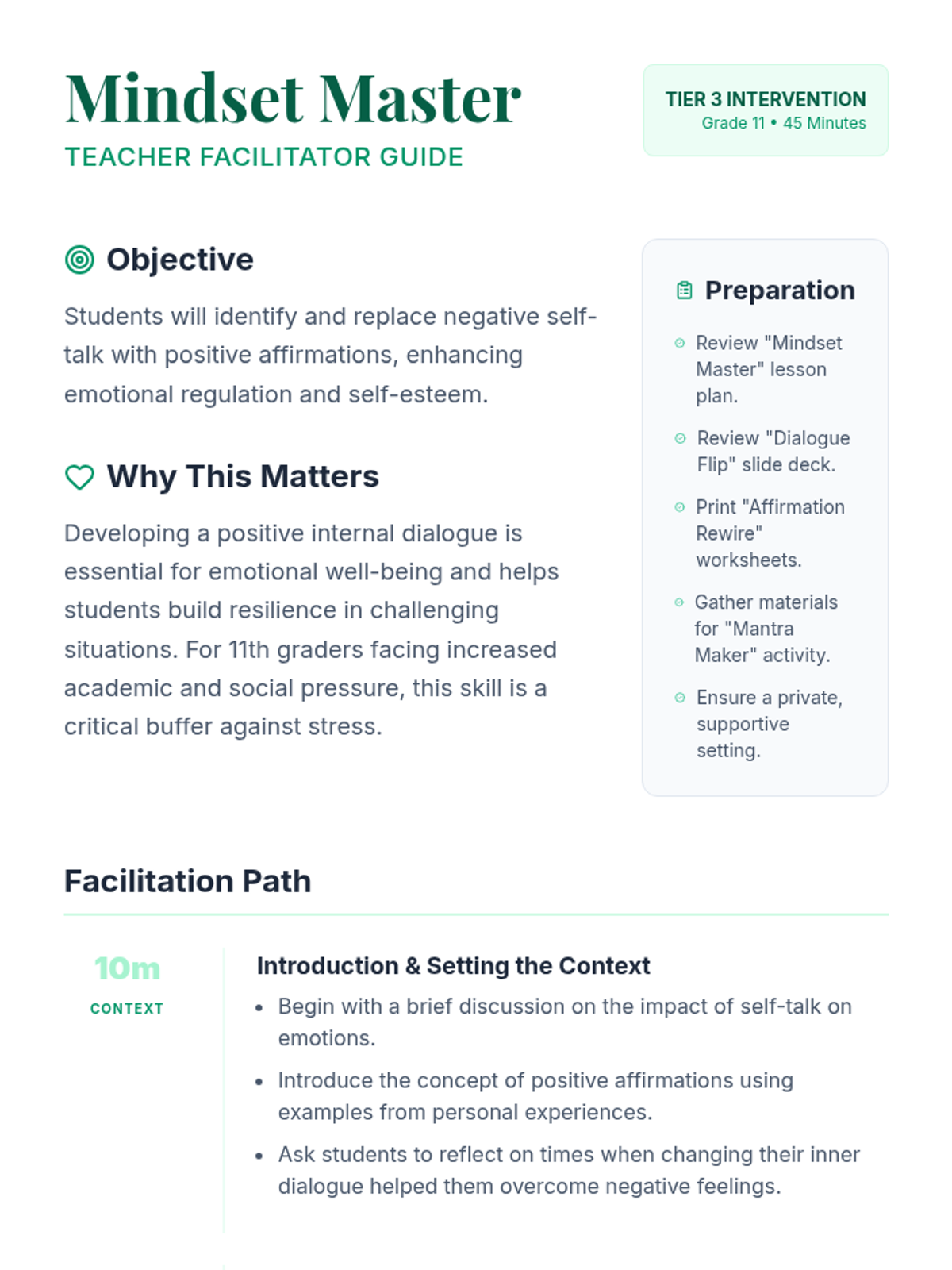 A Tier 3 intervention for 11th-grade students focused on identifying negative self-talk and reframing it into positive affirmations to build emotional resilience.