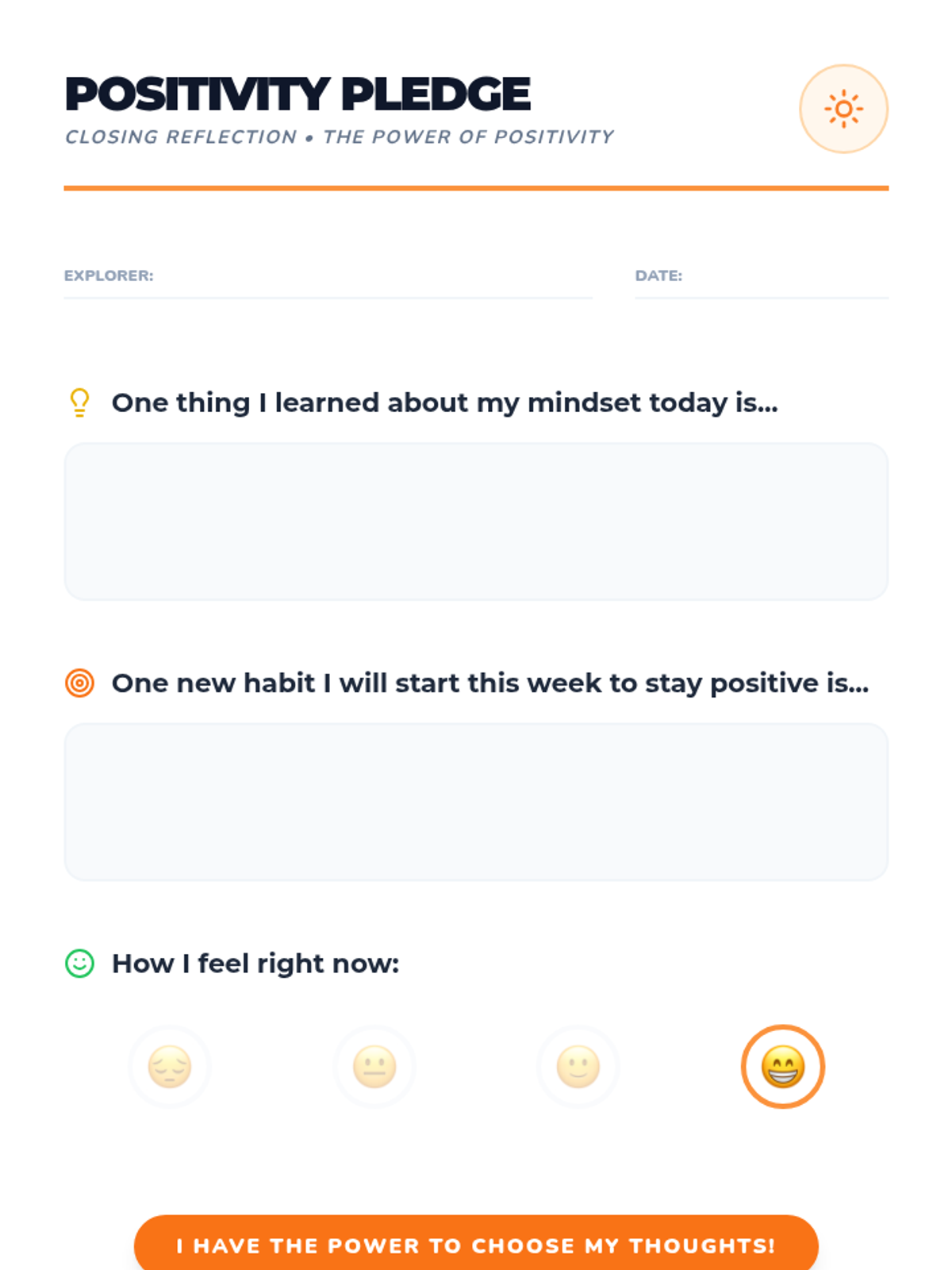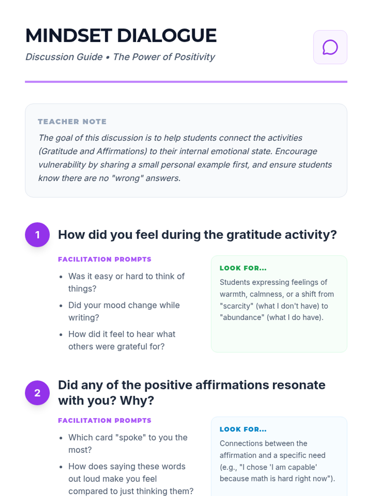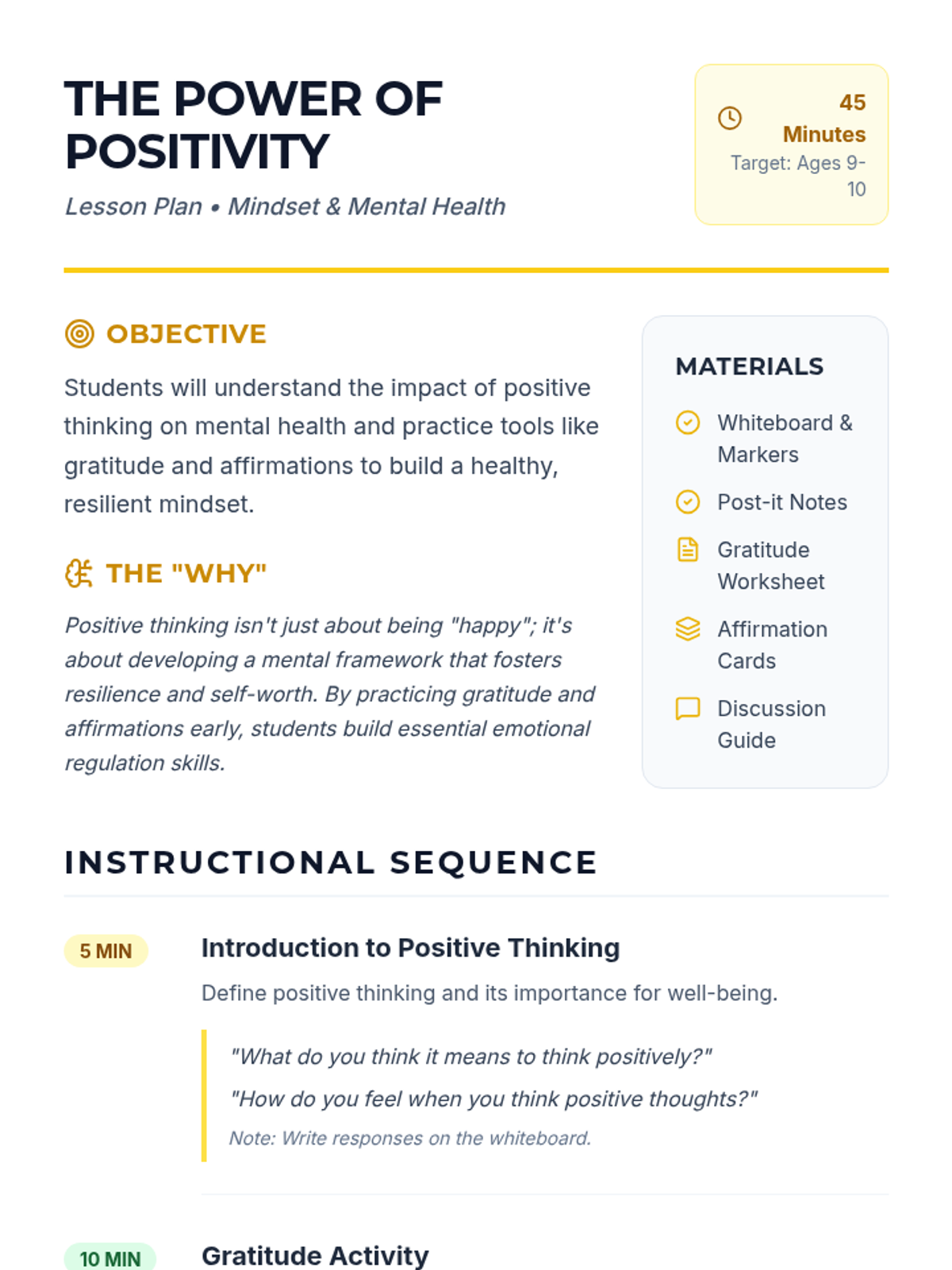A 45-minute lesson for 9-10 year olds focused on the impact of positive thinking, gratitude, and affirmations on mental health.