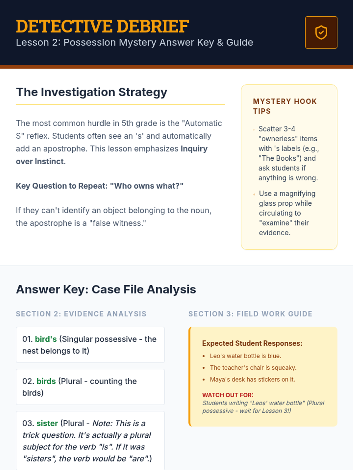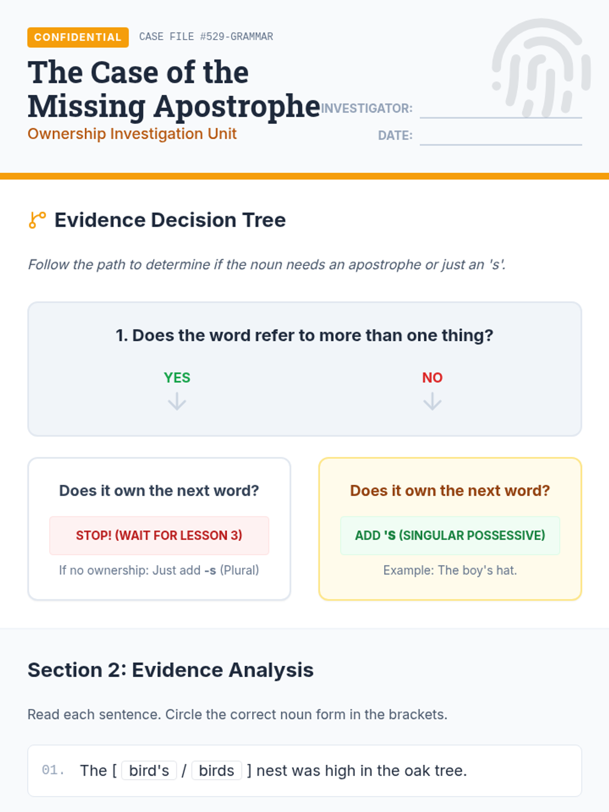 Students differentiate between simple plurals (cats) and singular possessives (cat's). They create decision trees to determine if they are counting items or assigning ownership.
