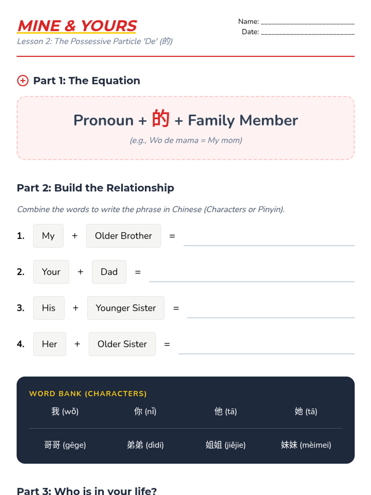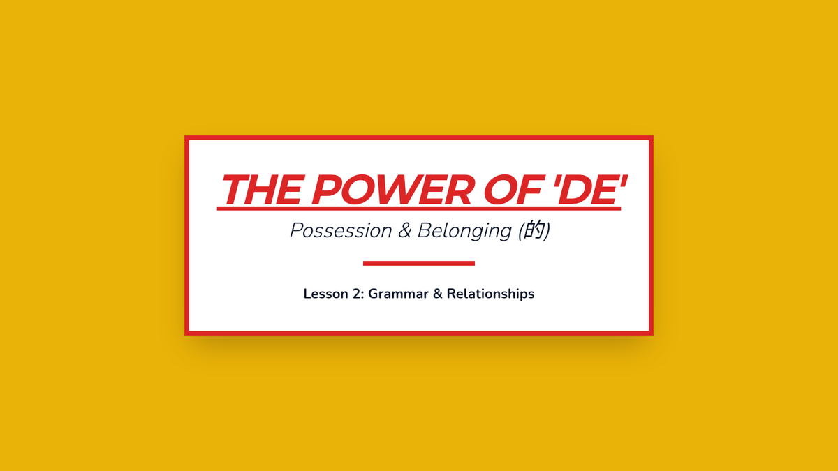 Teaches the use of 'de' (的) for possession and how to combine it with pronouns to describe relationships.