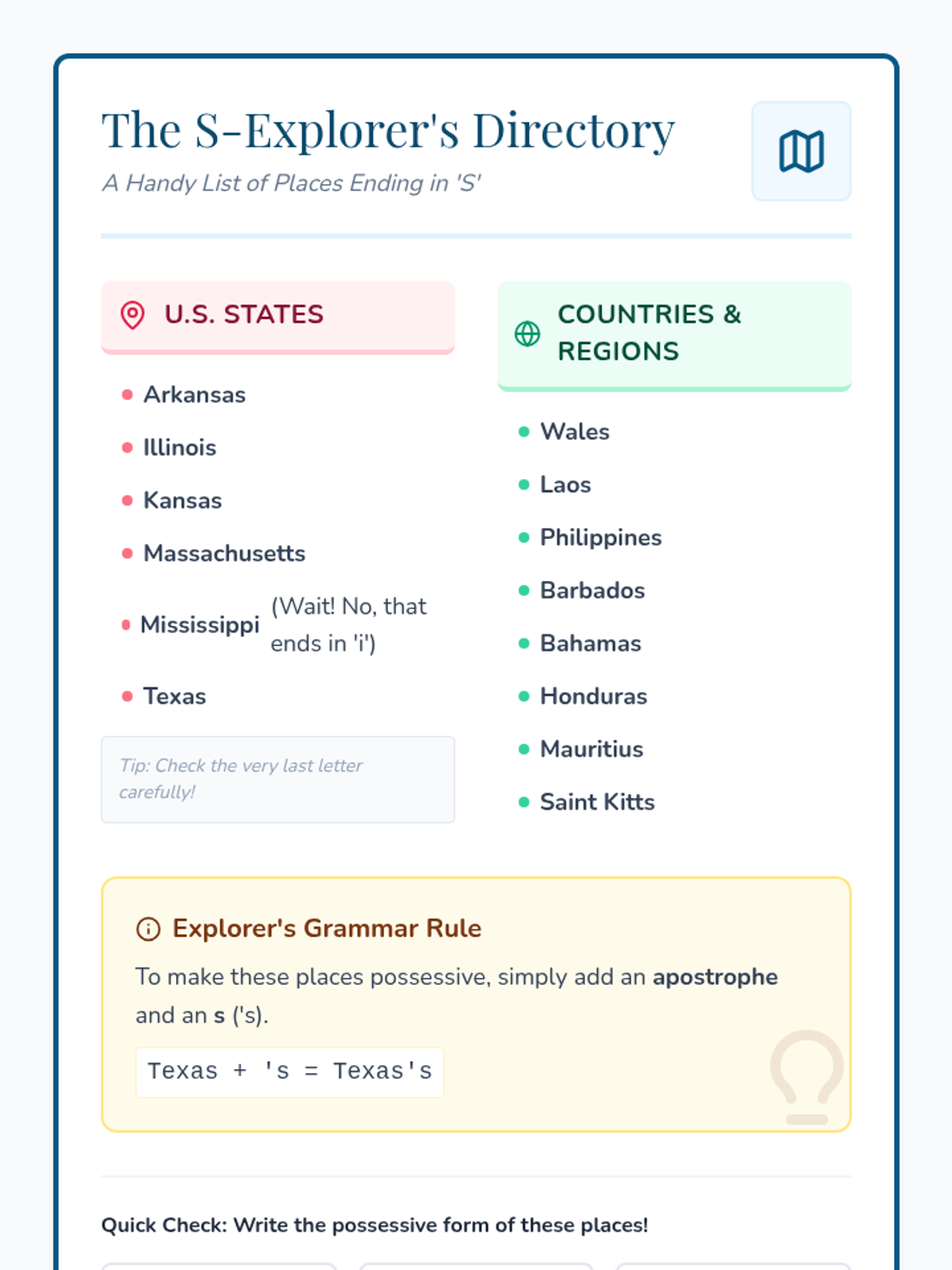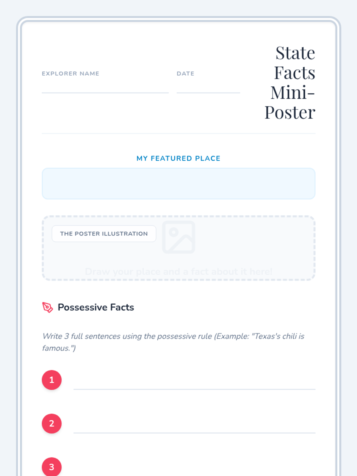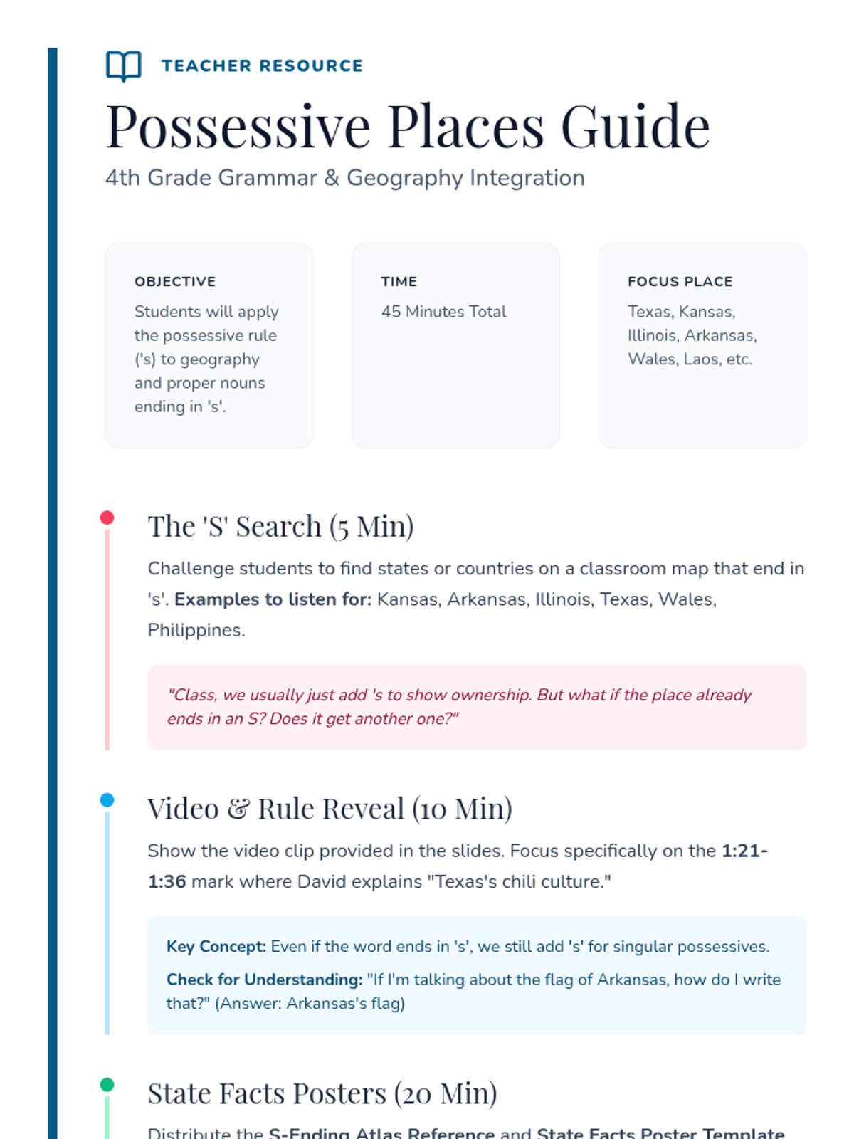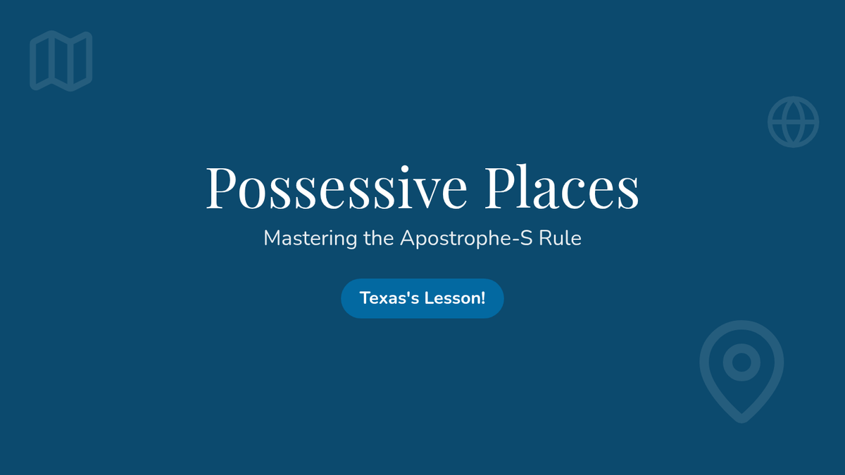 Students learn how to apply the possessive apostrophe rule to proper nouns and geography ending in 's' (like Texas or Kansas) through a video-led discussion and a creative mini-poster activity.
